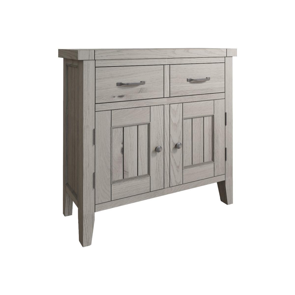 Treat your home to the bold shapes of the Forrest collection. These stylish pieces are made from a unique mix of durable materials with chunky legs, a solid frame and stunning panelled doors - designed to last you a lifetime. Stack your dinnerware in the beautifully panelled cupboards and store utensils in the two drawers. Constructed with oak, oak veneers, ply, MDF and love. An eye-catching grey oak finish. Panelled doors with pewter-effect knobs. Dovetailed drawers with bar handles