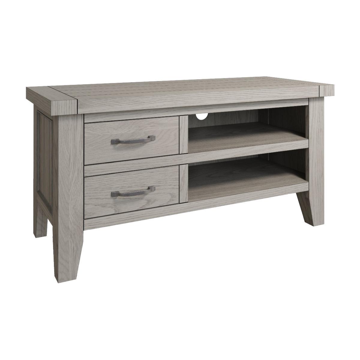 Treat your home to the bold shapes of the Forrest collection. These stylish pieces are made from a unique mix of durable materials with chunky legs, a solid frame and stunning panelled doors - designed to last you a lifetime. Whether you’re a film lover or a sports fanatic, you’ll love watching TV with the Forrest unit. Constructed with oak, oak veneers, ply, MDF and love. An eye-catching grey oak finish. Two drawers with pewter effect bar handles. Chunky legs tapered in a modern style
