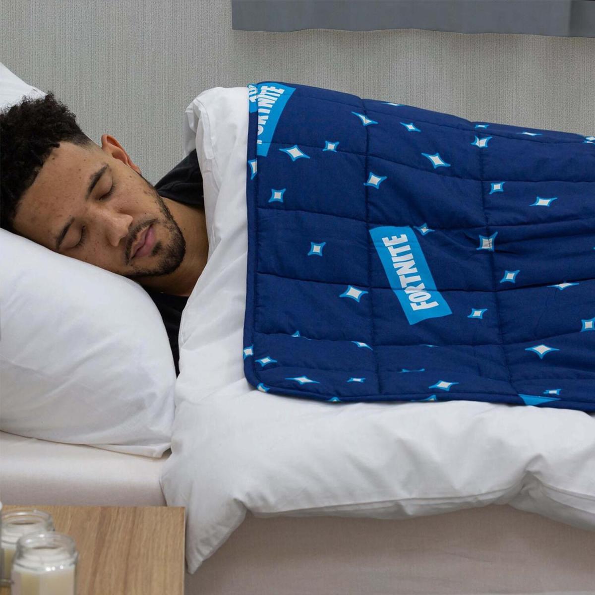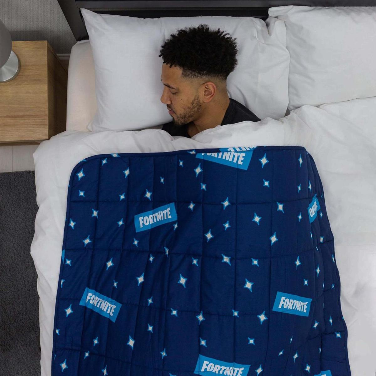 We believe everyone deserves a good night's sleep with this Fortnite inspired weighted blanket. Weighted blankets have been shown to stimulate deep touch pressure just in the same way as when we receive a comforting hug. Whether you are sleeping or napping, relaxing or reading, cosying or cuddling, our weighted blanket will help restore your sense of stillness and calm both day and night. Using revolutionary 'Deep Touch Pressure Stimulation' therapy - known for releasing a sense of serenity and calm - the compact stitched pockets distribute weight evenly across your entire body, creating a calming, snuggle effect. Certified, non-toxic, hypo-allergenic micro glass beads contained within the 5 inch pockets and microfiber cover, makes this blanket healthy, breathable, comfortable and durable, whilst also stimulating the stress points. This Sienna sensory weighted blanket contains several loops allowing you to attach a cover, for easy care.