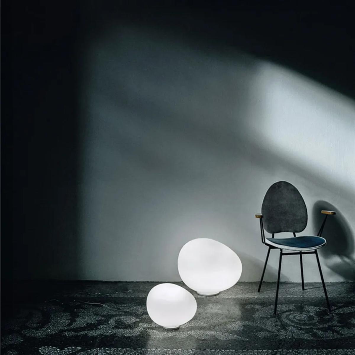 Gregg media table lamp from Foscarini is an elegant table lamp designed by Ludovica and Roberto Palomba, featuring an organic, free form in frosted, free-blown glass that softly diffuses the light. The medium size suits both bedside tables and side tables, creating a warm, inviting atmosphere. The beautiful glass surface and sculptural silhouette make the lamp a decorative interior detail that elevates the room, working either on its own or grouped with the other sizes.