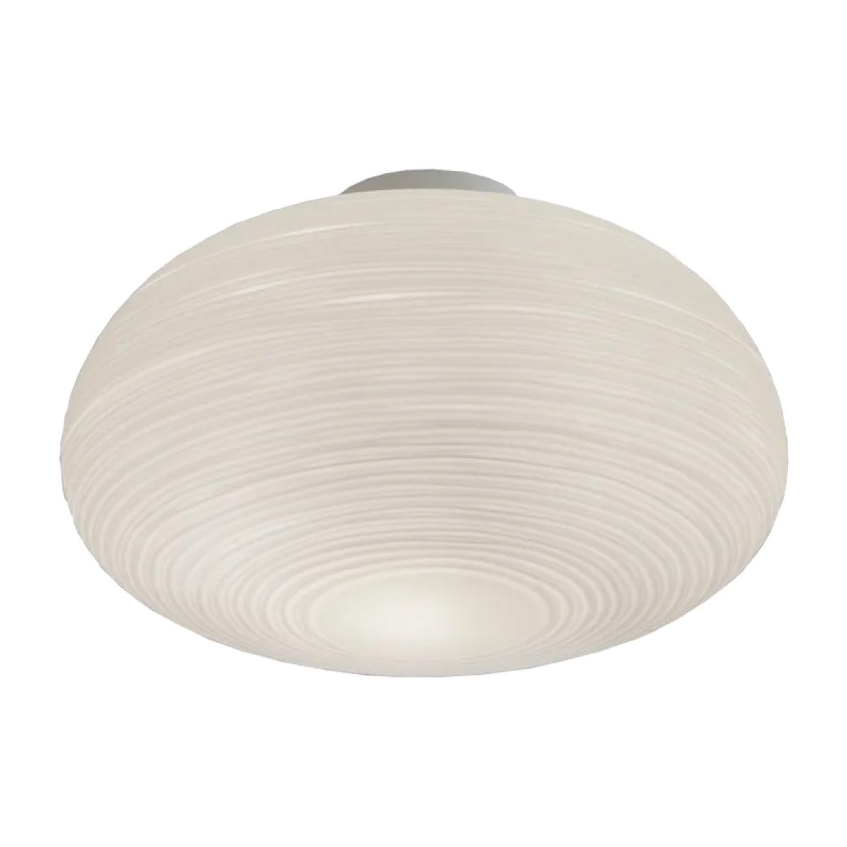 Rituals ceiling light from Foscarini is an elegant ceiling fixture with a unique striped surface created by repeated negative decoration in mouth-blown glass, designed by Ludovica and Roberto Palomba. The glass shade attains its plaster-like texture through an acid treatment that highlights the pattern and diffuses a soft, pleasant light. The ceiling mount is powder-coated in the same white hue as the lamp for a cohesive look. Perfect for hallways, bedrooms, or living rooms where you want a decorative ceiling lamp that combines artistic design with functional lighting.