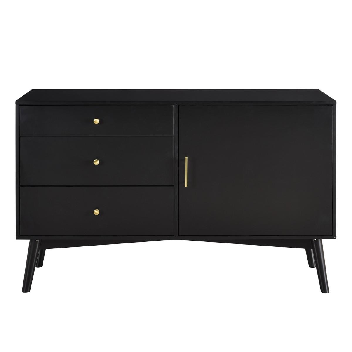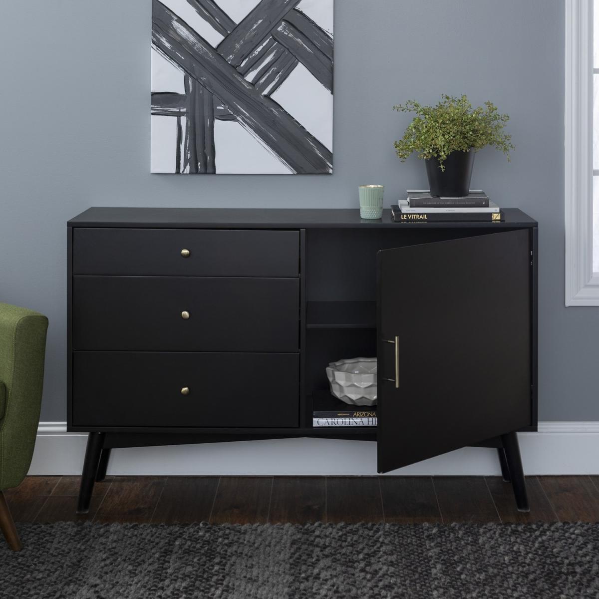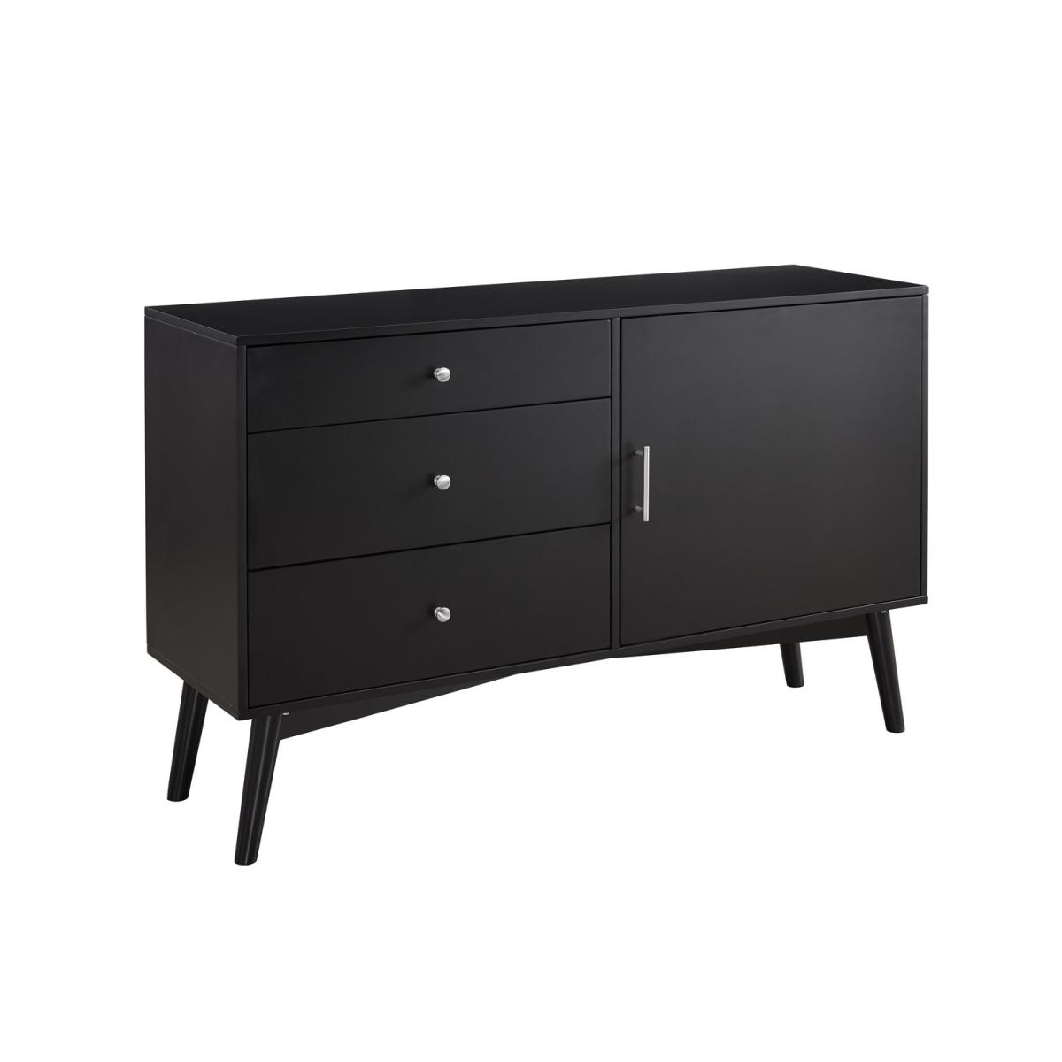 Dimensions H84 x W132 x D41cm. The perfect addition to your home this Foster sideboard helps you to hide away clutter and unsightly essentials. Not only is it convenient but it is also a great looking piece which offers a stylish touch to any room. Crafted from durable MDF this flat panel sideboard features three large drawers a side cabinet with adjustable shelving and a cable management function at the back. Features. Constructed out of high-grade MDF with solid wood veneer. With a long-lasting and durable design. Side cabinet features adjustable shelving to neatly organise your items. Perfect for the living room dining room or hallway. Easy assembly with step-by-step instructions..