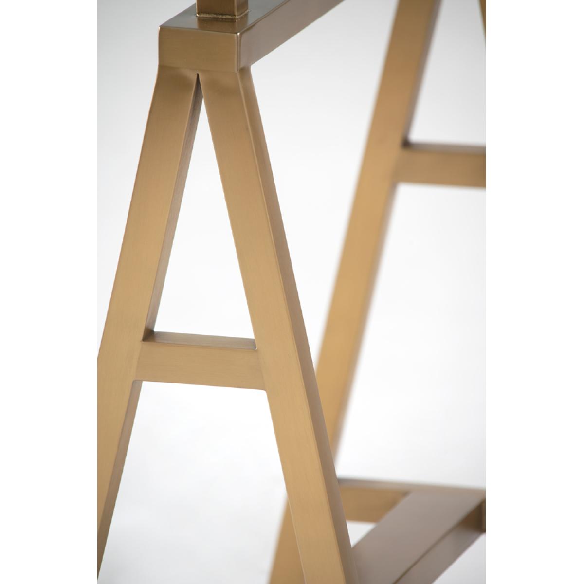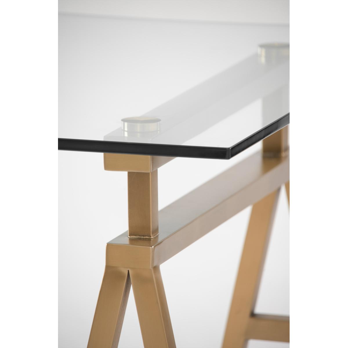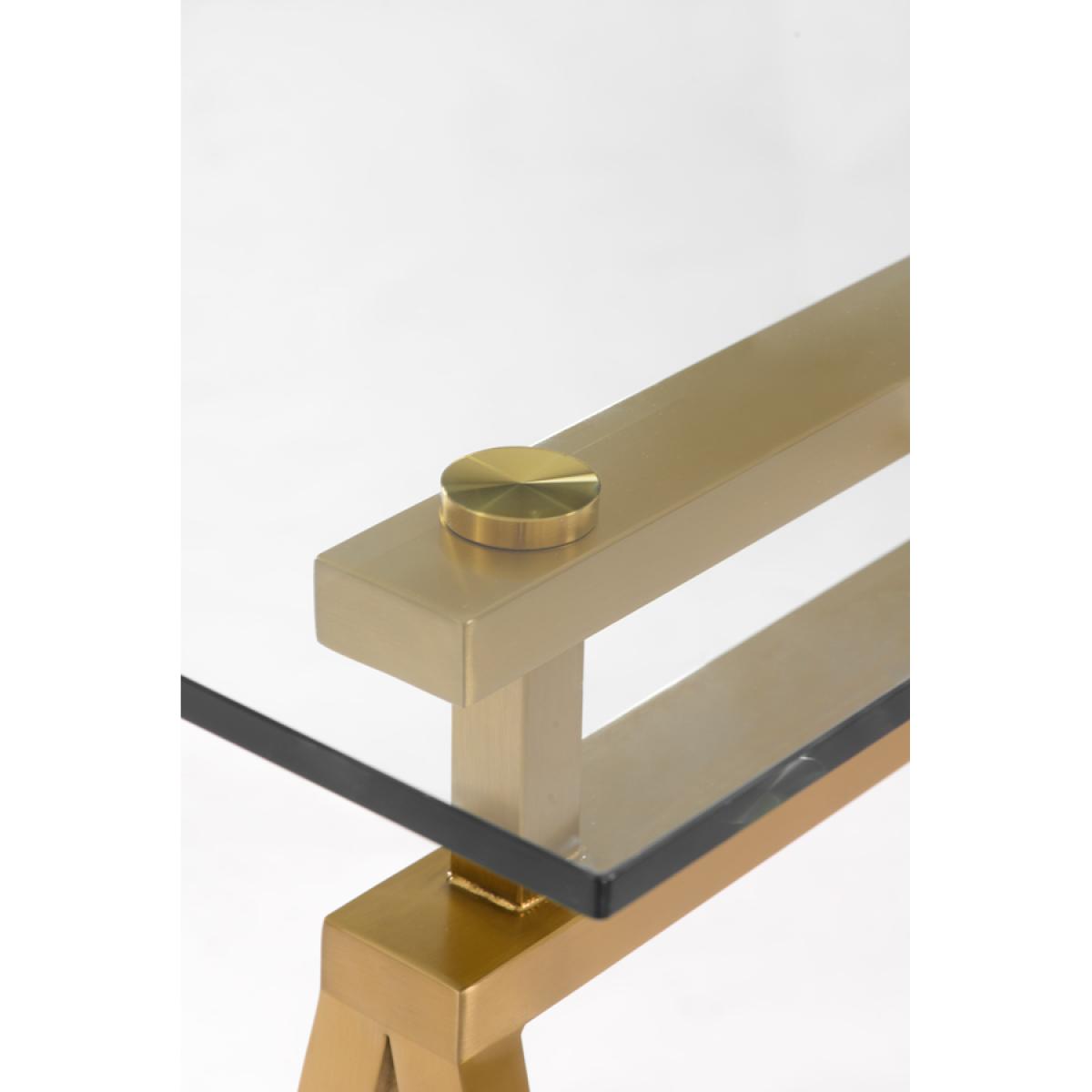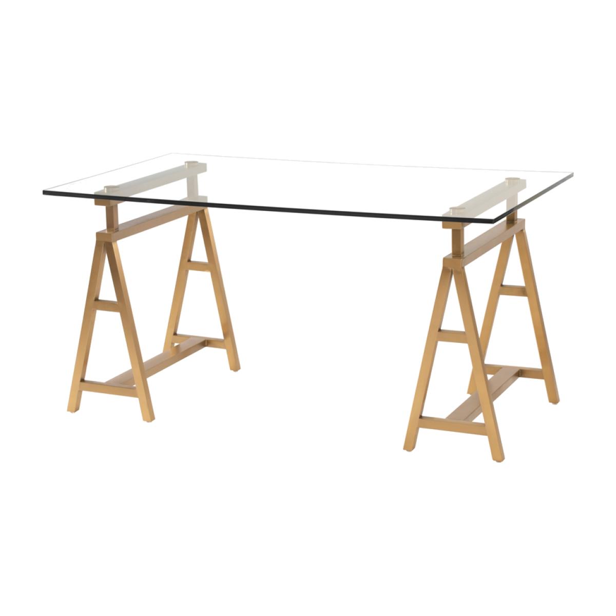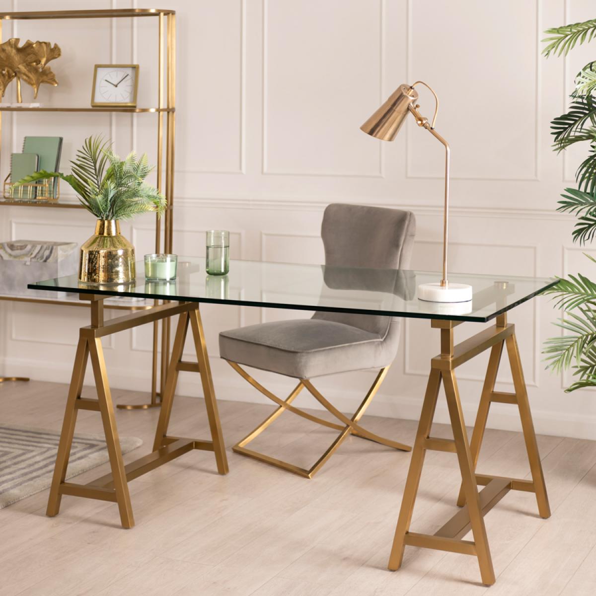 Classic double trestle desk design. Stainless steel frame with brass finish. Toughened safety glass top which securely fixes to the base. Simple two-person assembly required.