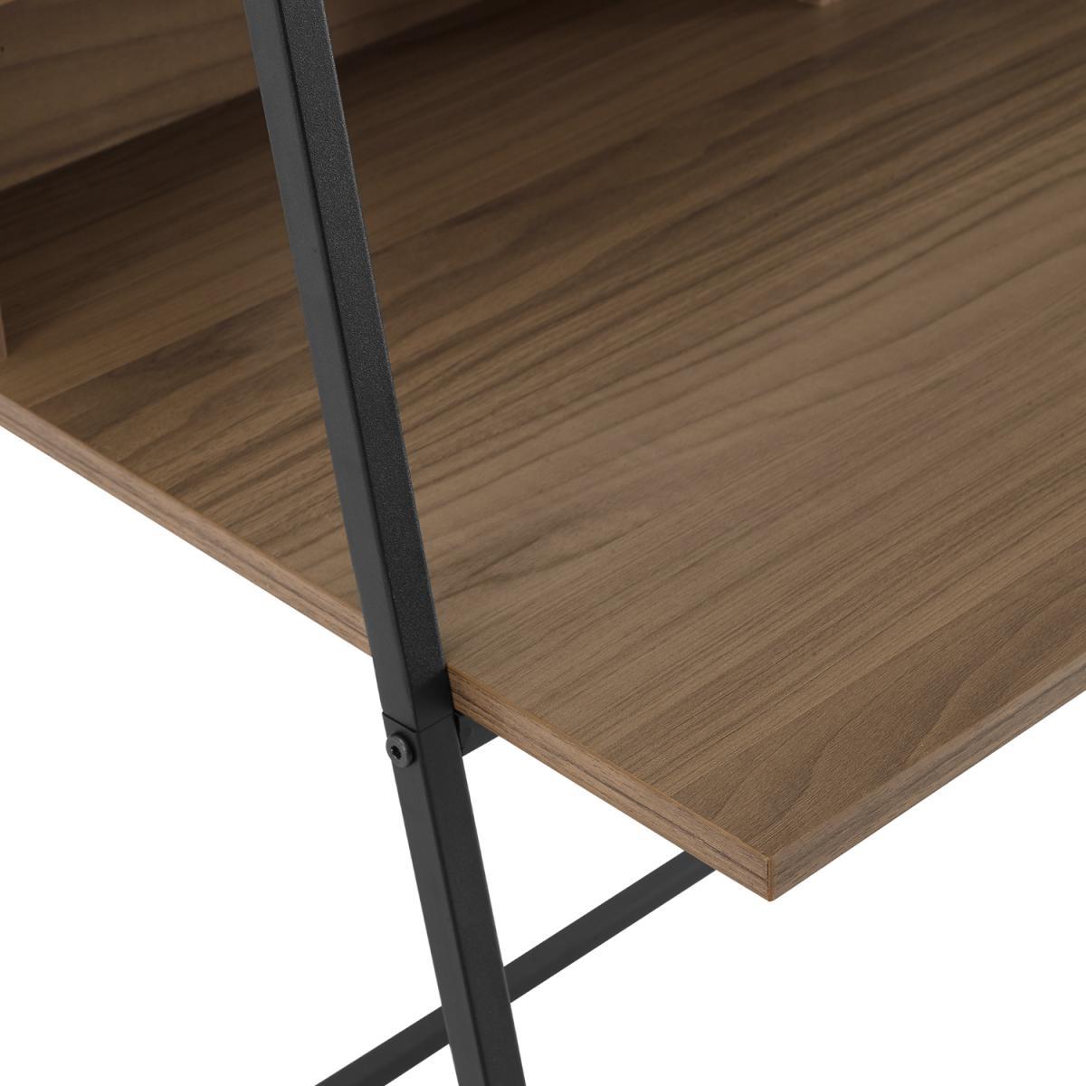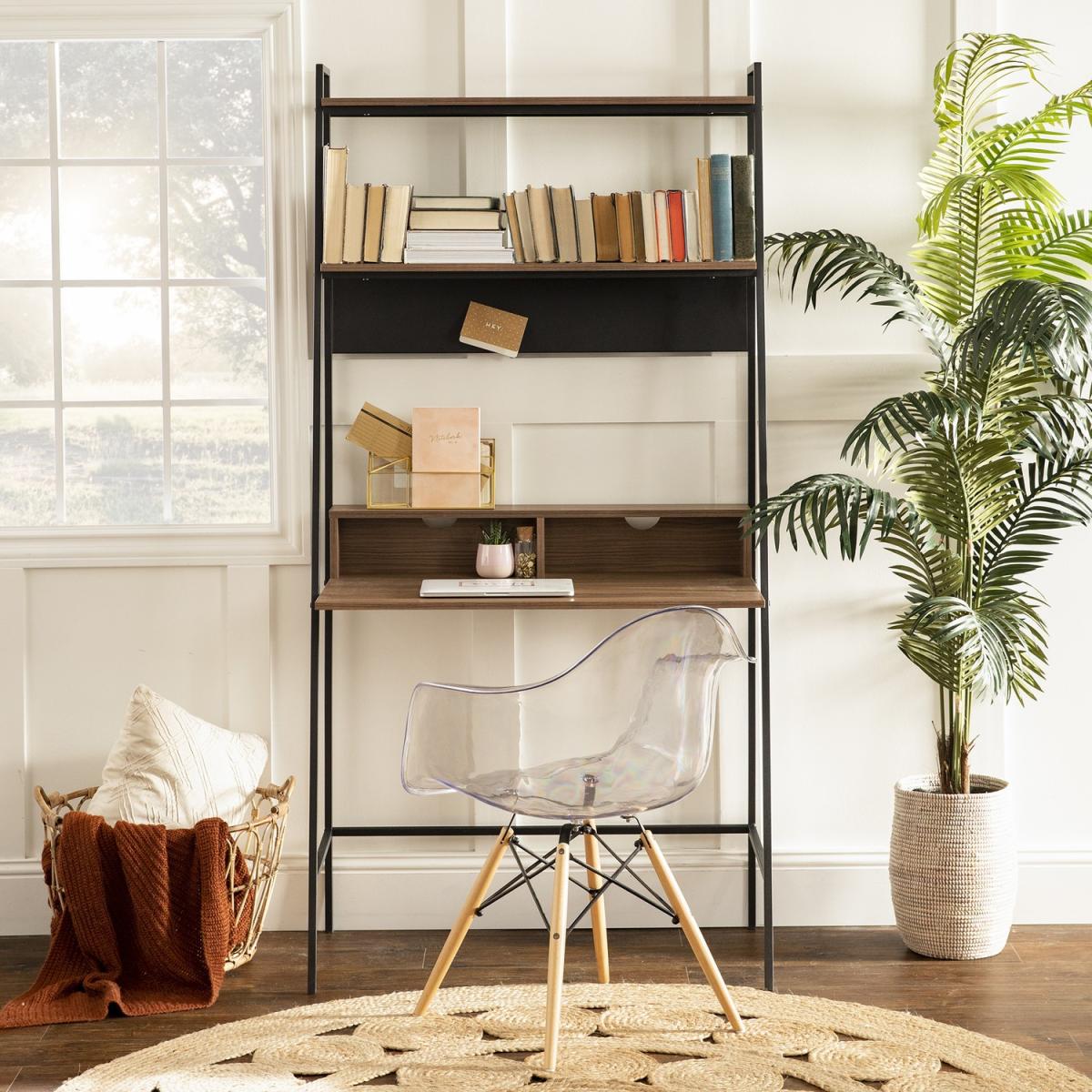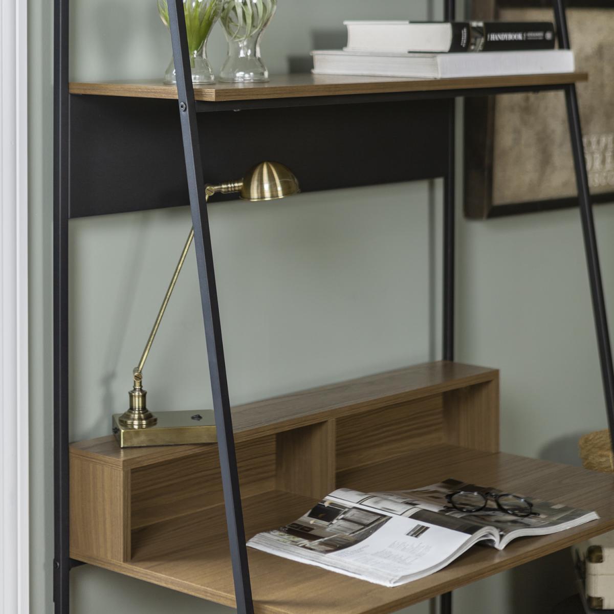 Dimensions. W91 x D51 x H183cm. This mocha coloured office desk with a bookshelf makes a convenient workspace in your home and has all the space you need to keep your work organised. With two open storage space in front of the desk cord management features to organize your electronic wires easily two shelves above for books and a metal magnet board for hanging up your calendar and family pictures. The table and shelves are made from durable laminate with a flattering wood grain appearance and the angled framing is made from metal in a ladder inspired design. This ladder desk makes an urban industrial statement for a stylish addition to your home. Features. With a unique design for a versatile piece in your home Use as a desk for your computer and storing your books and work supplies on the shelves. Helps your work essentials stay organised with multiple shelves. Made with metal framing and magnetic board Durable laminate shelving and desk. Colour - Mocha. Step by step instructions Assembly required..
