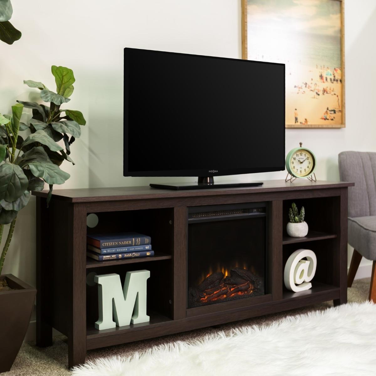 Dimensions H64 x W147 x D41 cm. This TV has a lovely espresso finish giving the piece a rich tradition feel which contrasts perfectly with the modern electric fire insert. The piece has great storage options with two adjustable shelves at each side of the fire insert. Features. Stunning espresso finish. Made from high grade MDF and durable laminate. Comes with an electric fire insert Easy plug in installation of the fire insert – no electrician needed. Multiple storage options. Cable management system. Adjustable shelves. Wood grain effect on the product Assembly required..