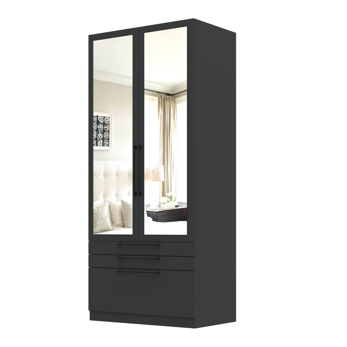 * Spacious double wardrobe * 3 soft-close drawers * Modern bar handles * Options for no mirror/mirror * Available in oak effect or anthracite grey colourways Bring flexible storage to life with this spacious Foster double wardrobe with 3 drawers. Featuring a choice of oak effect or dark grey anthracite colourways and options for double or no mirrors, this modern wardrobe has metal bar handles and three full extension soft-close drawers for further storage options. An adjustable shelf and hanging rail means that you can adapt the space to suit your needs, whilst adding effortless contemporary style to your room.