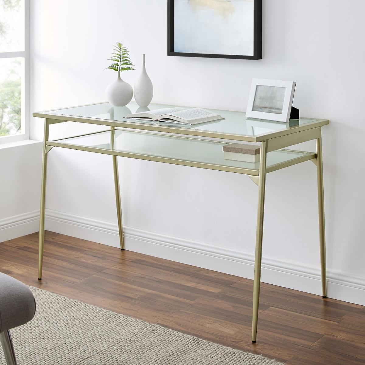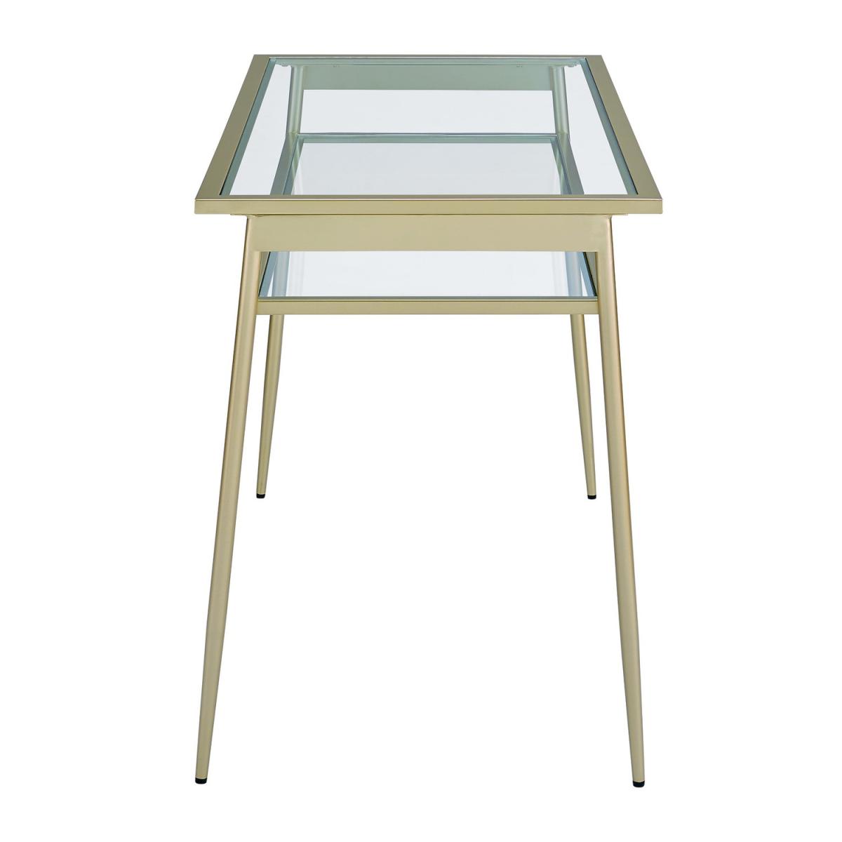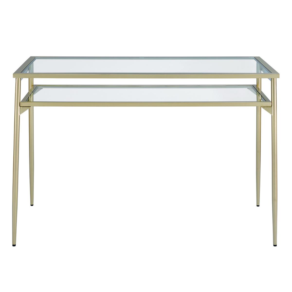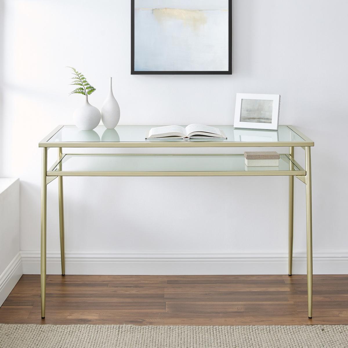 Dimensions H79 x W61 x D122 cm Features. Two-tier glass top writing desk with an open minimal silhouette. The two tempered glass levels act as open storage Capped feet protect floors from scratches. Features sleek tapered legs. Assembly required..