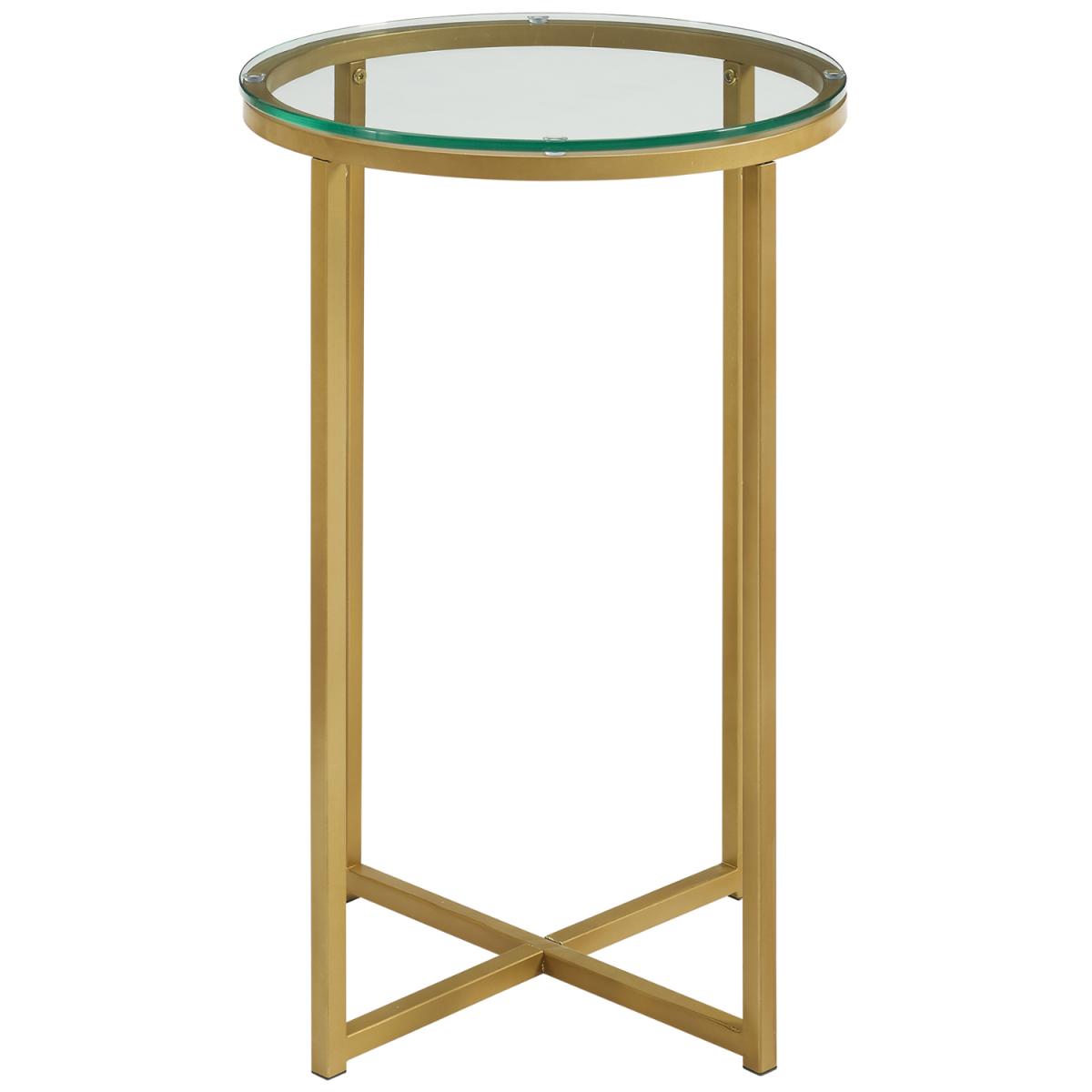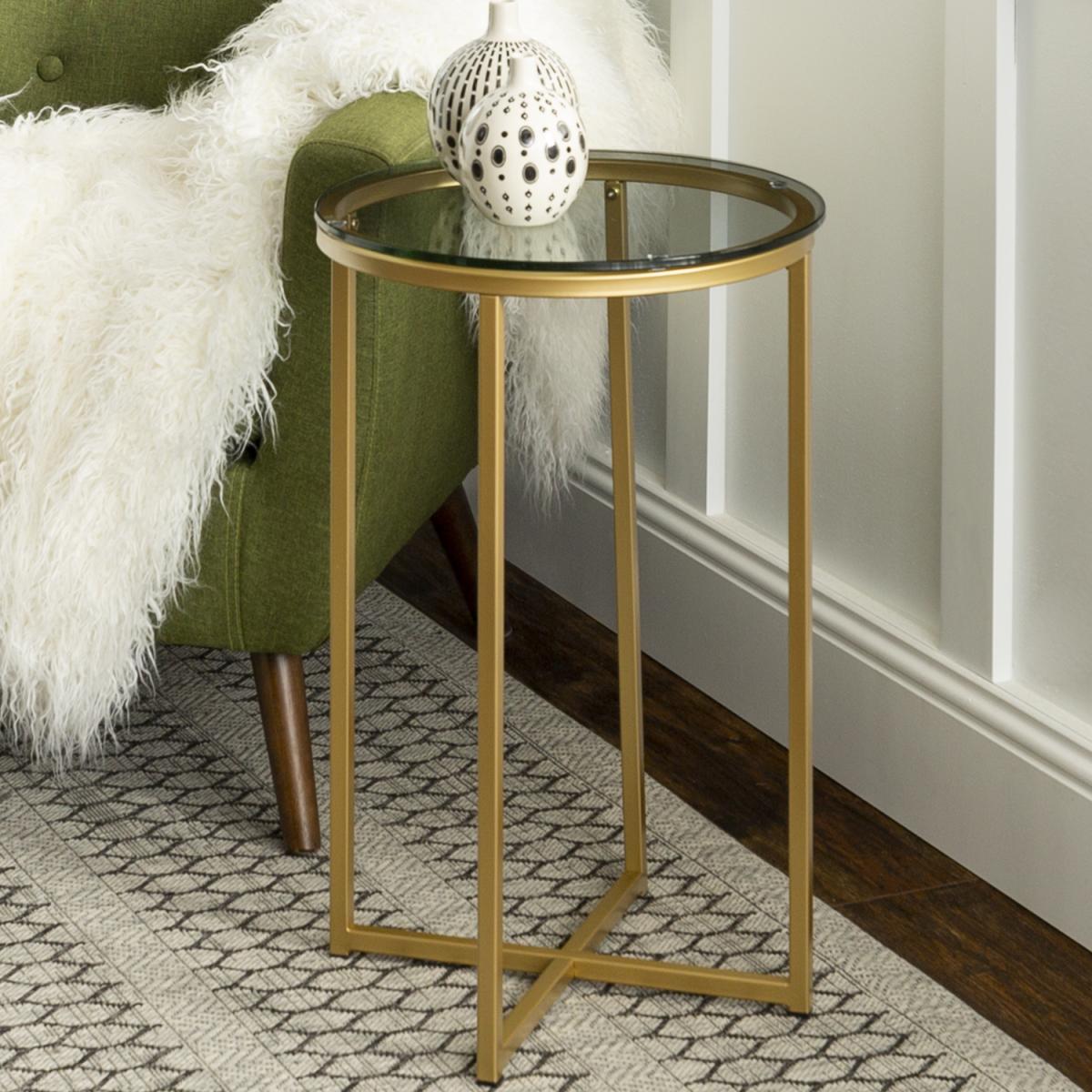 Dimensions H61cm x W41 x D41cm Classy yet convenient this must-have round side table is for sure to add an extra element of elegance to any room in your home. Use as an accent table if you pair it with our matching round coffee table or alone as an end table for your own unique arrangement. Created with a sturdy gold metal frame and tempered safety glass top. This side table will add a chic and glam touch in your home. Features. Sturdy metal frame to hold your reading material a lamp or décor on table top Metal base is painted in a gold colour for a chic statement. Durable tempered glass table top. Mix of modern and glam style to add into your home Ideal to use as a side table in your living room or nightstand in bedroom. Colour – Gold Easy assembly with step-by-step instructions..