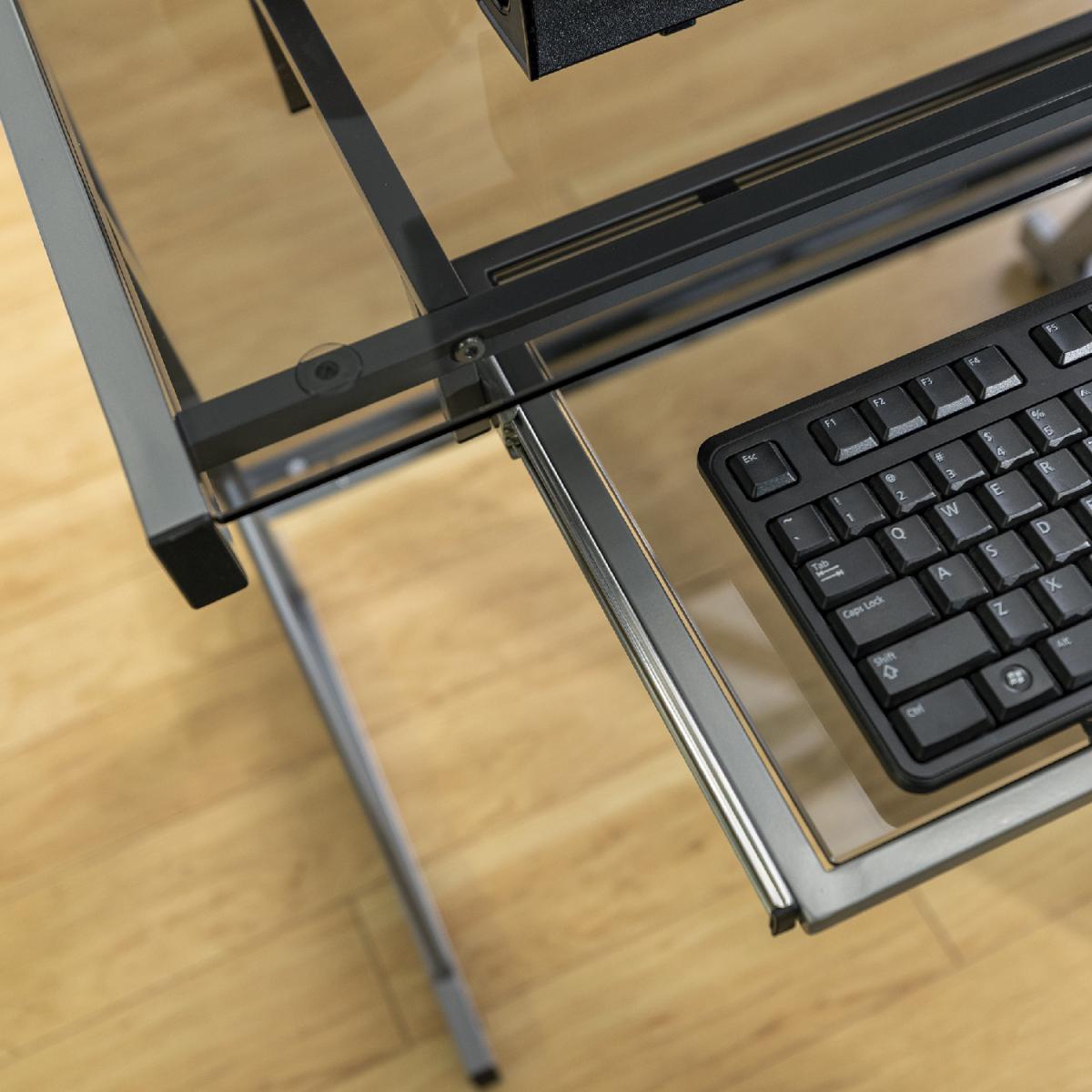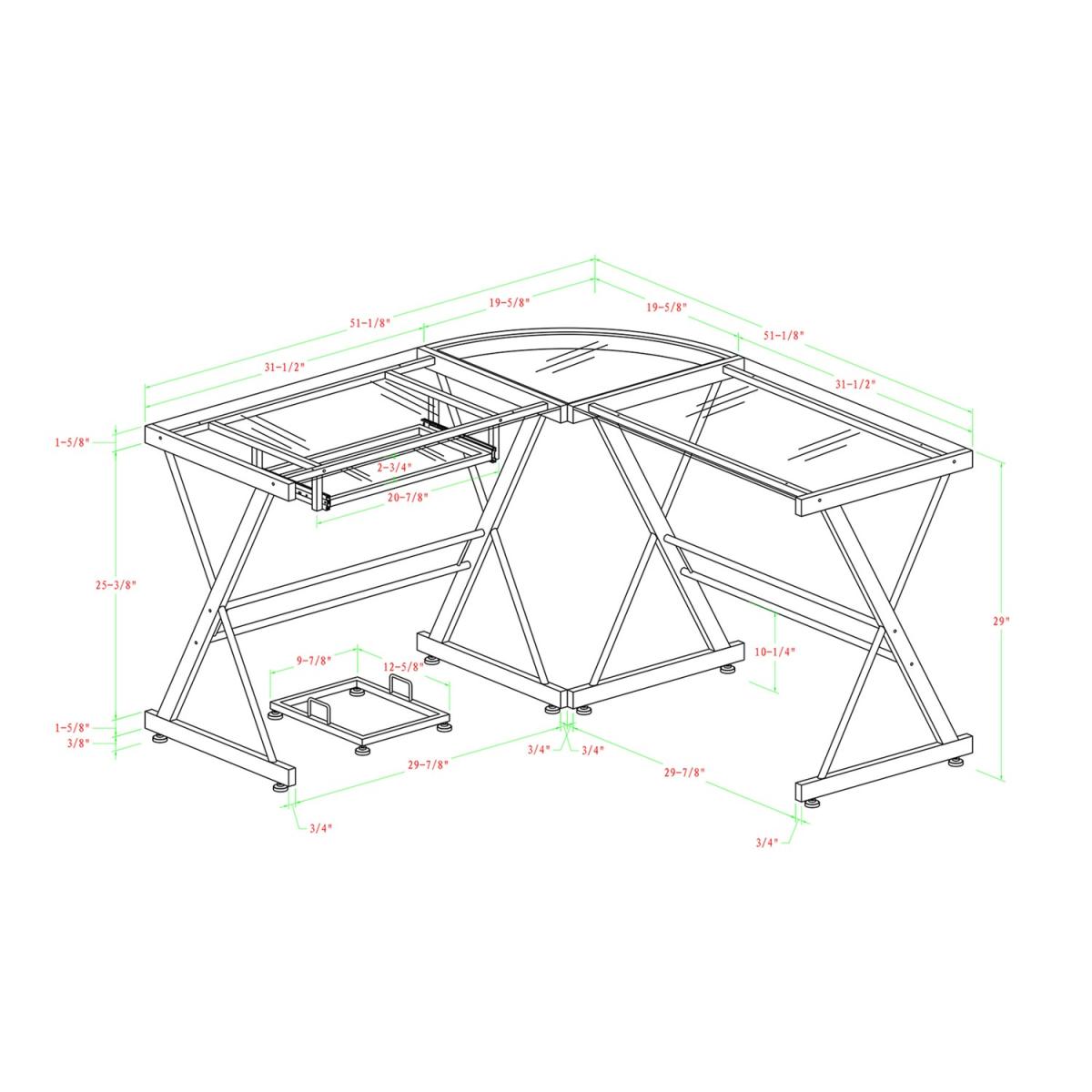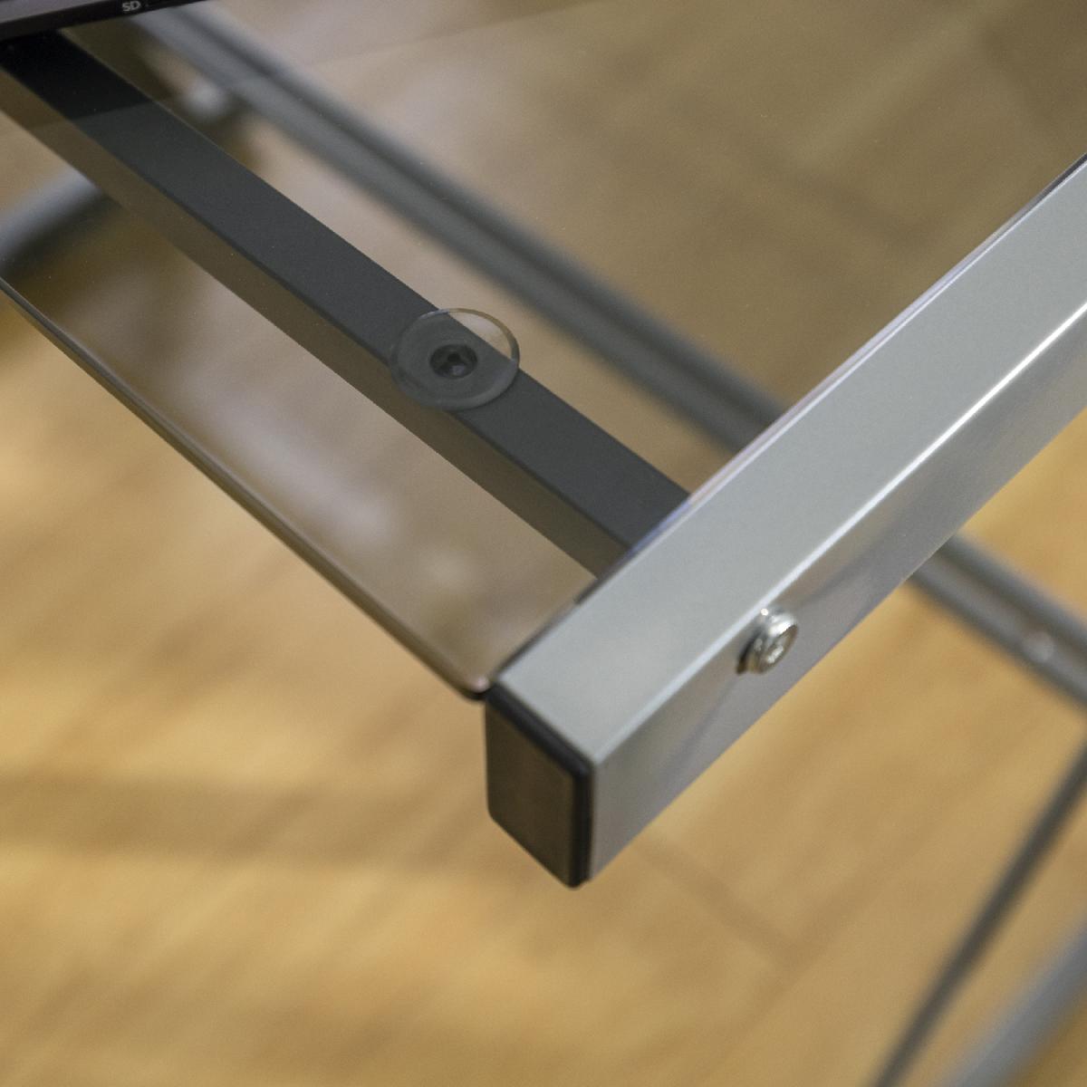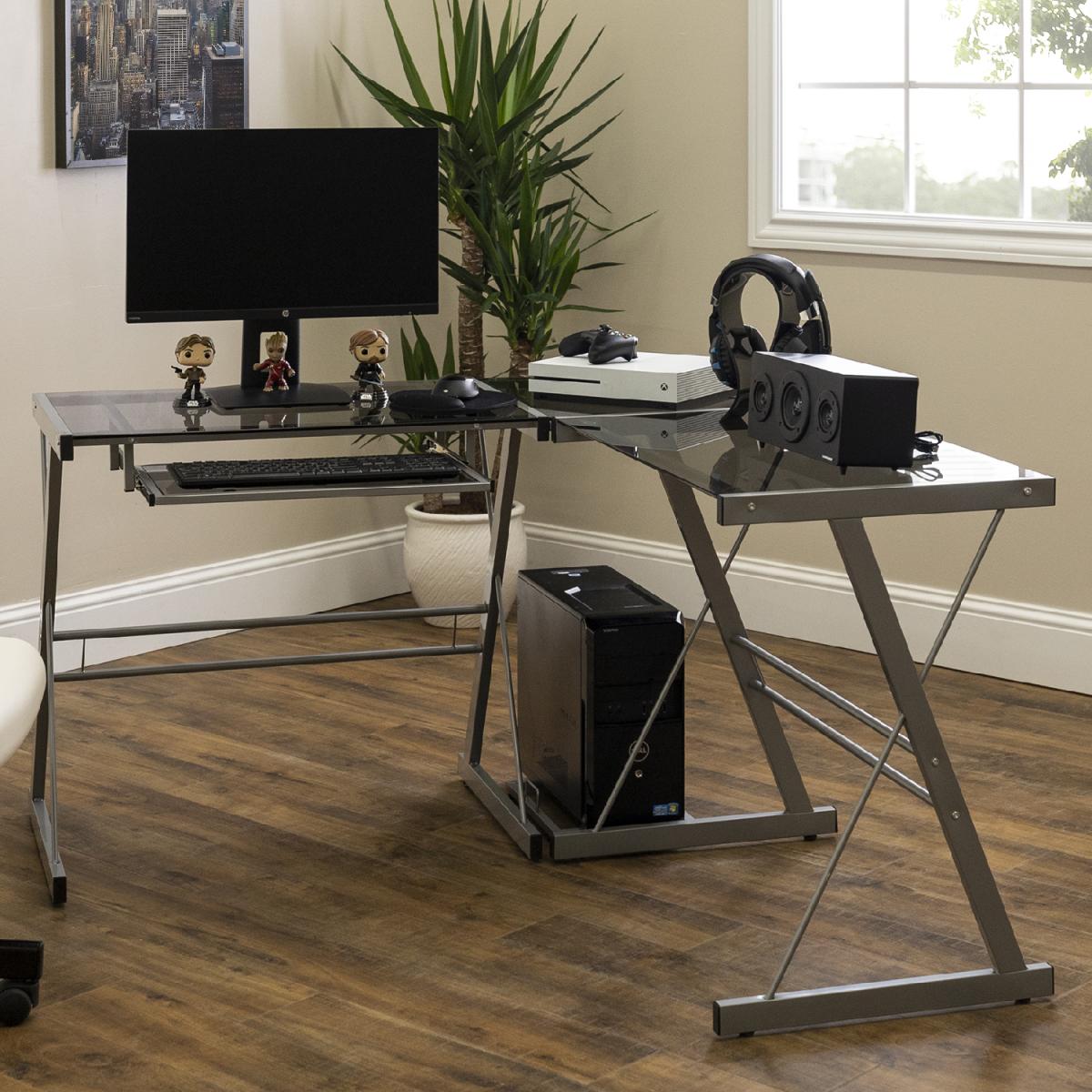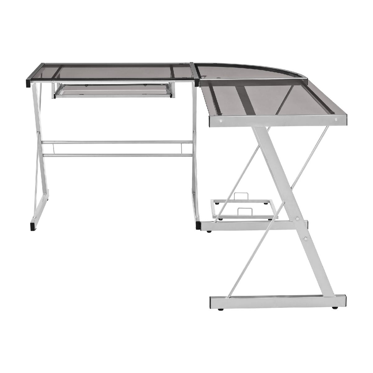 Dimensions H74cm x W130 x D51cm. Update your home office with this modern and sleek corner computer desk. Crafted from durable steel with a powder-coated finish and thick tempered safety glass. The L-shape design provides the perfect fit for space-saving needs and features a sliding keyboard tray and unattached CPU stand. Its flexible configuration allows you to mount the tray on either side of the desk according to your needs. This contemporary L-shaped office desk gives you plenty of table space to place your computer on one side with the other side left for organising your office supplies. Features. With a contemporary and modern design style to coordinate with your home's current décor style. With a polished and bevelled tempered safety glass top. A durable steel metal frame with a powder-coated finish holds up the table top. Includes sliding keyboard tray that can be mounted on either side of the computer desk to fit your needs and a CPU stand. In a versatile design that allows you to separate it into two desks if needed. Step-by-step instructions. Colour - Smoke Assembly required..