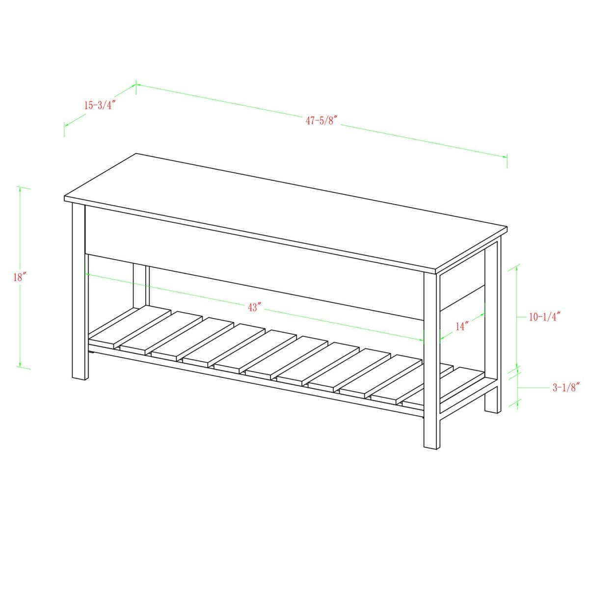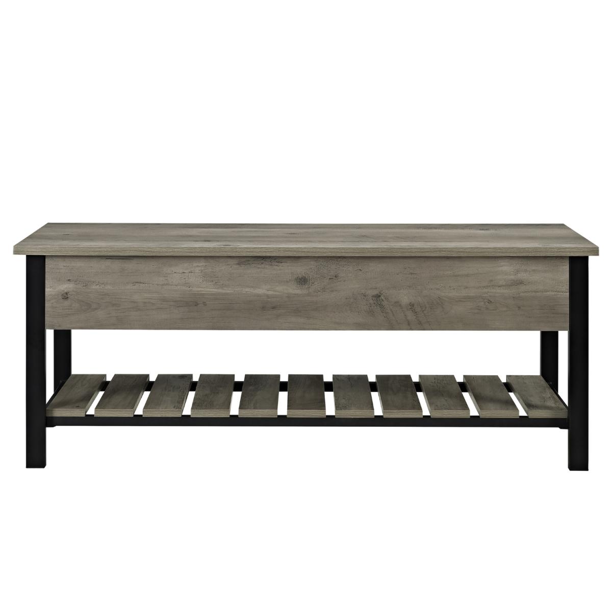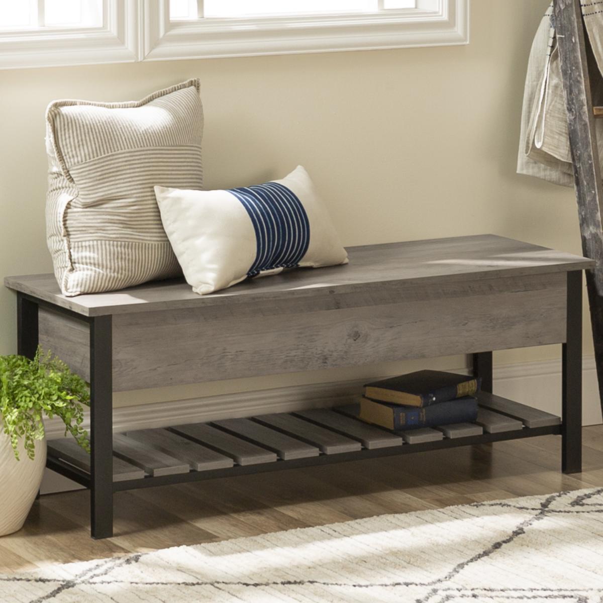 Dimensions H46cm x W122 x D41cm. This hall storage bench is both beautiful and functional providing plenty of storage and a touch of modern farmhouse style for your home's hallway. The natural-looking wood finish made of high-grade MDF and powder coated metal give it a unique rustic design that's sure to complement a variety of home décor. The open top storage space as well as the bottom slatted shelf are the perfect place for your shoes and accessories that you'll need when you're headed out the door. Features. Featuring a bottom shelf for shoes. Having an open top as a wide storage compartment. Unique mix of materials for a rustic modern farmhouse style. Made from high-grade MDF and metal Colour – Grey Wash. Step-by-step instructions Assembly required..