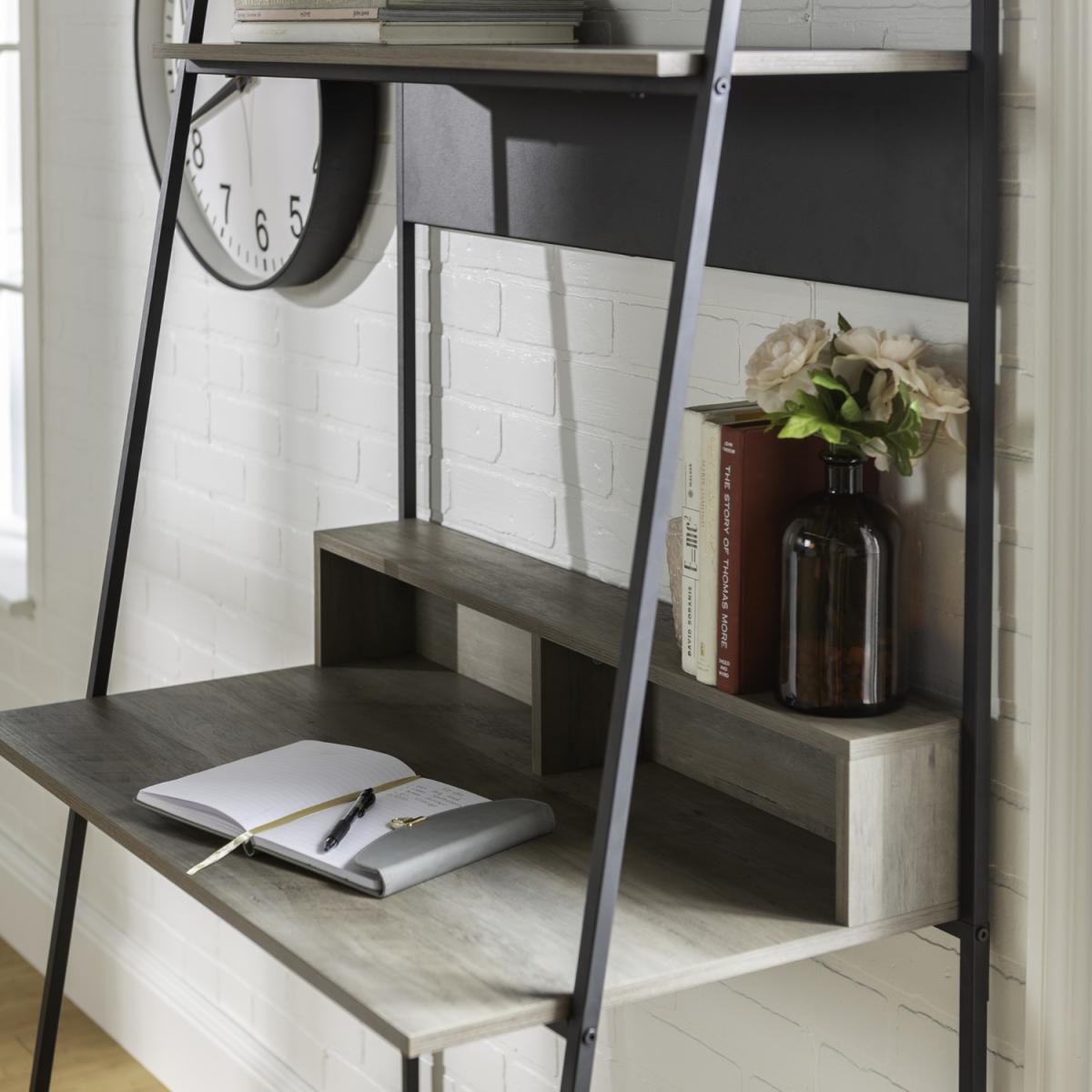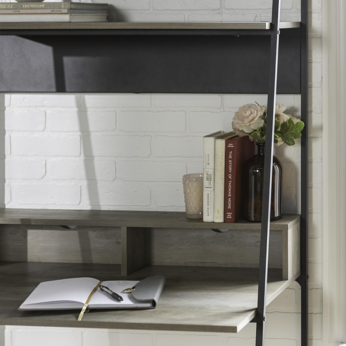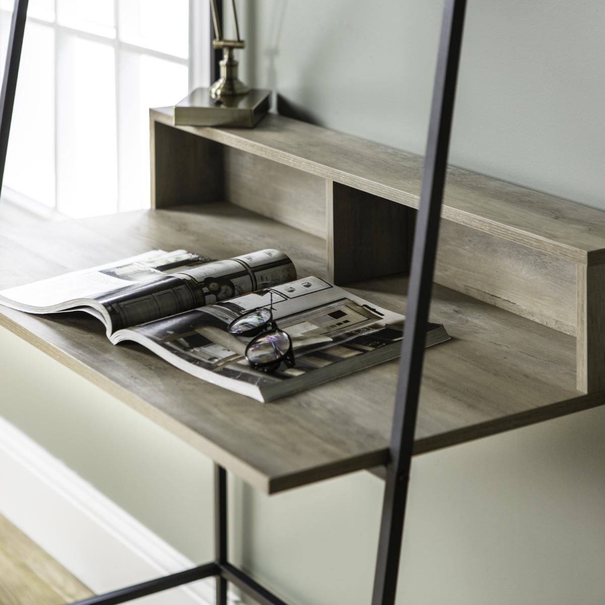 This grey washoffice desk with a bookshelf makes a convenient workspace in your home and has all the space you need to keep your work organised. With two open storage space in front of the desk, cord management features to organize your electronic wires easily, two shelves above for books, and a metal magnet board for hanging up your calendar and family pictures. The table and shelves are made from durable laminate with a flattering, wood grain appearance and the angled framing is made from metal in a ladder inspired design. This office desk makes an urban industrial statement, for a stylish addition to your home.