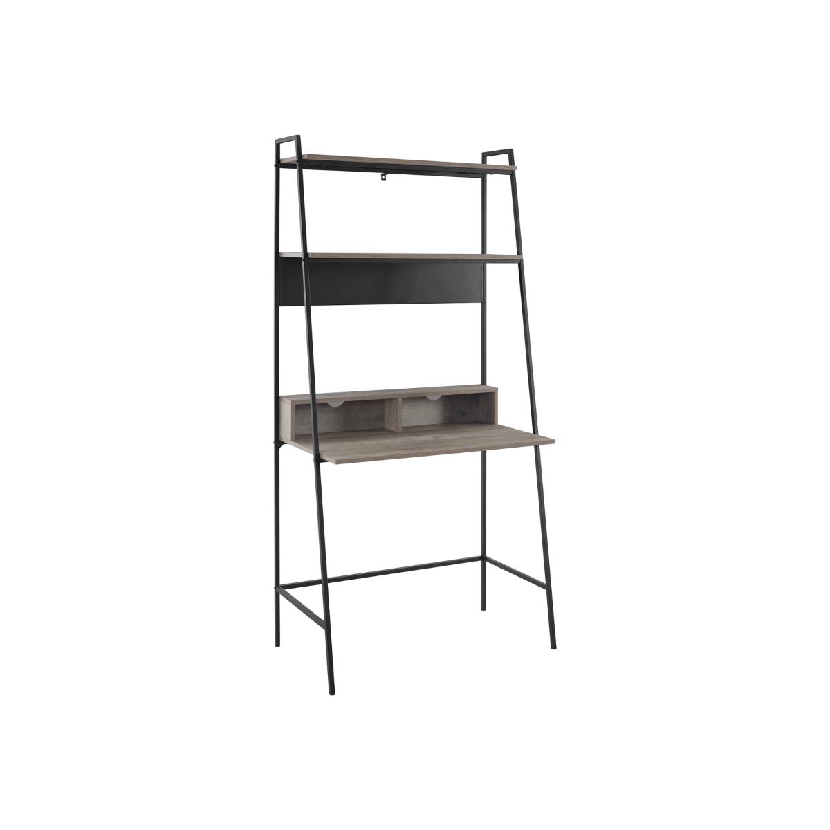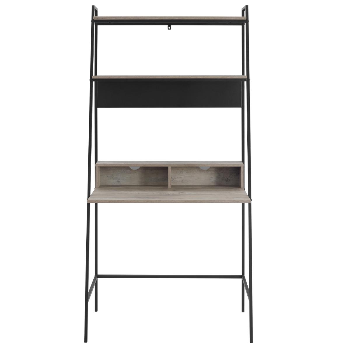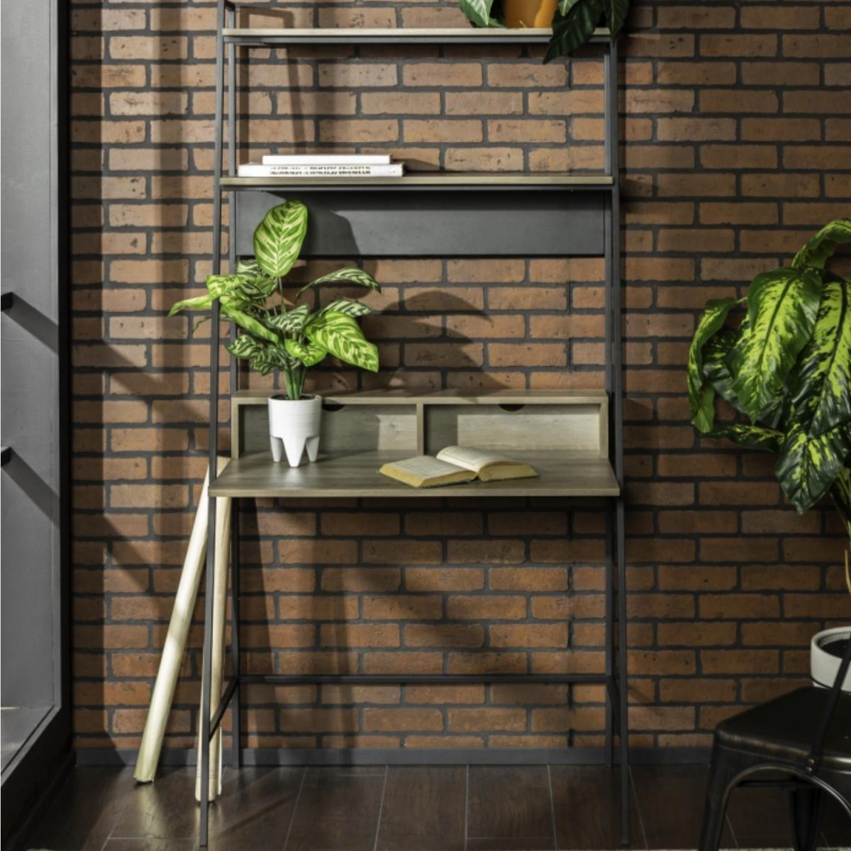 This grey washoffice desk with a bookshelf makes a convenient workspace in your home and has all the space you need to keep your work organised. With two open storage space in front of the desk, cord management features to organize your electronic wires easily, two shelves above for books, and a metal magnet board for hanging up your calendar and family pictures. The table and shelves are made from durable laminate with a flattering, wood grain appearance and the angled framing is made from metal in a ladder inspired design. This office desk makes an urban industrial statement, for a stylish addition to your home.