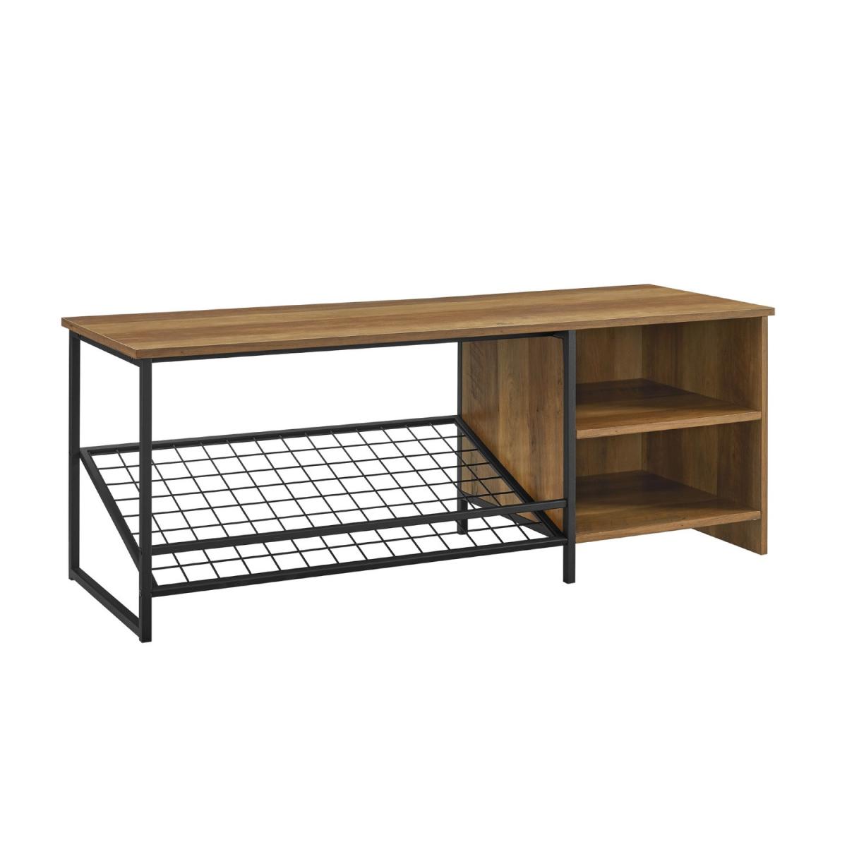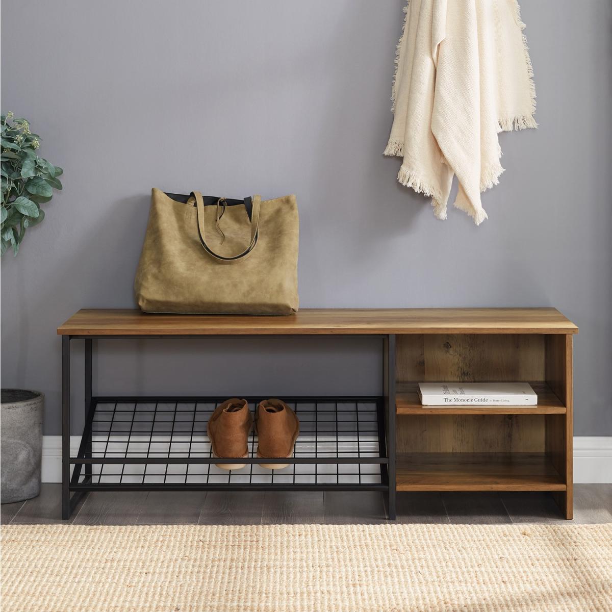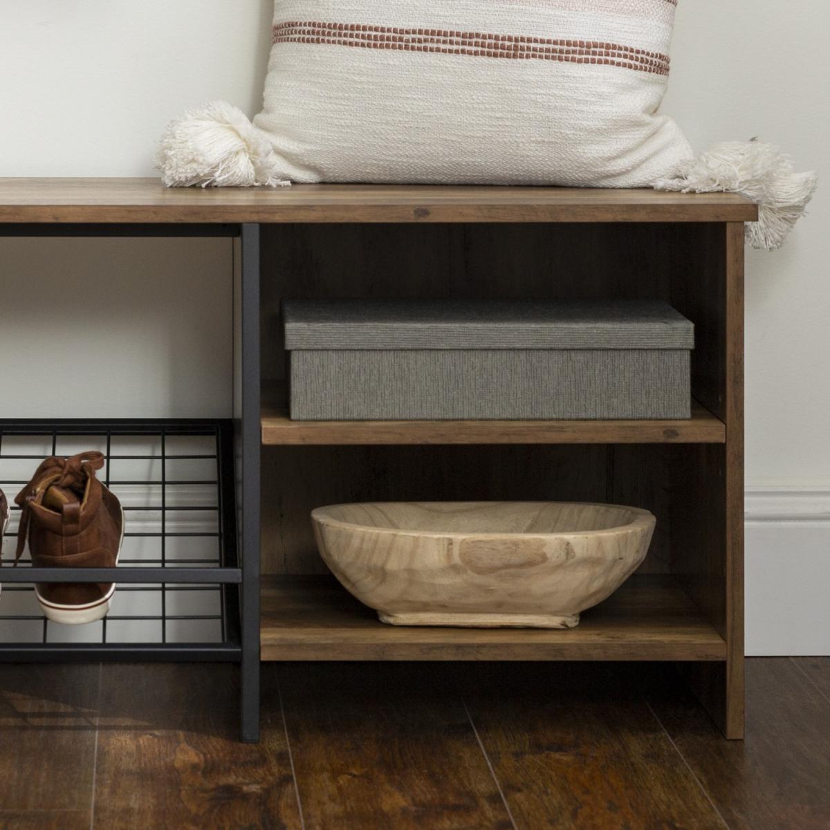Dimensions W122x H46x D41 cm. This modern industrial entry bench with shoe storage is ideal for your hallway. The seat of the bench is made of high-grade MDF premium laminate and finished with a melamine coat for increased moisture resistance. The angled wire rack underneath is perfect for shoe storage with the additional super handy open side compartments for further storage options. Features. Melamine finish for moisture resistance. Angled metal wire shoe rack. Side open storage compartment. Adjustable central shelf. Use in entryway mudroom or bedrooms Assembly Required..