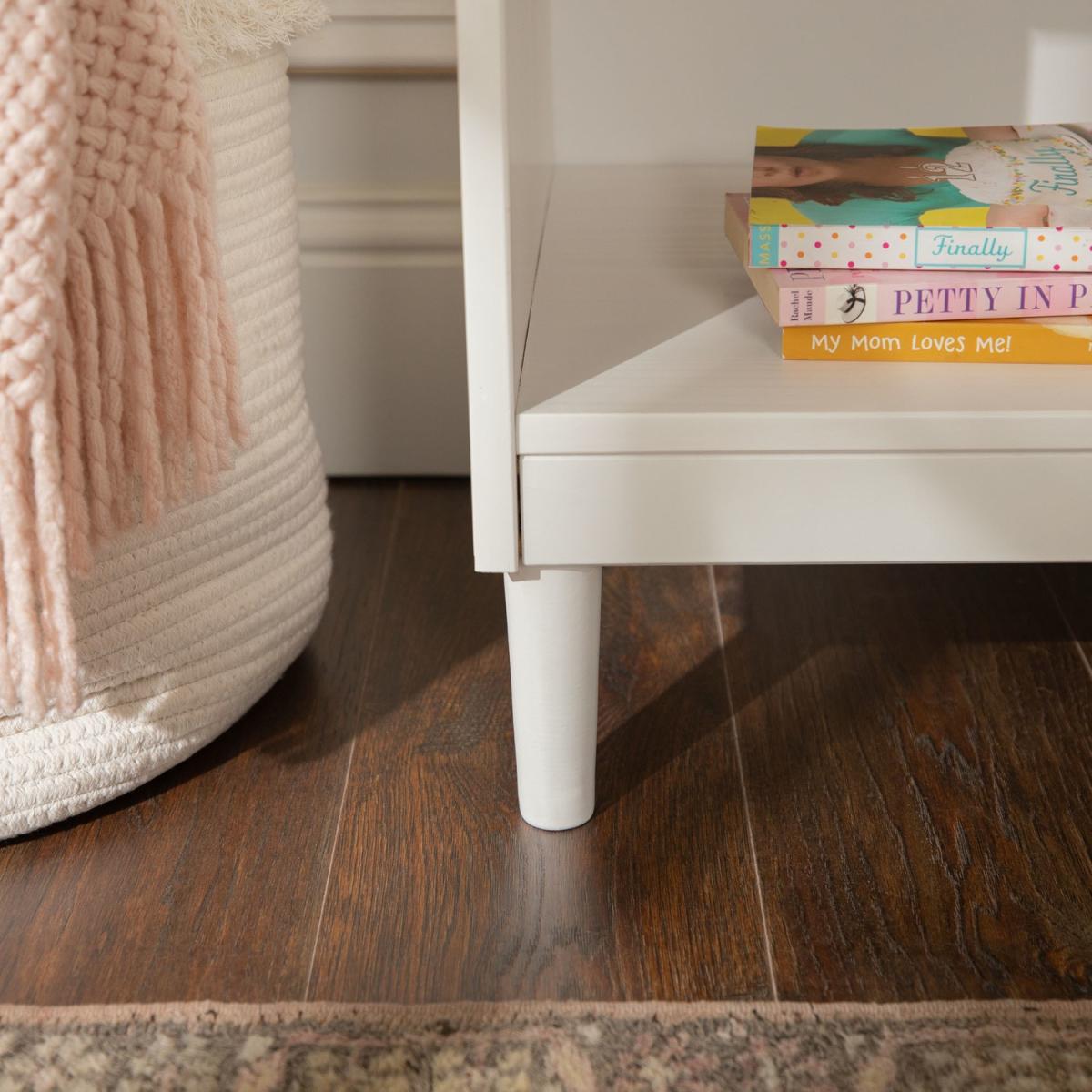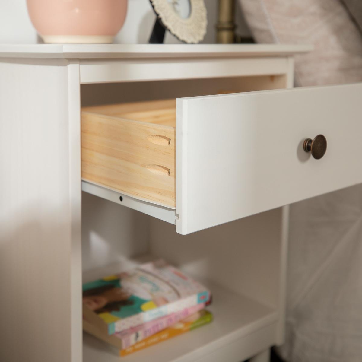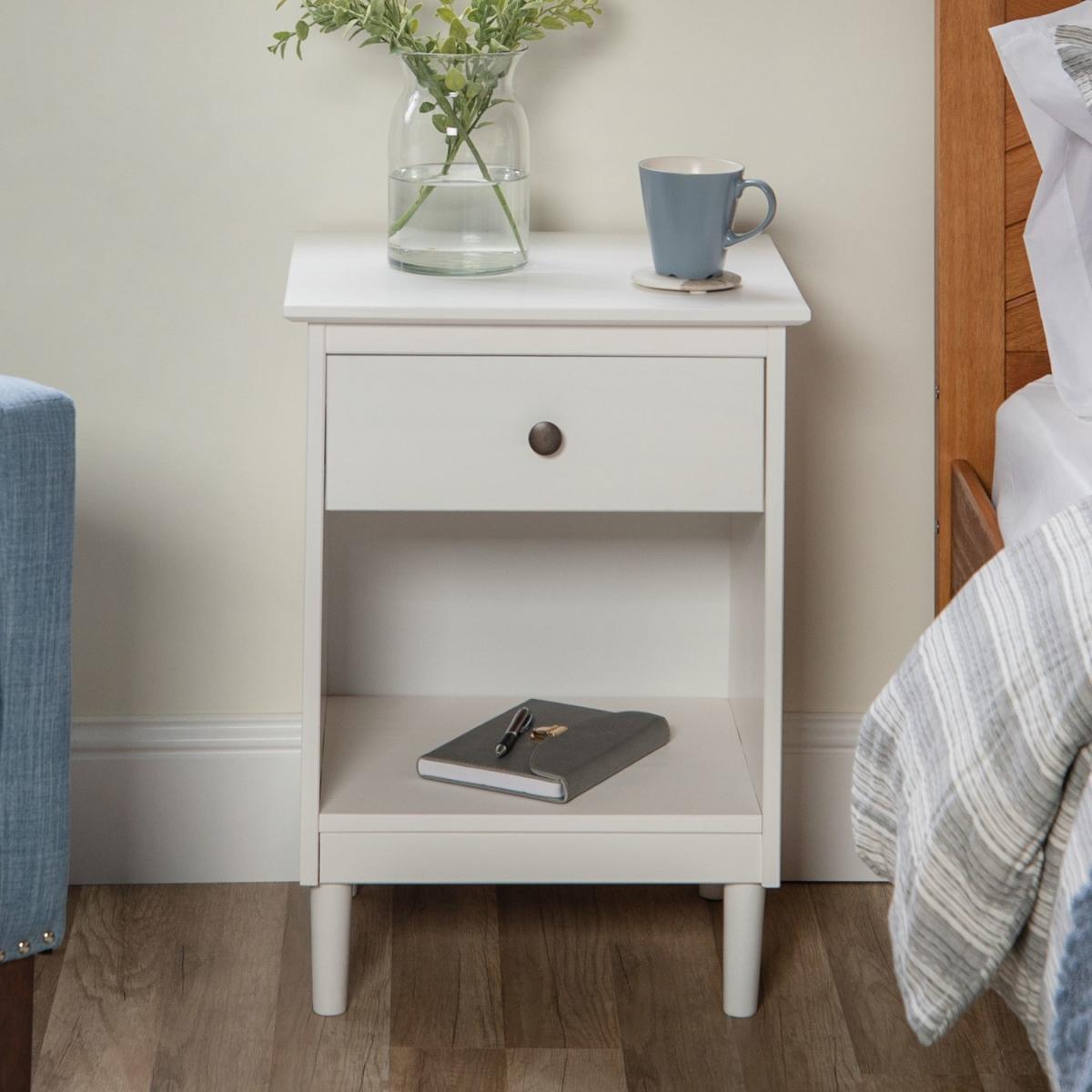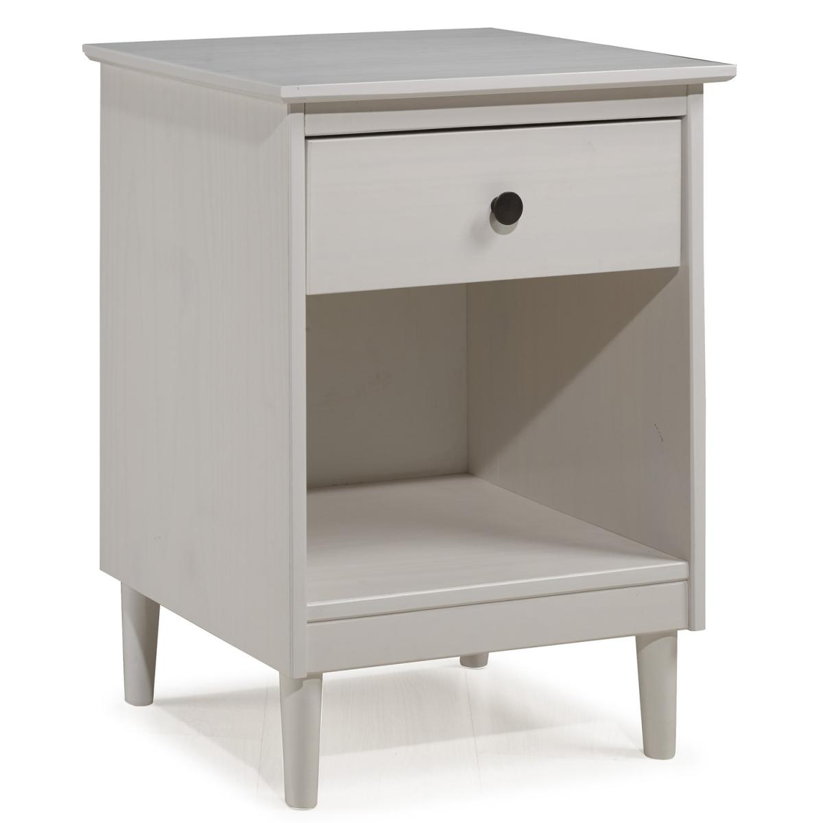 Add a classic touch to your bedroom, with this mid century modern 1-drawer wood nightstand. Crafted from solid pine and manufactured wood, with a painted finish, rooted in traditional style. Features a centered knob on the drawer, stained for a long-lasting finish, and short, tapered legs. Its simple style makes it easy to work with a variety of other styles, including transitional and modern. You'll have easy access to your phone, alarm clock, and lamp by positioning this nightstand next to your bed.
