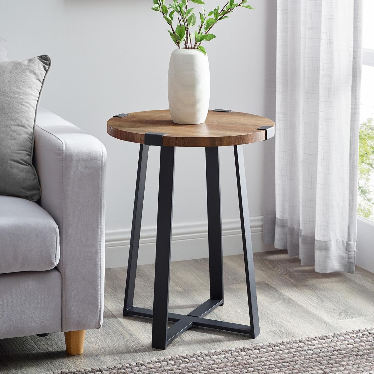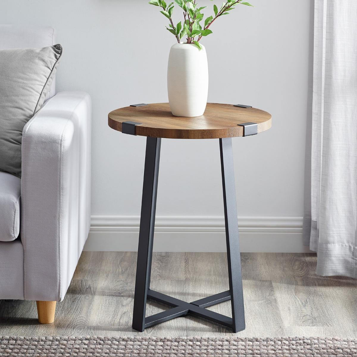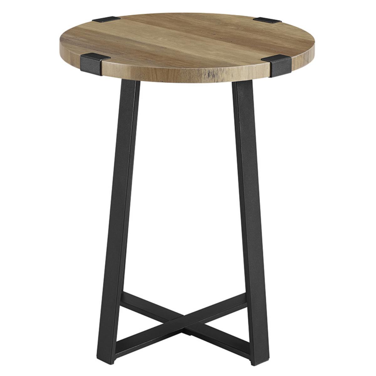 Dimensions H56cm x W46 x D46cm. Place our round side table in your bedroom or living room for a rustic urban industrial touch. The metal base of this accent table wraps around the round wooden table top to accentuate the style. The natural wood grain details on the durable laminate table top is sure to be admired by your guests. Features. Modern stylish design. In a rustic urban industrial style to complement your home. Made with a metal x-shape base that wraps around the corners of the table top Colour – Rustic Oak. With a high-grade MDF and laminate table top Perfect as a side table or end table in your living room. Easy assembly with step-by-step instructions..