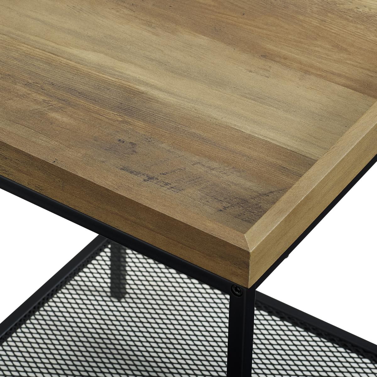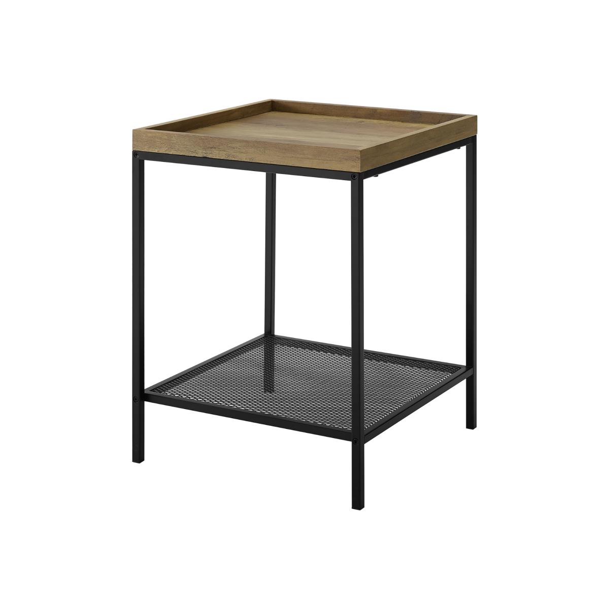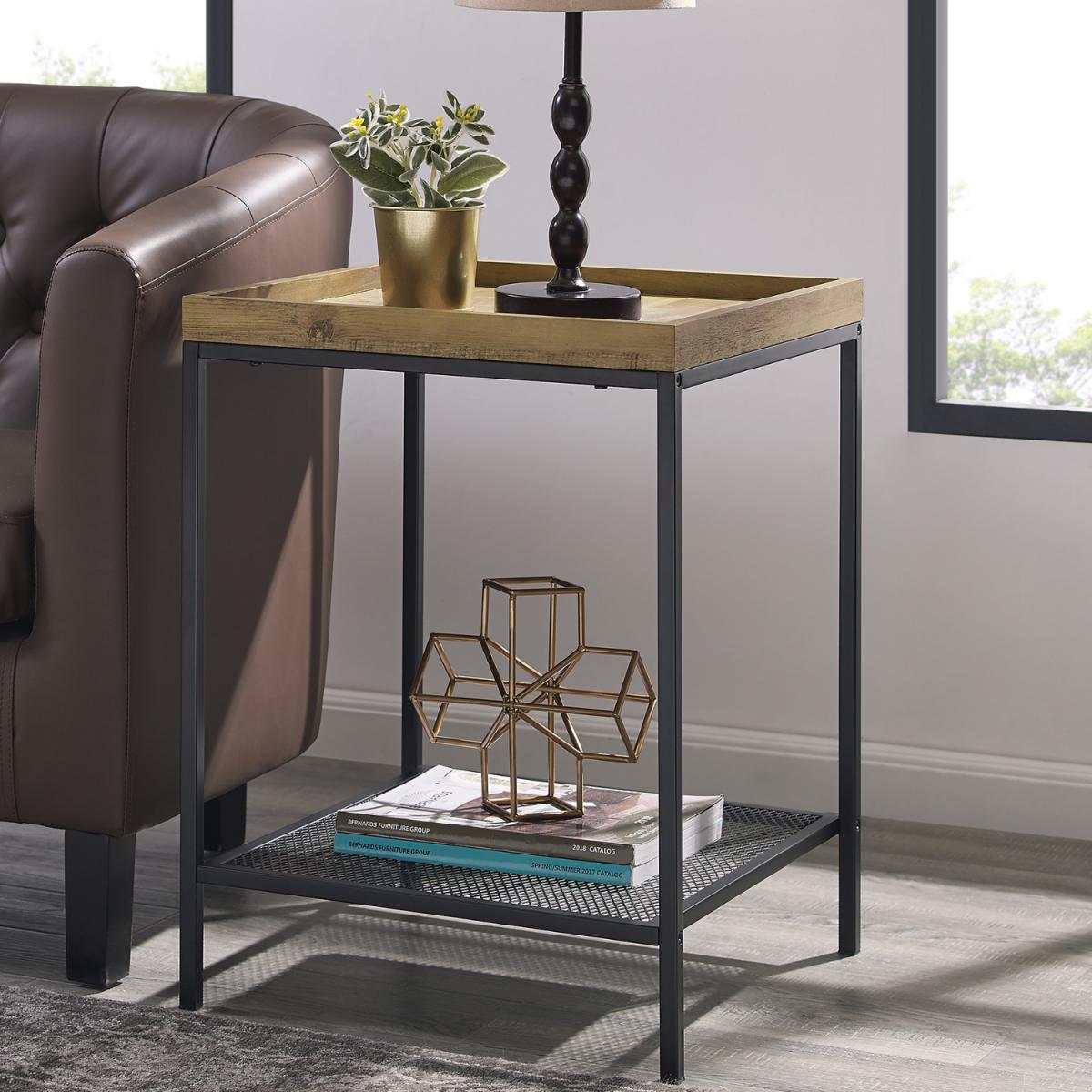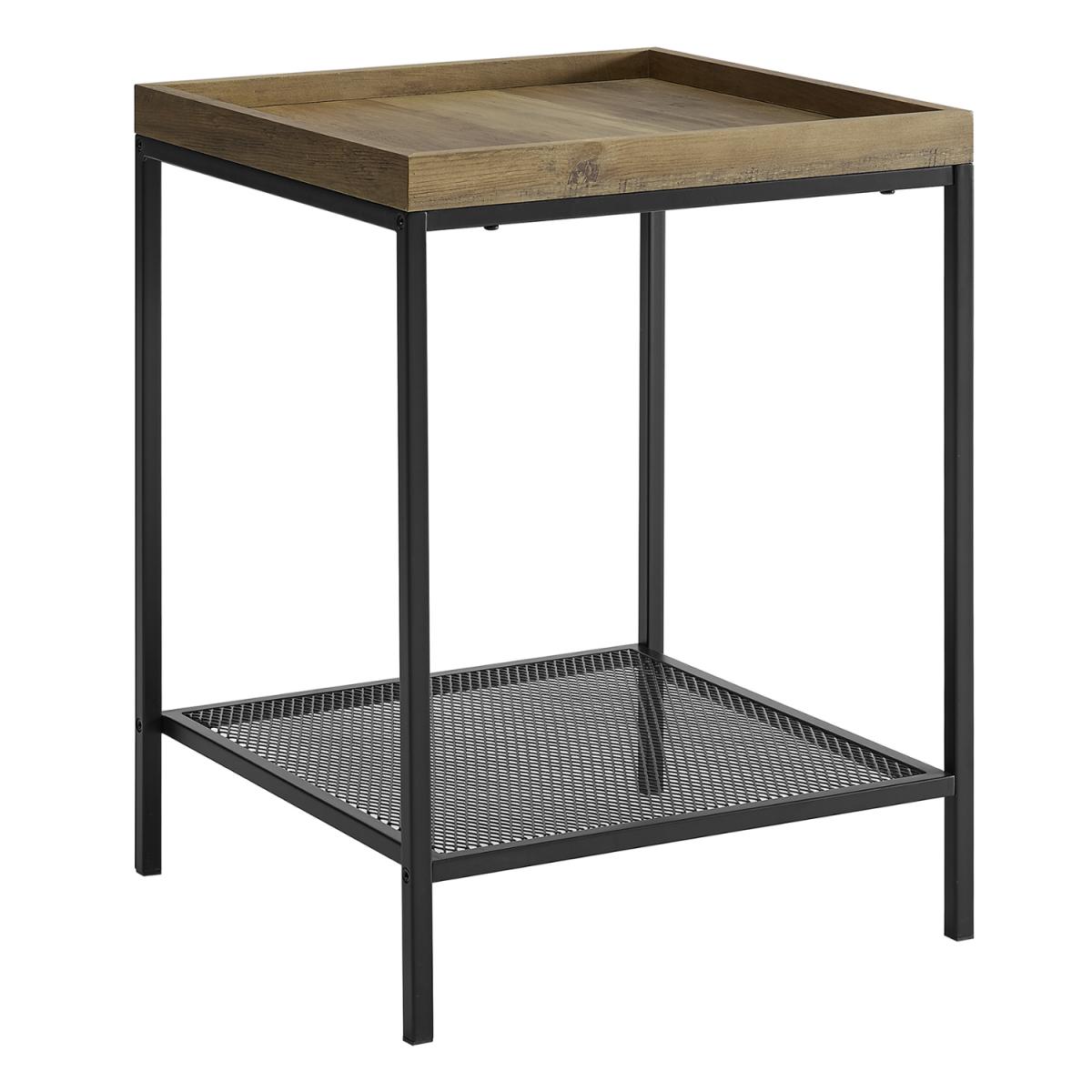 Dimensions H61cm x W46 x D46cm. Update your living room or bedroom with this uniquely designed boxy side table with a tray-like table top that's both functional and stylish. The square table top with a lip makes it easy to set your room accessories on top of without them falling off or tipping over the edge. The top of this end table is crafted of high-grade MDF and durable laminate that's ideal for everyday use. This accent table includes a mesh metal shelf and clean lined metal legs. Features. Tray style table top. Lower metal mesh shelf Urban industrial mixed material side stand. Use as a nightstand end table or accent table. Colour – Rustic Oak Easy assembly with step-by-step instructions..
