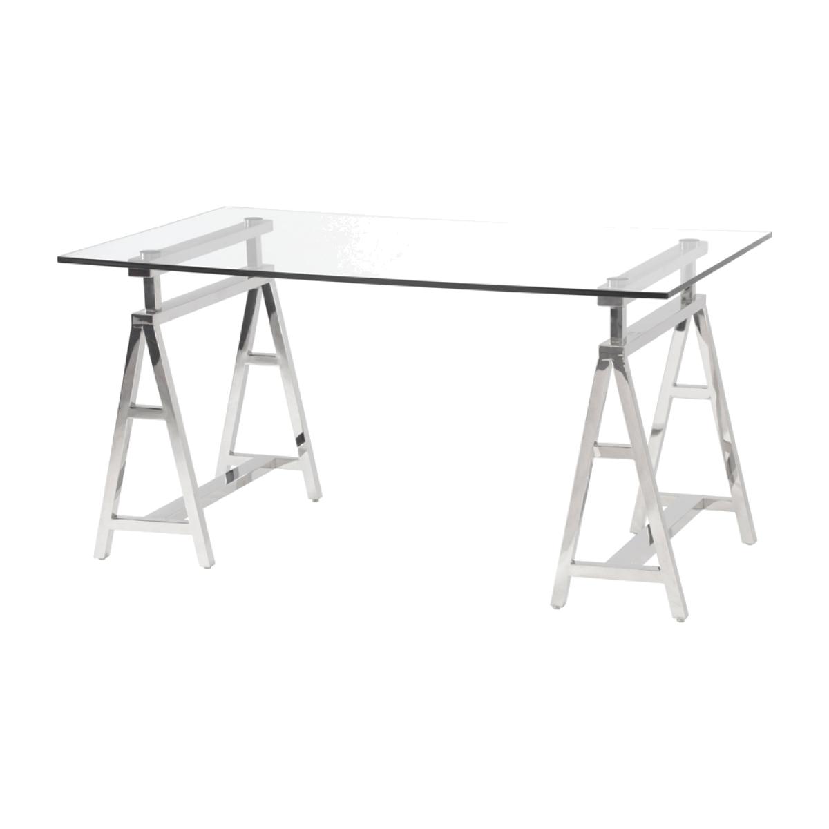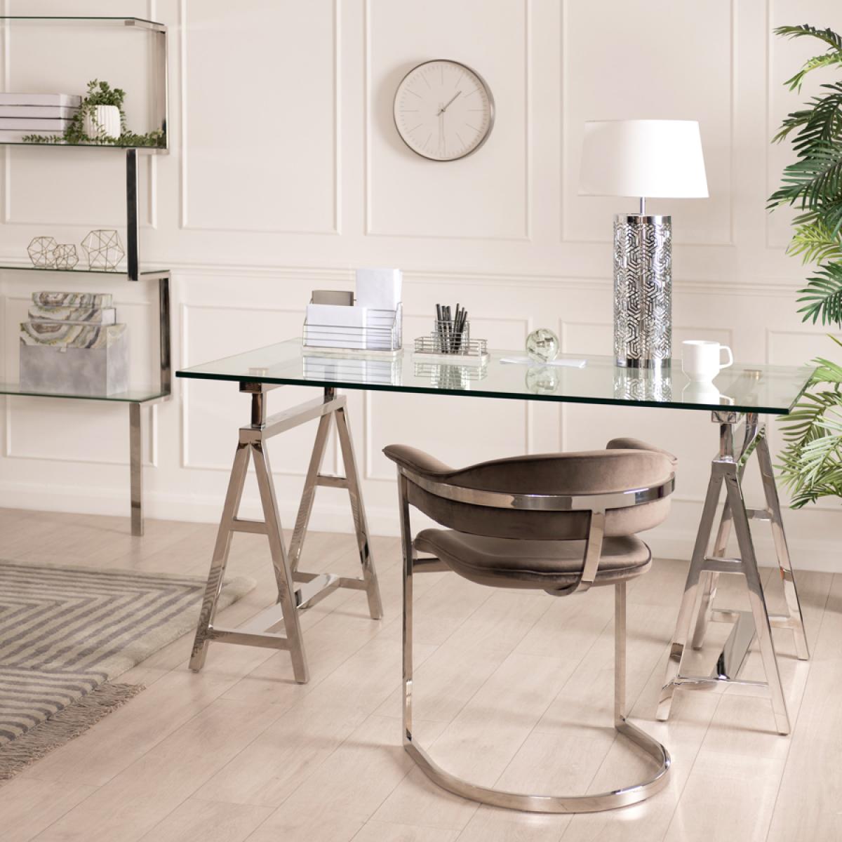 I love the Foster silver desk for its sleek, modern look-its clear glass top paired with white trestle-style legs makes it versatile for various interiors. It works particularly well in contemporary or Scandinavian spaces, where clean lines and minimalist aesthetic are key. Practical styling tips include keeping the surface uncluttered to highlight its transparency, and adding a few statement accessories or a desk lamp to create visual interest. It also pairs beautifully with a range of colours and textures, making it suitable as a statement piece in a home office or a chic, open-plan living space.
