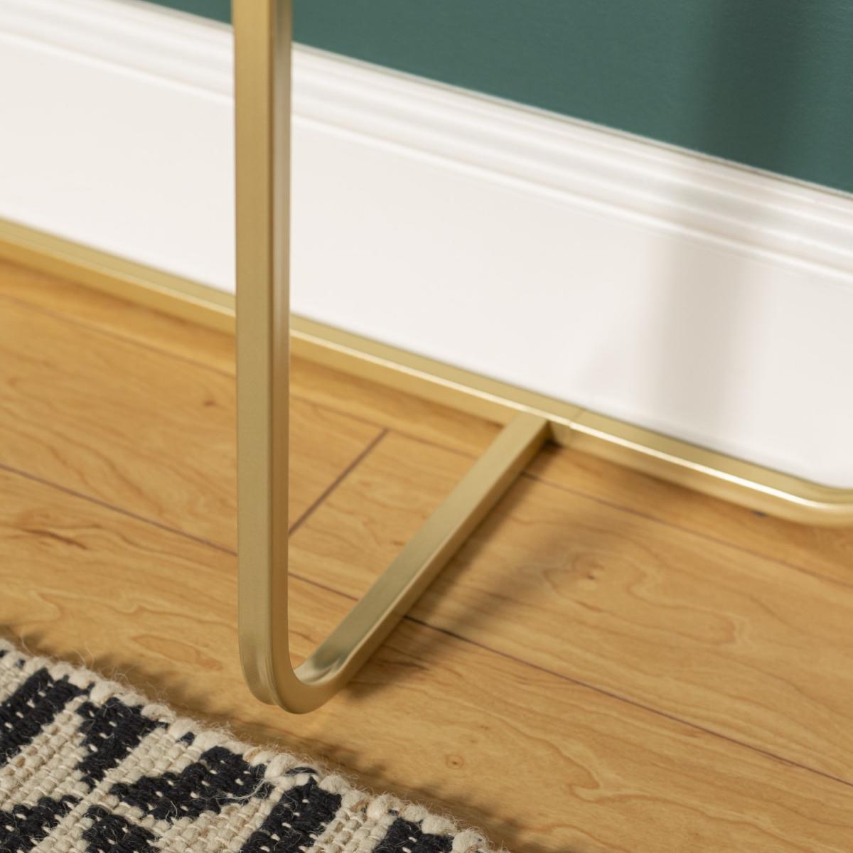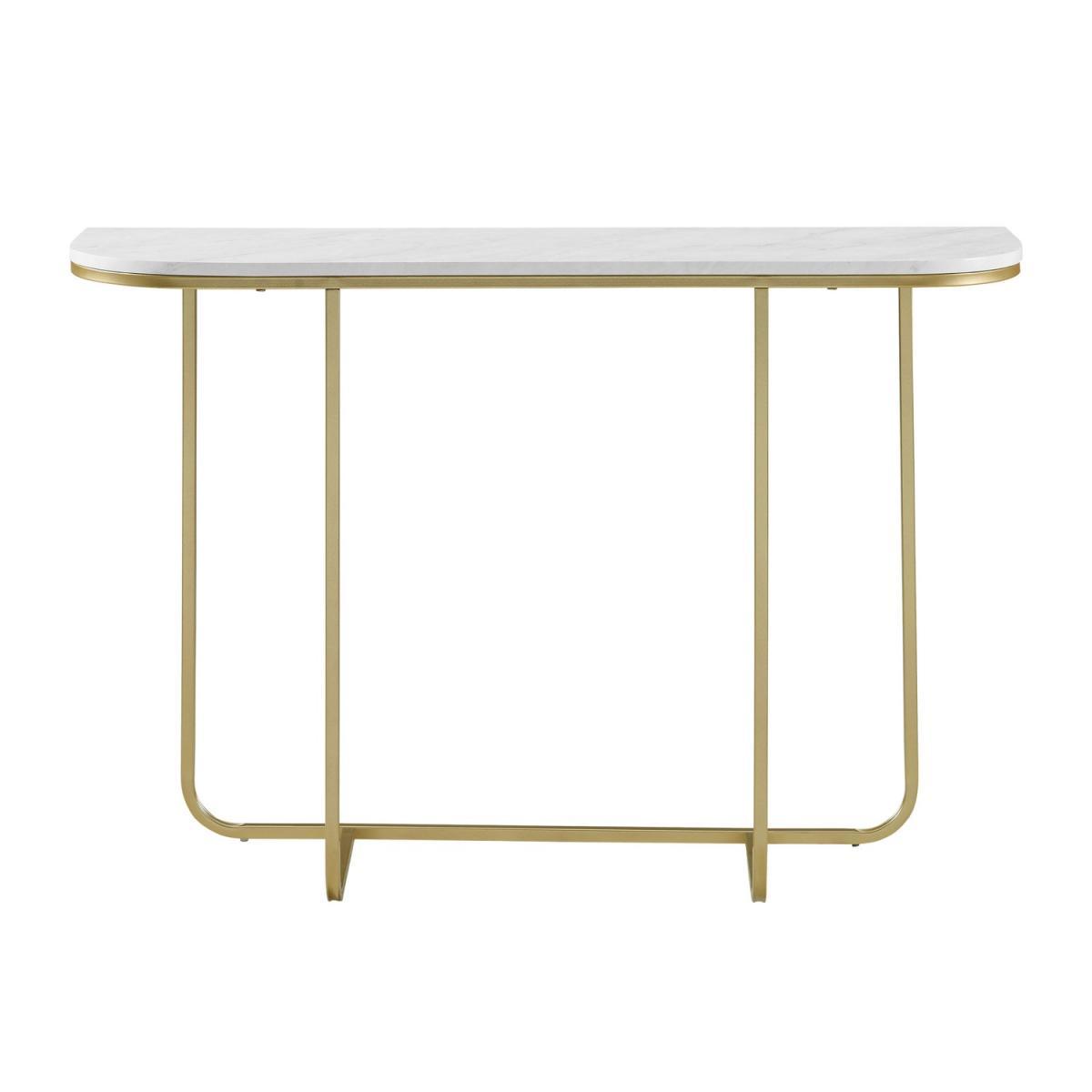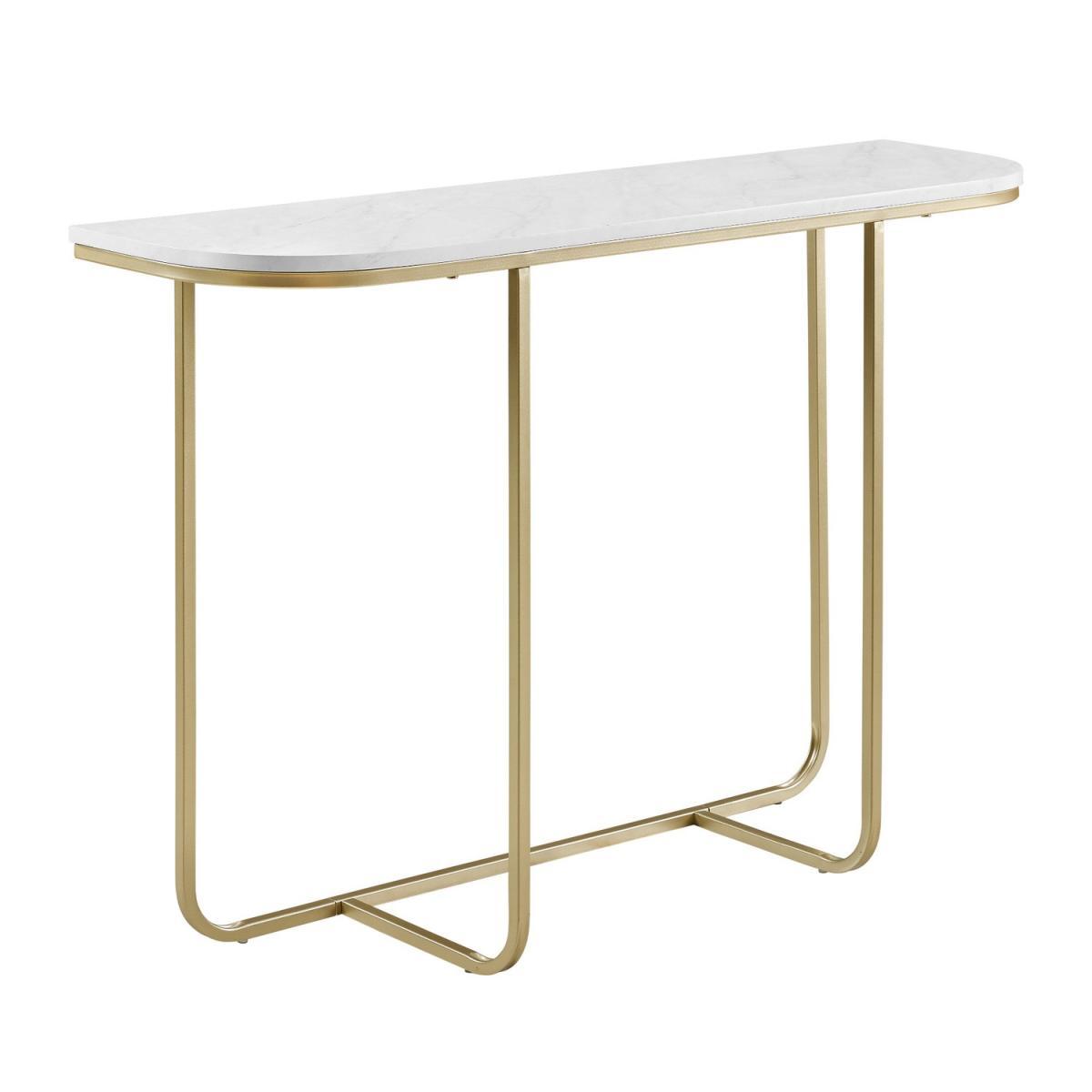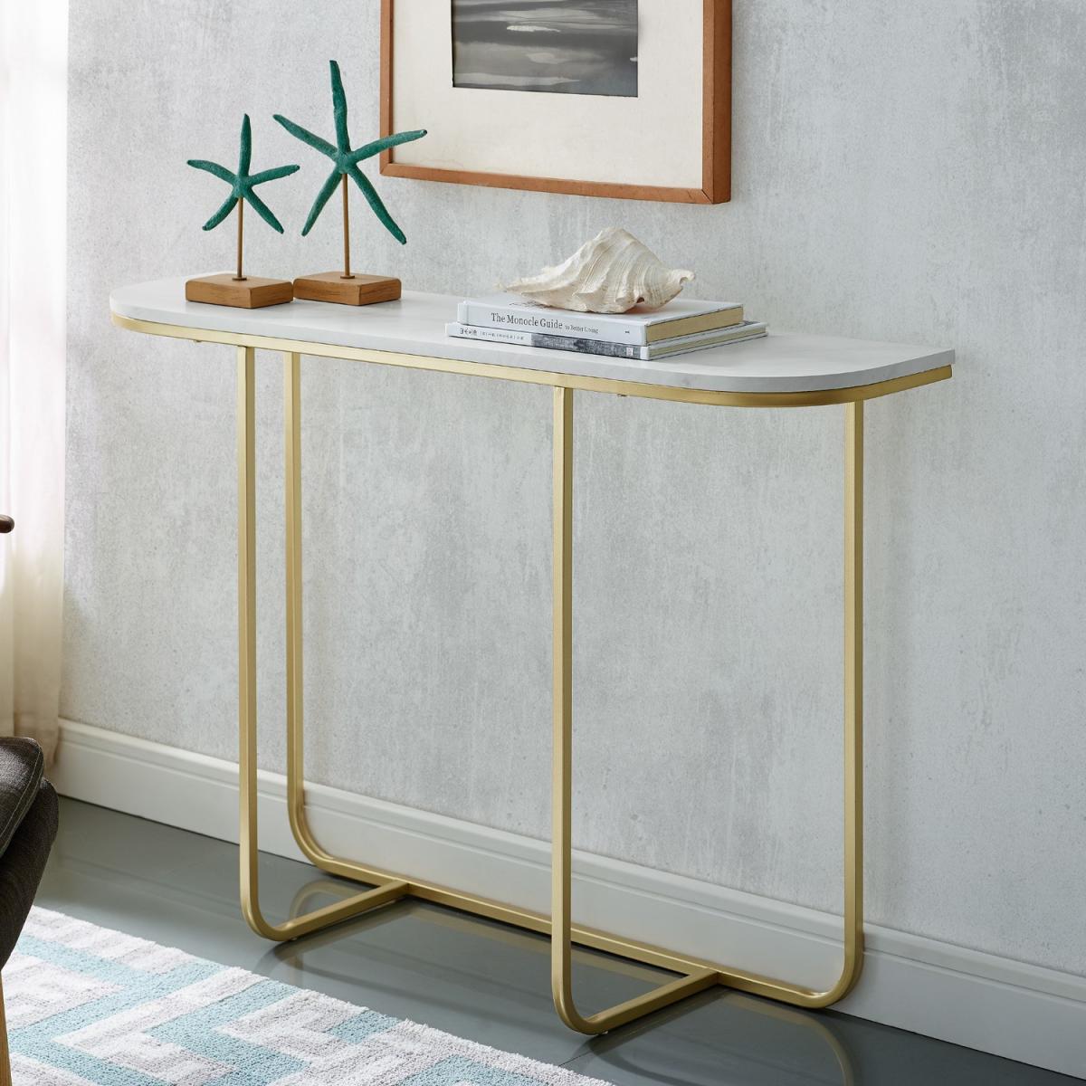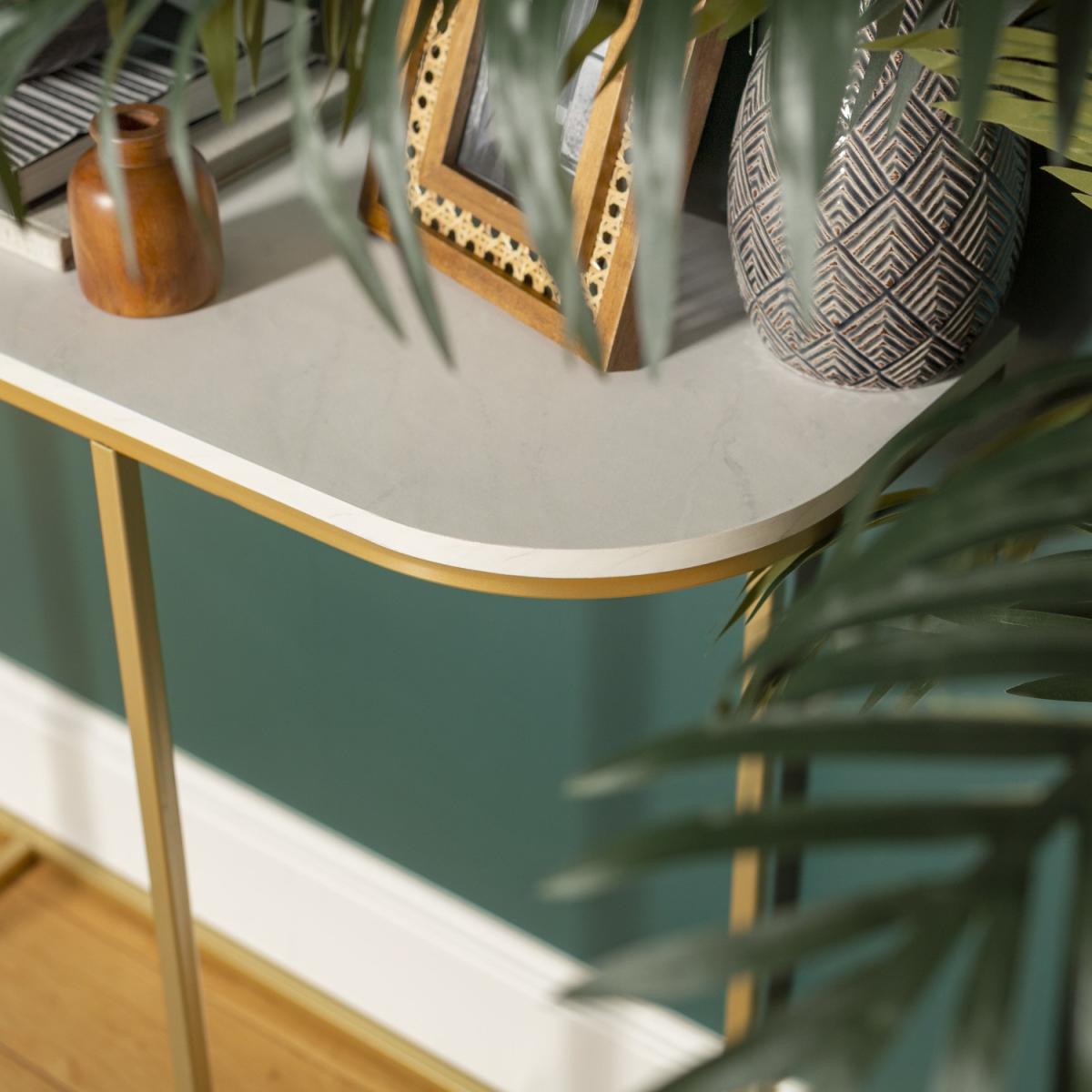This curved console table adds quirky elegance to your home's entrance. With rounded corners and a clean cut back, this modern console table is constructed to sit right against a wall or sofa. It provides a wide-open table top made of high-grade MDF that's finished with a high-quality laminate white the legs are made of painted curved metal. This contemporary console table is a great addition to your home whether you're looking for a glamourous plant stand or a simple place to put your mail.