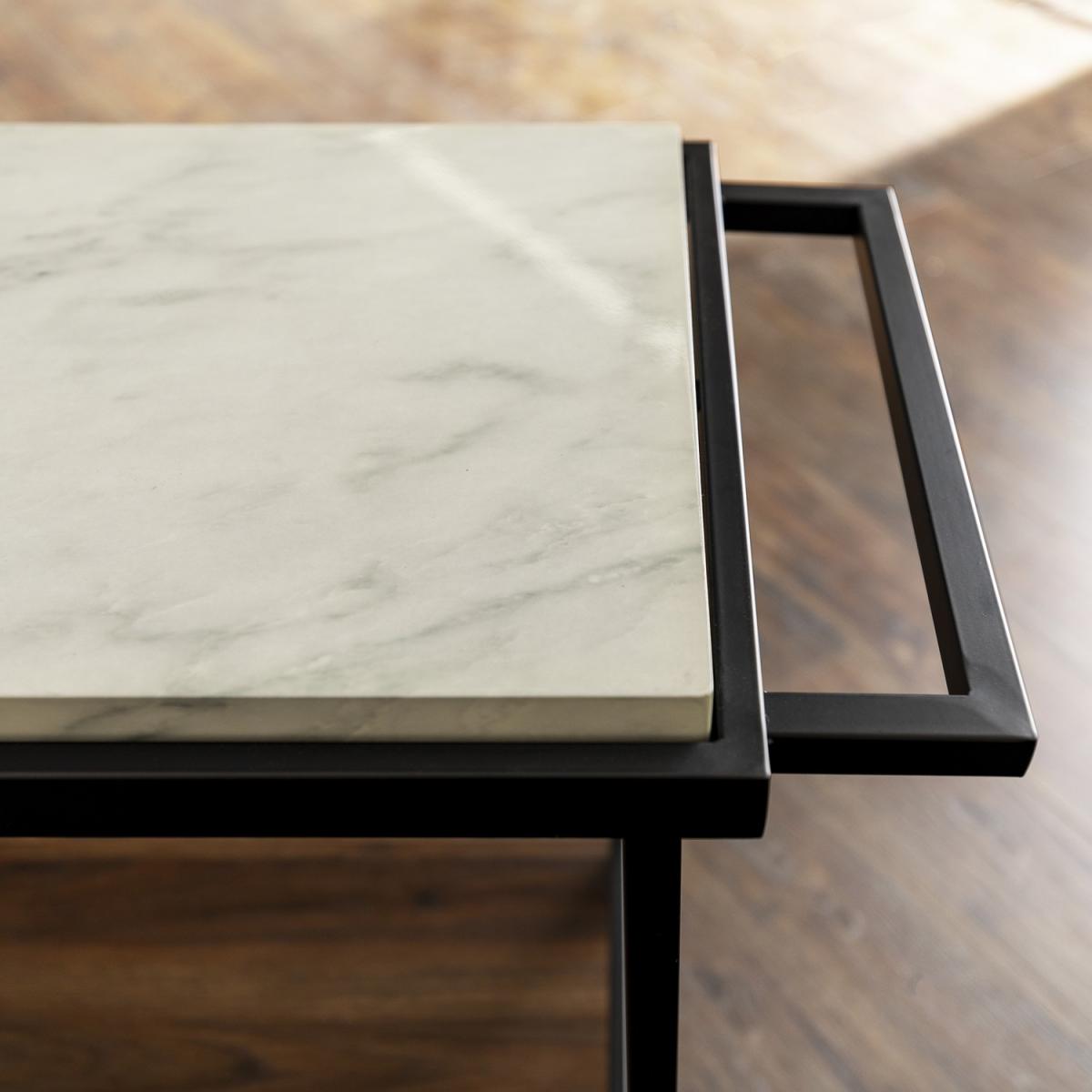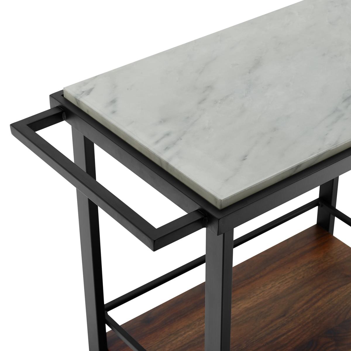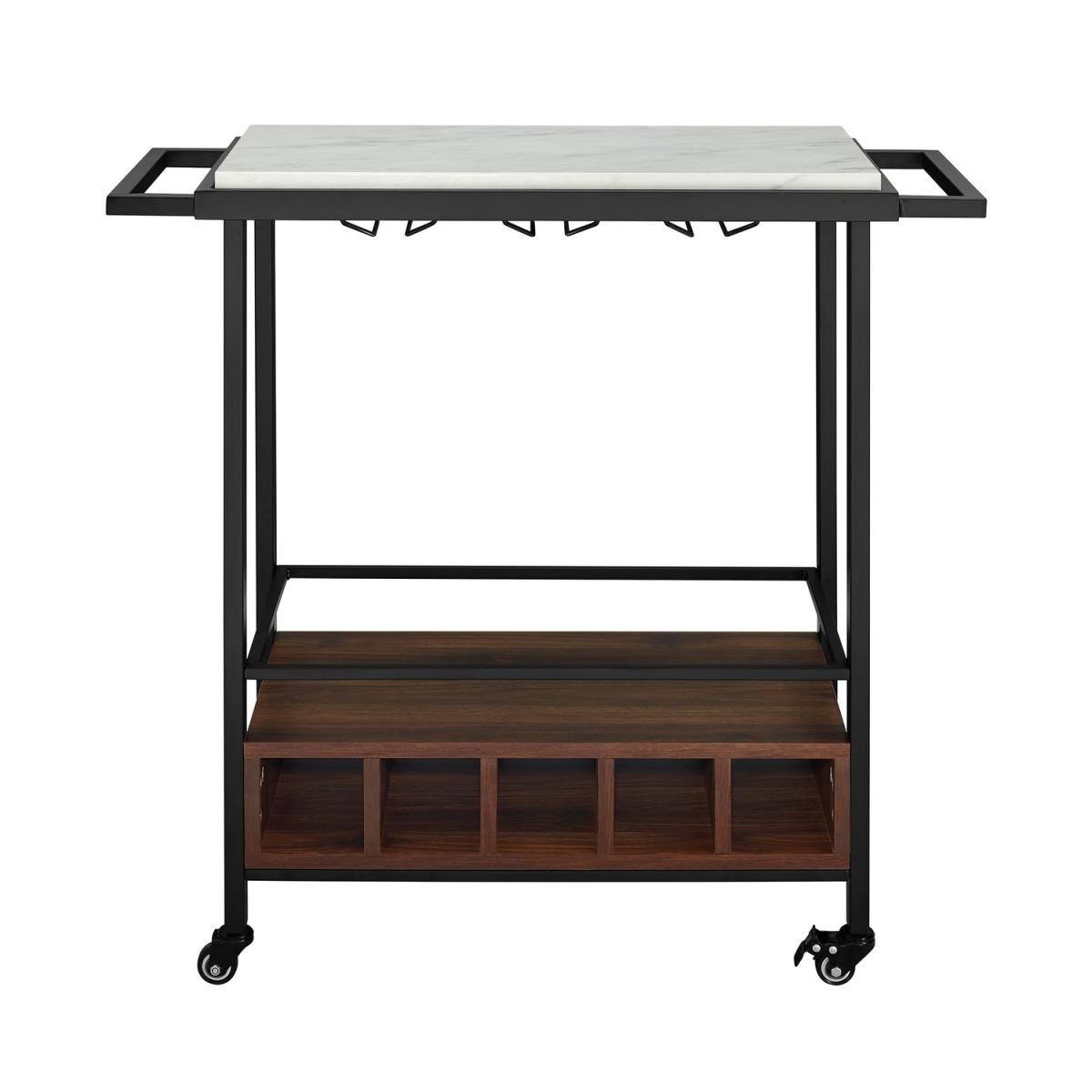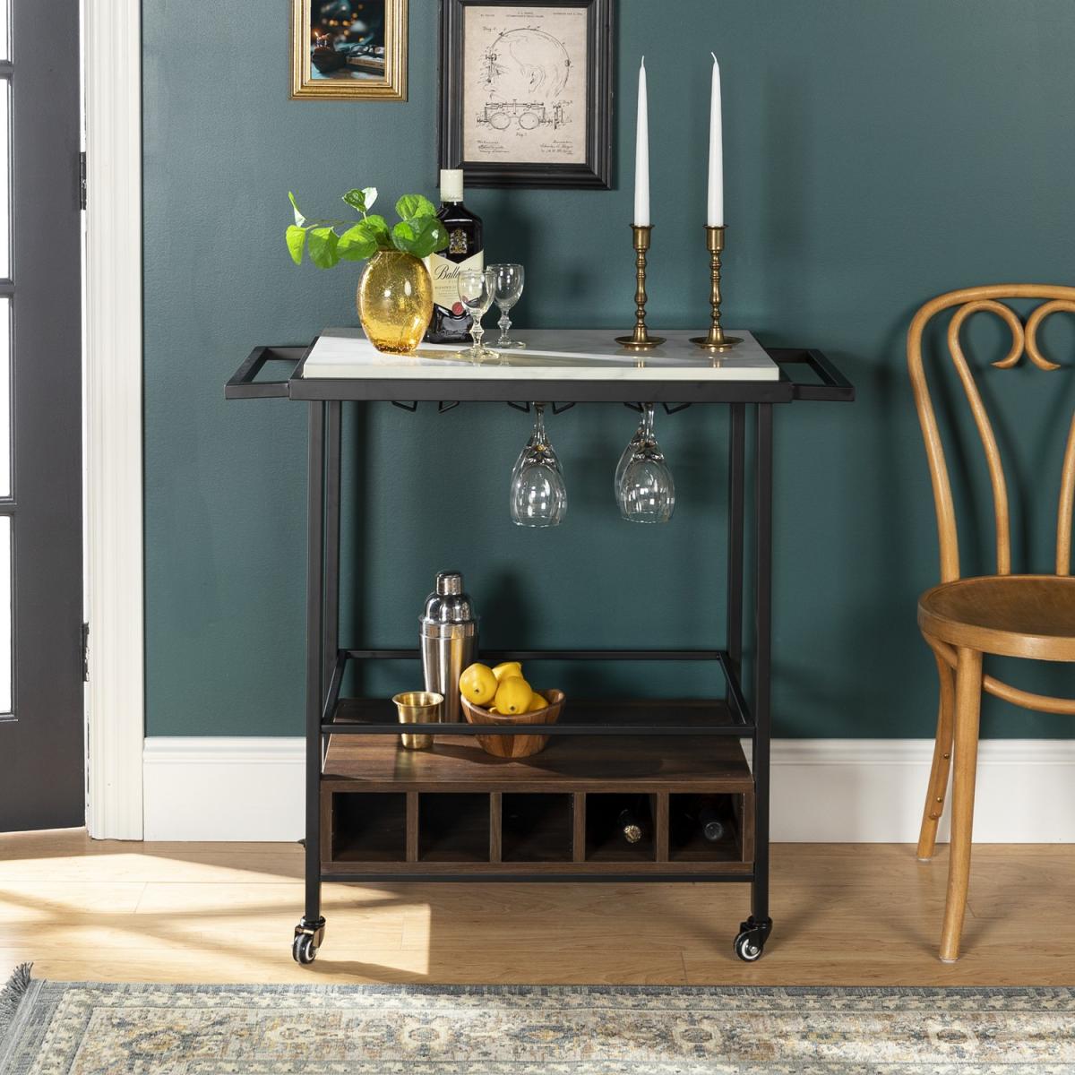 Entertain your guests with drinks and snacks on this wine rack which can easily glide from your kitchen to your living room. This wine rack is designed with a gorgeous faux marble top and lower shelf made from durable, manufactured wood with a stemware rack for drinks underneath, that way you'll have plenty of space for the items needed while hosting. The metal handles on both sides make it easy to push or pull, with the top surface protected in a UV coating for a high gloss shine and moisture resistance.
