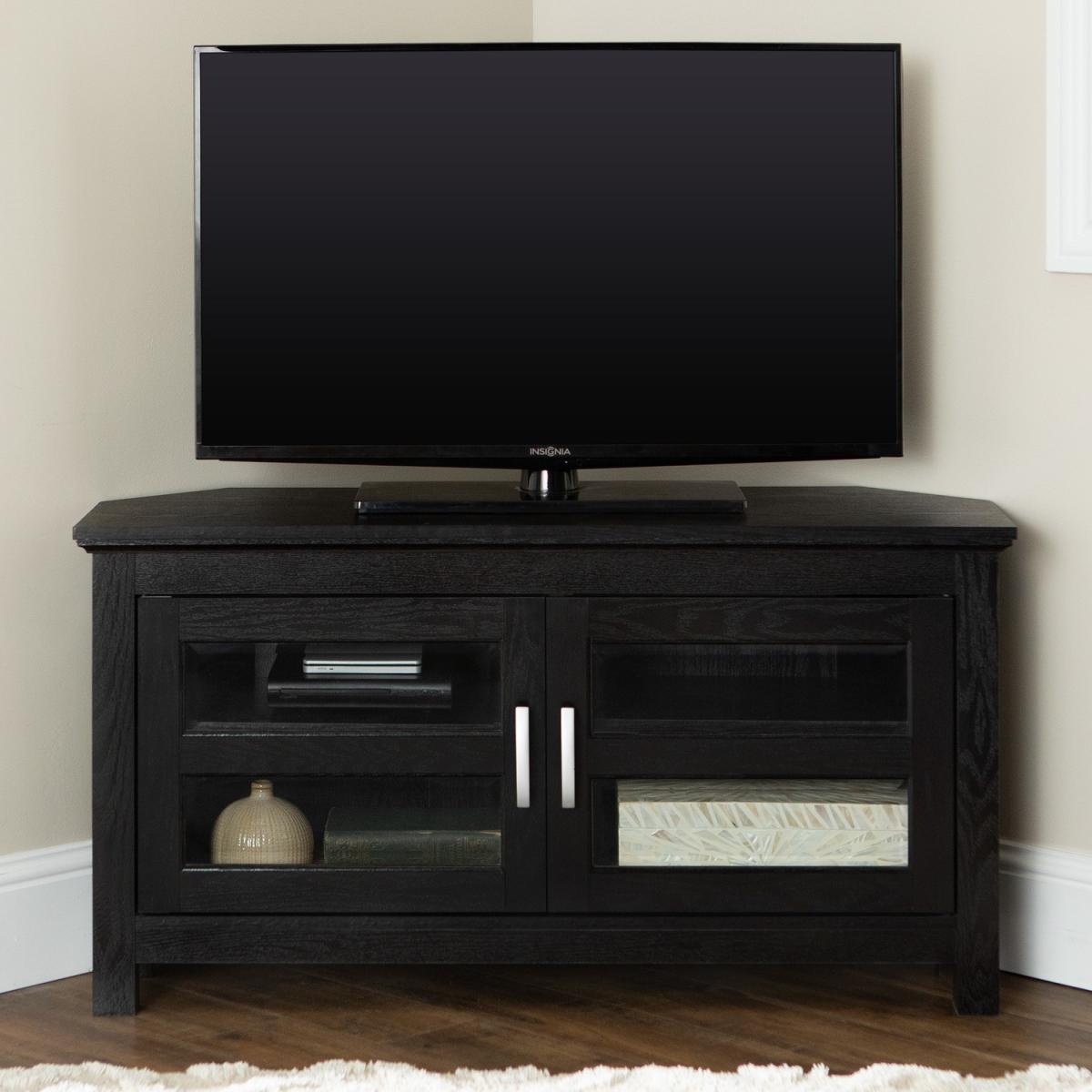 Dimensions H59 x W112 x D41 cm. The stylish black TV unit features two doors hiding 4 shelves perfect for keeping your living room accessories. The modern farmhouse style will ensure this unit will suit any home décor Features. Made with a mix of transitional and modern farmhouse style. In a corner design to save space in your living room bedroom or home office. Supports up to 250 pounds. Black colour Perfect addition to your living room Assembly required..