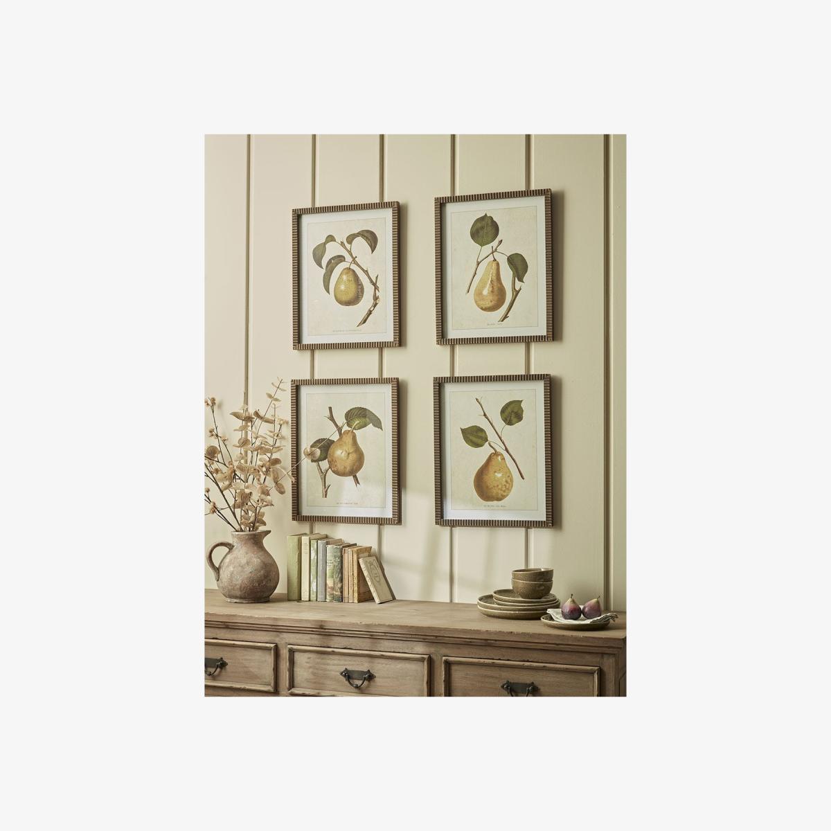 I love these four pear prints for their understated yet charming aesthetic. They work particularly well in cosy kitchens, dining rooms, or breakfast nooks where a touch of nature-inspired art can create a welcoming atmosphere. To style them effectively, consider framing them in simple, natural wood or matte finishes to enhance their organic feel. Arranging the prints in a neat grid like this adds structure, while keeping the surrounding decor minimal allows the artwork to stand out. Pairing with neutral or earthy tones in your textiles and accessories will help these prints complement a range of interior styles, from rustic to modern, making them a versatile and stylish addition to your space.