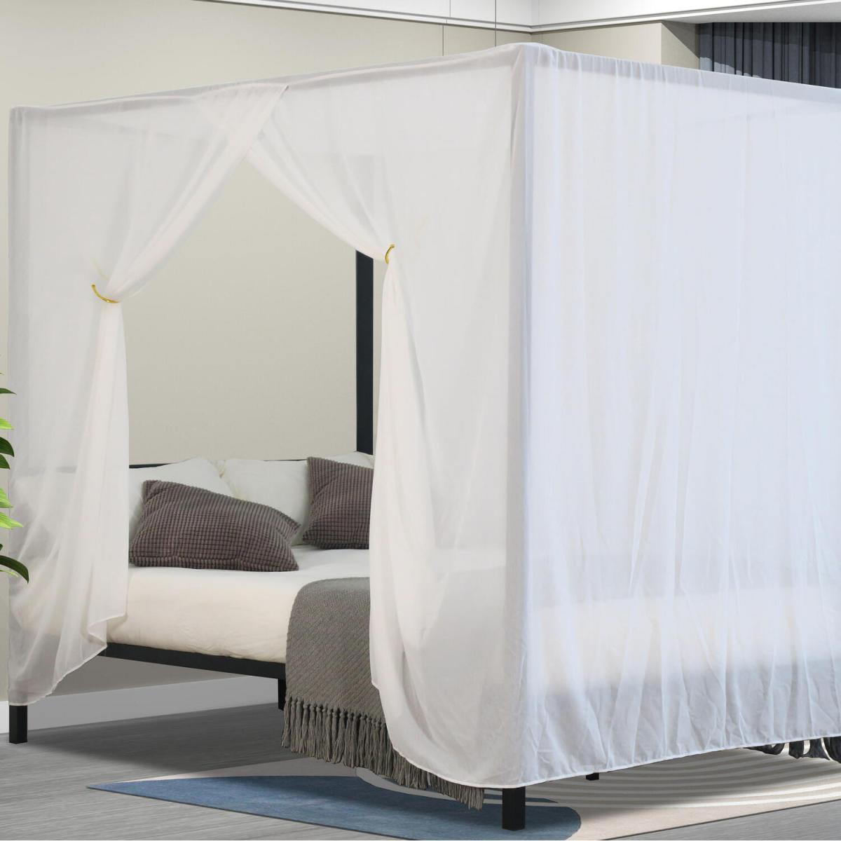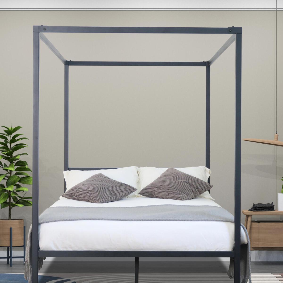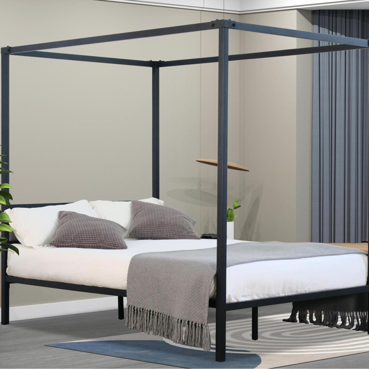 Four Poster Metal Bedframe with Minimalist Headboard Design - Black / Double