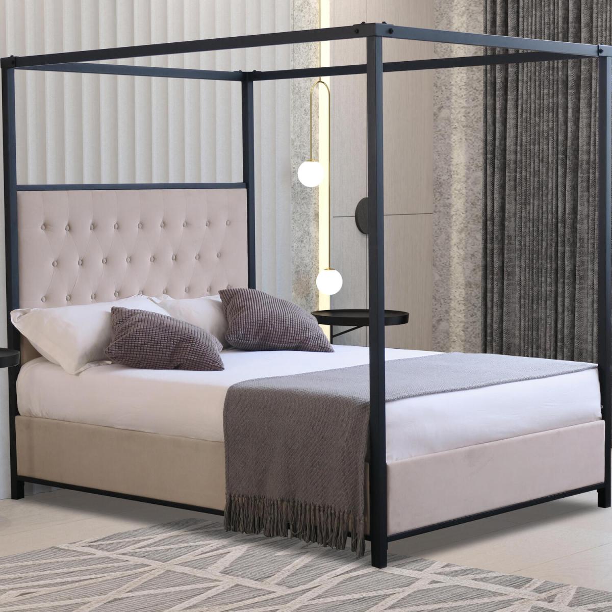 This stylish black four-poster bed is beautifully upholstered in plush velvet fabric. It features a stylish buttoned headboard. It is made from a solid metal frame and has a sprung slatted base to give support to the mattress and give you a fully supportive and comfortable night's sleep. Available in grey or cream, it will match every decor.