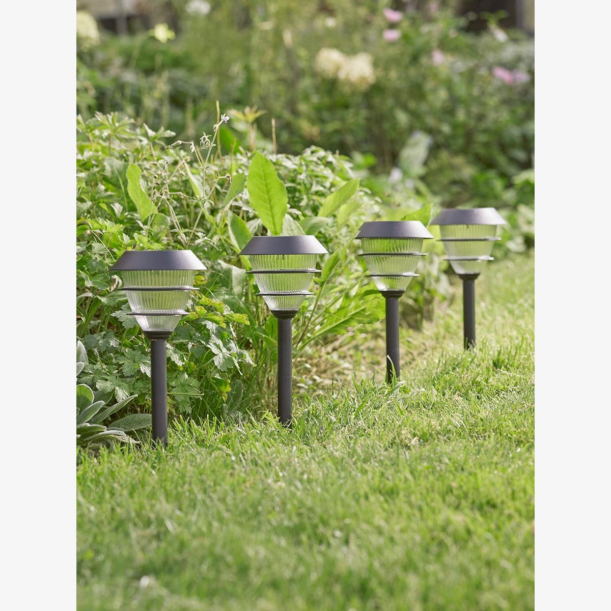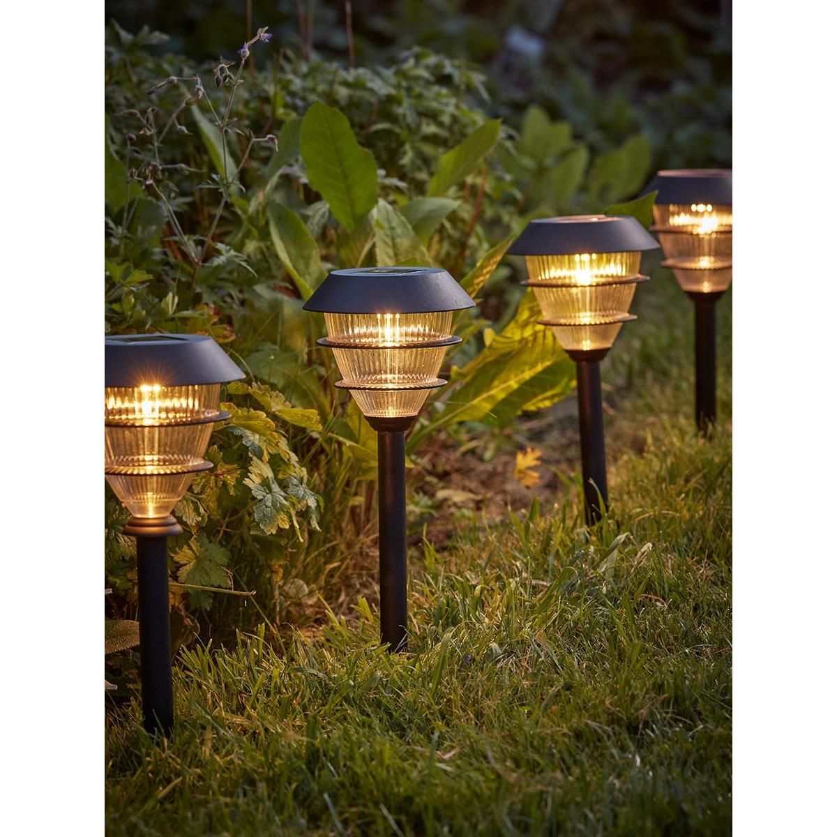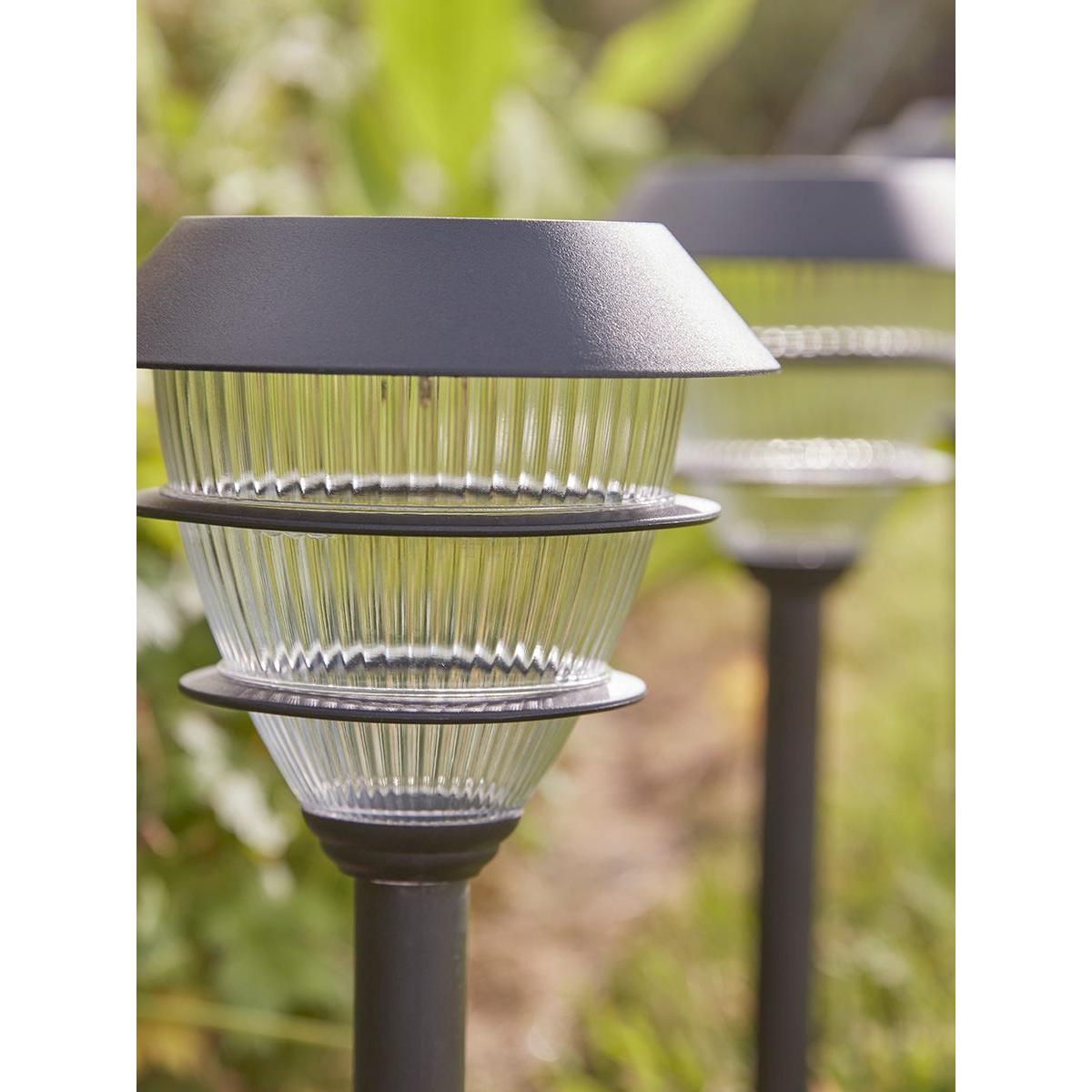 Elevate your outdoor space with our easy but stylish solar light stakes. Simple to place, our Solar Tiered Stake Lights come in sets of four and have attractive ribbed lanterns with black rings. Each light will provide six hours of light and simply needs to be pushed firmly into the ground - no wiring or electricity required!