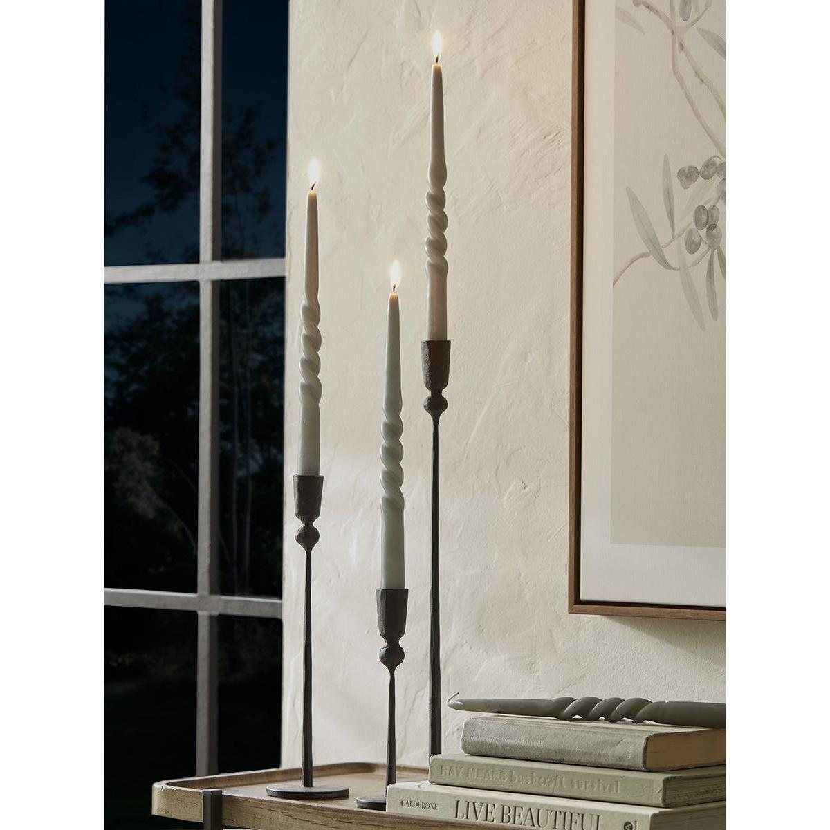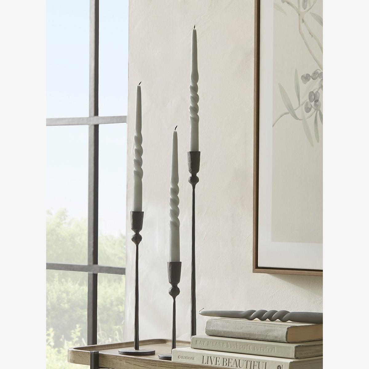 I love these candles for their modern, sculptural aesthetic - the twisted design adds subtle movement while remaining understated. They work particularly well in contemporary or minimalist interiors, but can also add a touch of sophistication to more traditional settings. To style them effectively, I’d recommend grouping a pair or trio on a mantelpiece, side table, or console for a clean, uncluttered look. They pair beautifully with monochrome palettes or neutral tones, and look great combined with metallic accents for added dimension. To keep a cohesive vibe, opt for simple candle holders or bases that enhance the twist detail without overshadowing it.