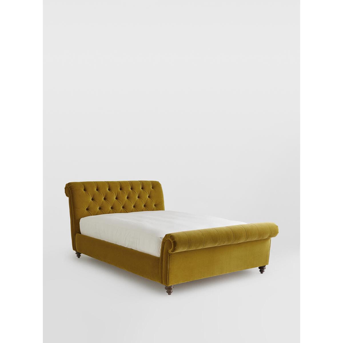 Our Foxcote bed references the cosy style of the cabins at Soho Farmhouse. The traditional scrolled sleigh bedstead is upholstered in velvet for a relaxed rustic feel, while its cushioned Chesterfield-style headboard brings extra comfort. Velvet double bed Sleigh bedstead Scrolled headboard and footboard Chesterfield-style deep buttoned detailing Turned wooden feet Seen in the bedrooms at Soho Farmhouse Available in velvet and linen Mattress is not included and can be purchased separately