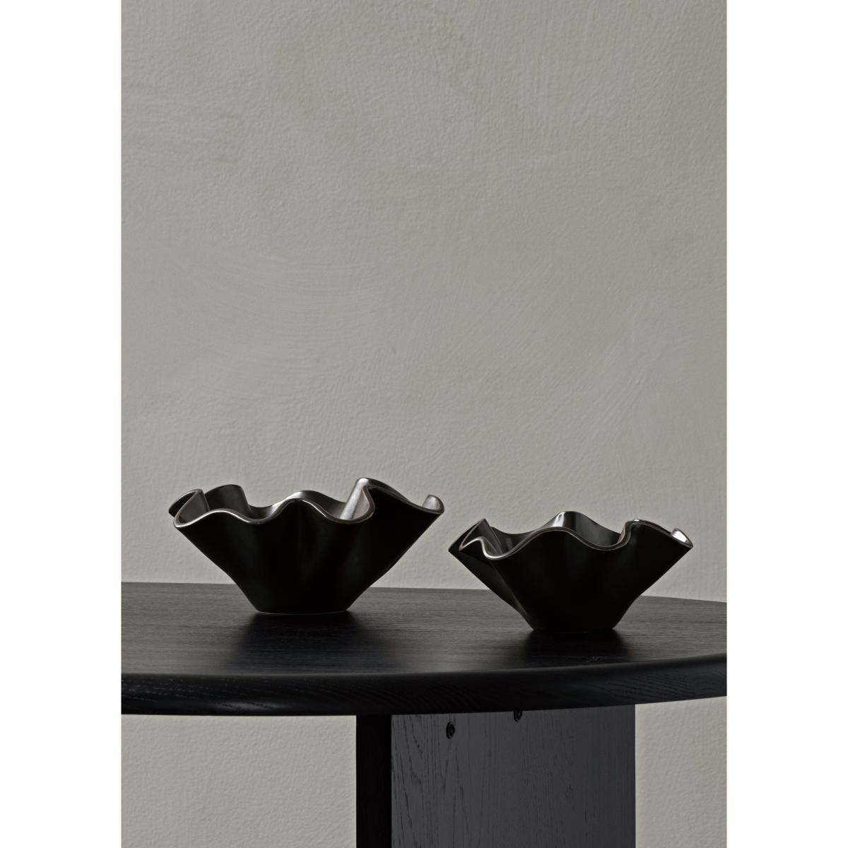 I love the black fragilis bowl for its sculptural quality, making it a versatile statement piece in any interior. Its organic, ruffled form lends itself well to modern and minimalist décors, adding a touch of texture and interest without overwhelming the space. Practical styling tips include using it as a centrepiece on a dining or coffee table, filled with decorative objects like dried flowers or stones, or simply as a standalone art piece to enhance a contemporary aesthetic. Its dark hue and unique shape can anchor neutral palettes, while also working beautifully in interiors that incorporate darker tones or industrial accents. Overall, it’s an artistic piece that bridges functionality with visual impact.