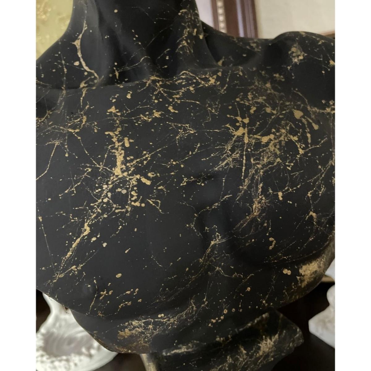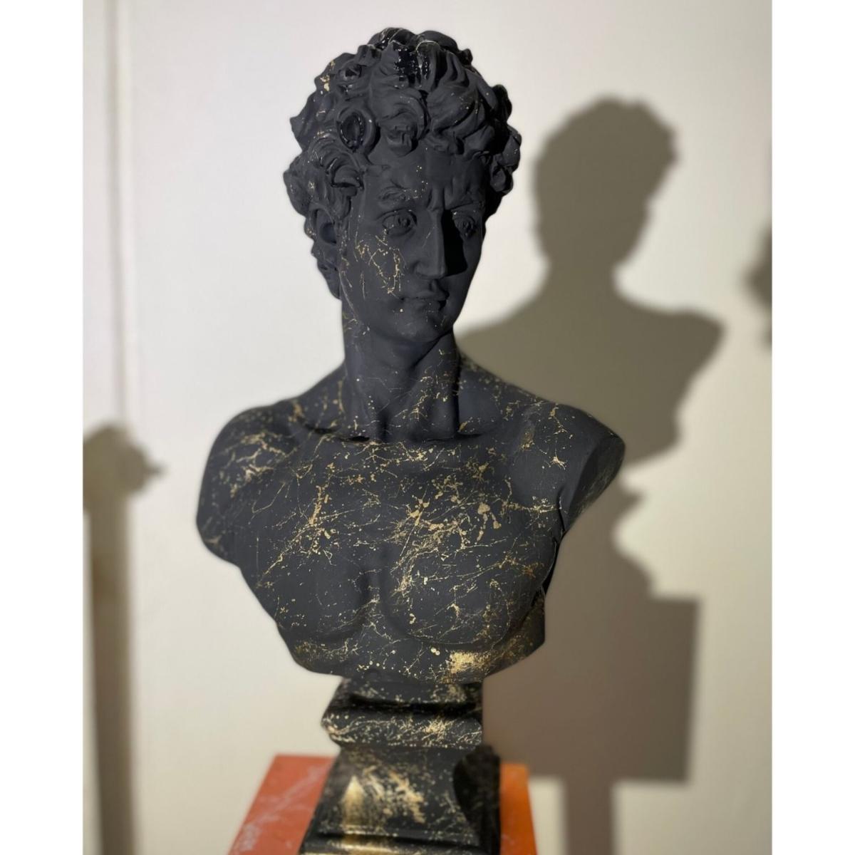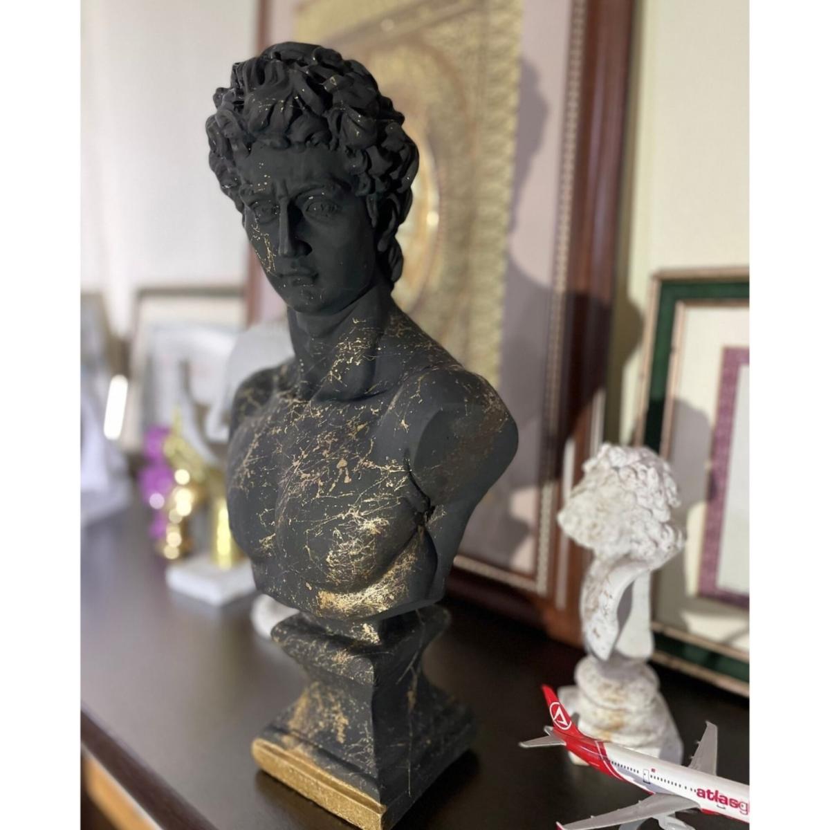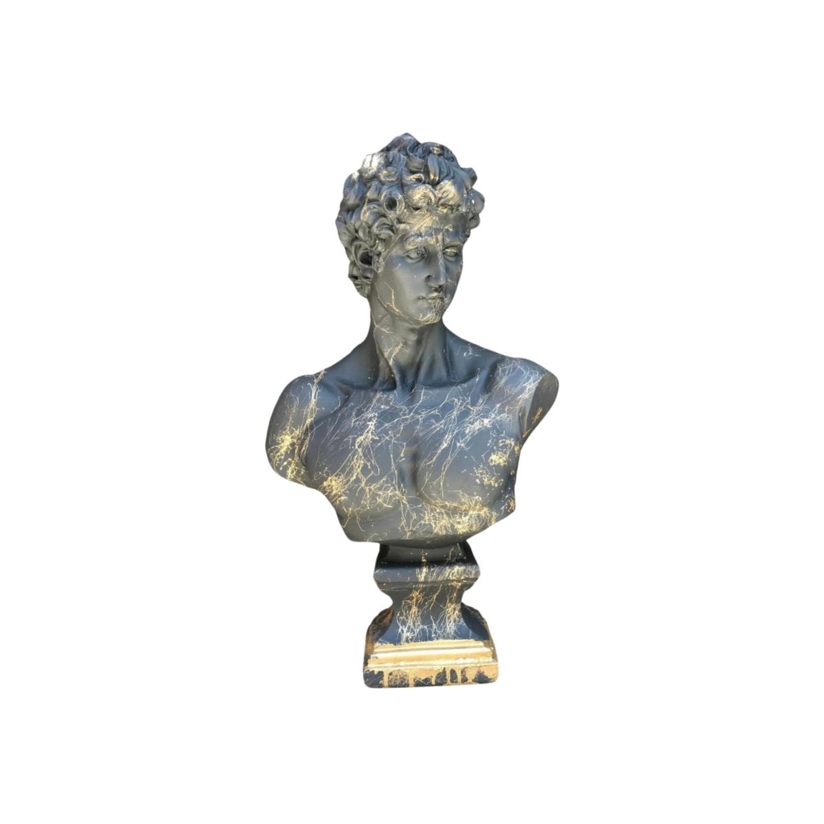 "Fragmented Majesty" is a striking sculpture measuring 24 x 43 cm, blending classical artistry with modern aesthetics. This unique piece presents a reinterpretation of the iconic David bust, with one side meticulously fractured and accented with marble-like veins. The dark, matte finish contrasts with the intricate cracks, creating a powerful visual impact that symbolizes the intersection of perfection and imperfection. Ideal for art collectors and those who appreciate contemporary design, this sculpture serves as a bold statement piece, adding depth and character to any space it inhabits. Gently dust your sculpture with a soft, dry cloth or a feather duster.