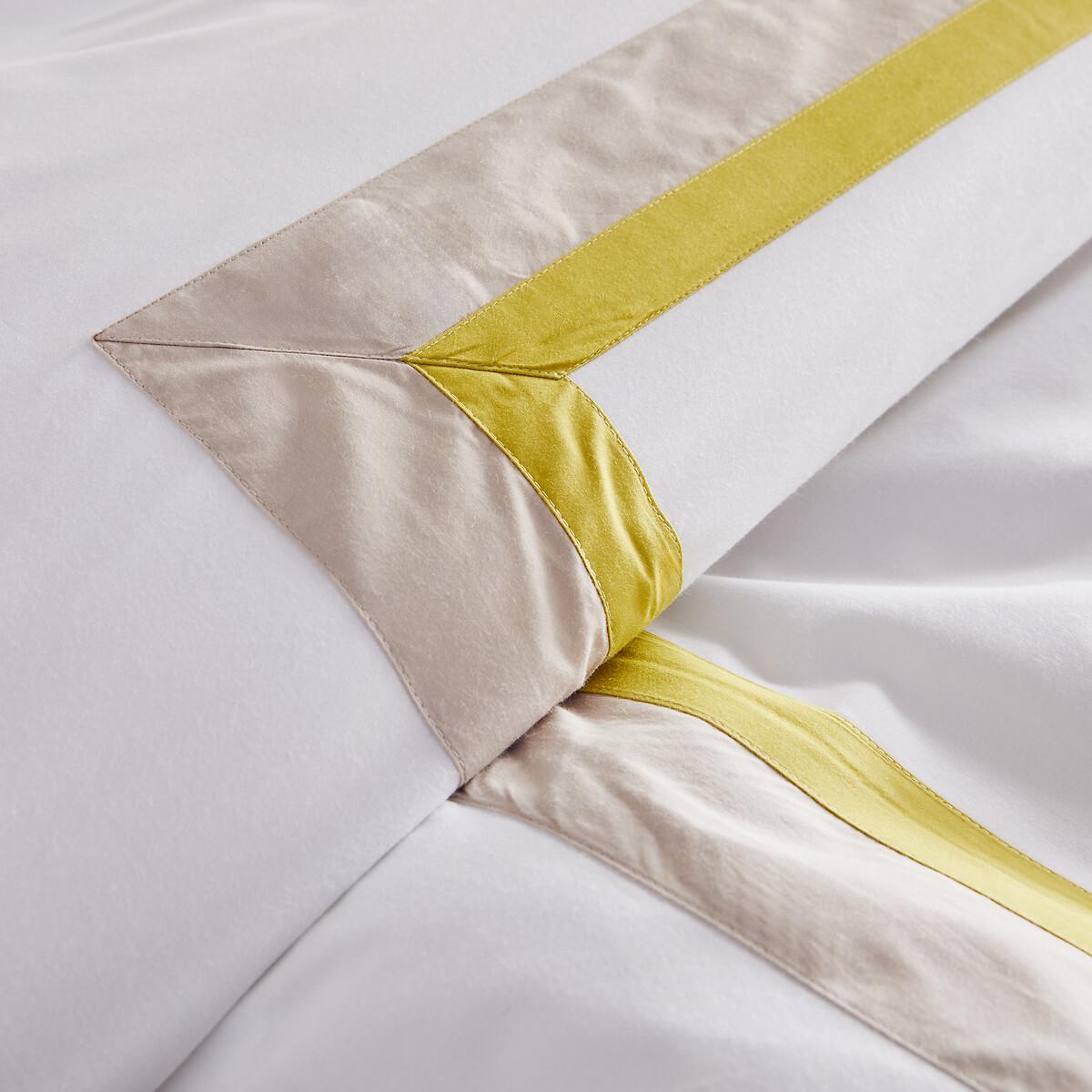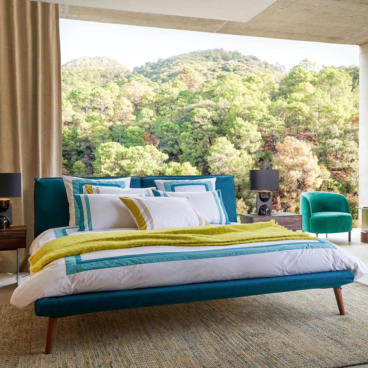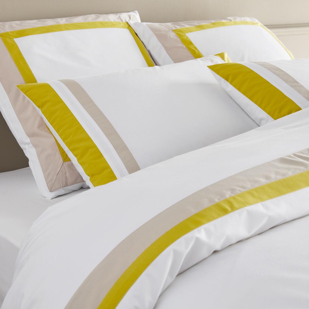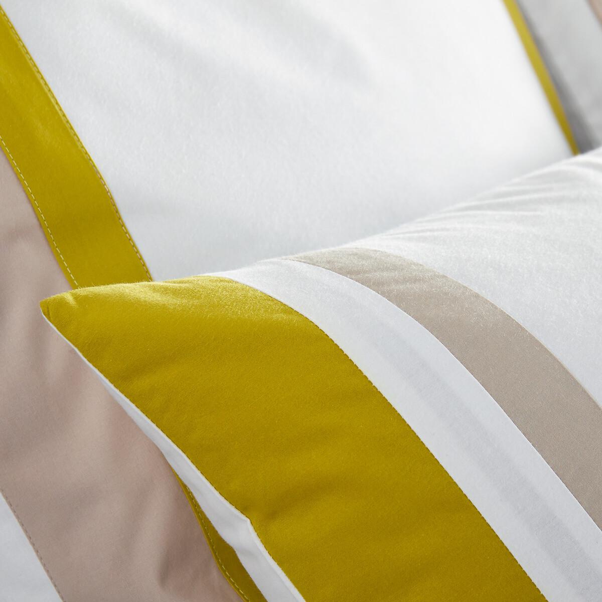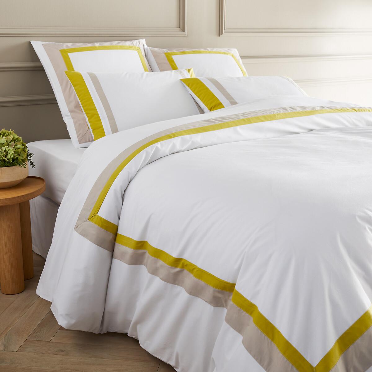 Bed linen with colourful lines. The Fraicheur duvet cover has the softness, texture and freshness of cotton percale. It is made of cotton from organic farming.. Cotton percale is a method of tightly weaving long, fine threads. Of superior quality, the percale offers great softness, suppleness and a perfect hold. Product Details • 100% cotton • Organic cotton • Cotton percale • Contrasting box design • Plain back • 200 thread count: a common indicator for measuring the quality of fabric is the number of threads per cm². Different sensations are made possible thanks to the weaving and the number of threads present. Indeed, an optimal number of threads makes the bed linen particularly soft. • Straight buttoned hem Care Advice Follow our care tips to maintain the quality of your laundry • Machine washable at 60°C • By washing your laundry at 40°C instead of 60°C, you limit energy consumption • Do not tumble dry • Iron at high temperature • Do not dry clean. Sizes • 140 x 200cm: Single • 200 x 200cm: Double • 240 x 220cm: King • 260 x 240cm: Super King • Made in Europe. • Cotton from organic farming. Organic farming does not use any chemicals, pesticides, insecticides or GMOs. Produced with minimal impact on biodiversity.