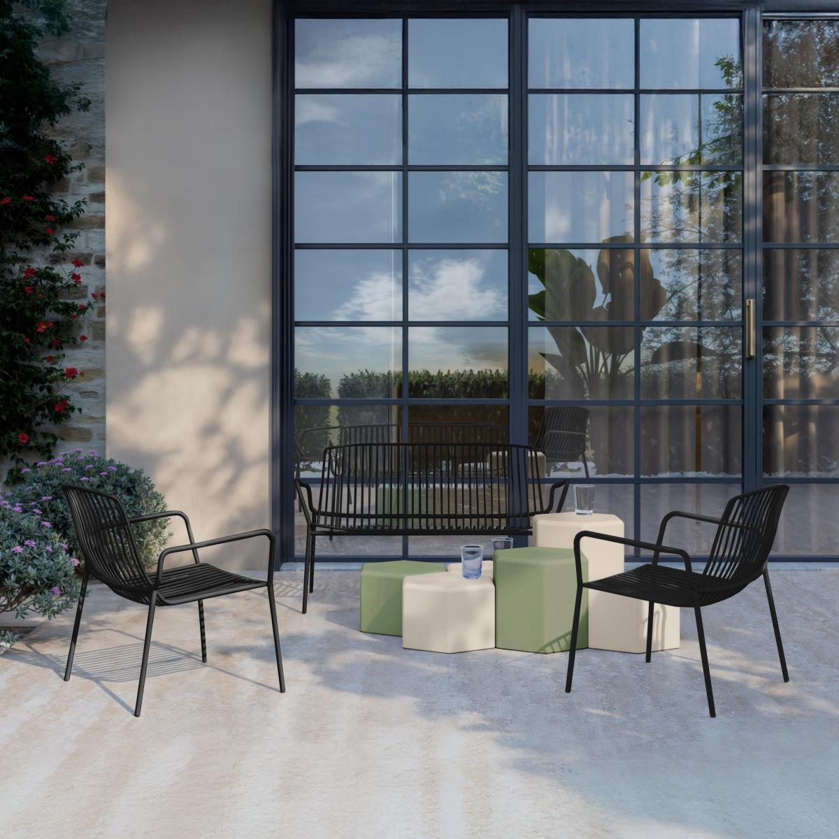- Weatherproof, Stackable, and Lightweight - Comfortable Ergonomic Shape - No assembly needed - Fits through any door All the outdoor seating you need for any patio, balcony or garden space. This outdoor furniture set includes 2 of our Frame Metal Lounge Chairs and our Frame 2 Seater Metal Lounge Bench. Our Frame collection seamlessly blends comfort and style with its streamlined design and lightweight build, making it perfect for sun-soaking and outdoor dining. Available in Black, Olive Green, Cream or Berry Red, this Lounge Chair and Bench Set pairs excellently with our Frame Tables for a cohesive outdoor set.
