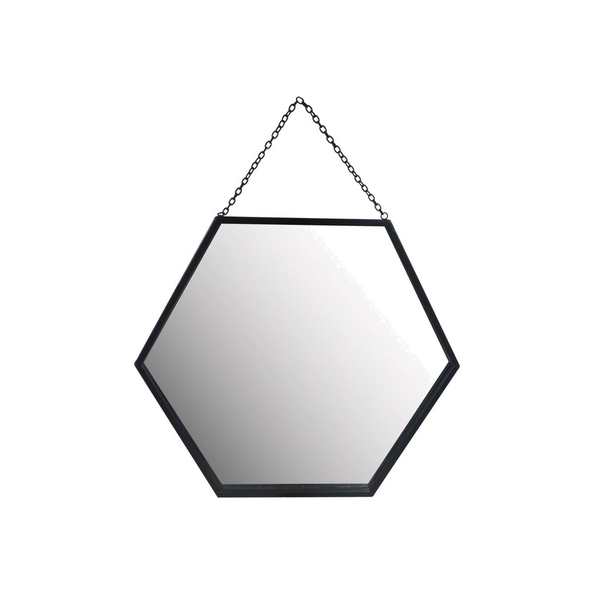 A contemporary choice for any bare wall, this Framed Black Hexagonal Mirror is sure to make your space feel open and elegant. The modern hexagonal design helps to open and reflect your space, making your living room, hallway, or bedroom feel larger and lighter. Featuring a sleek black frame and coordinating chain for an elegant and cohesive finish, this is easy to coordinate in any room.