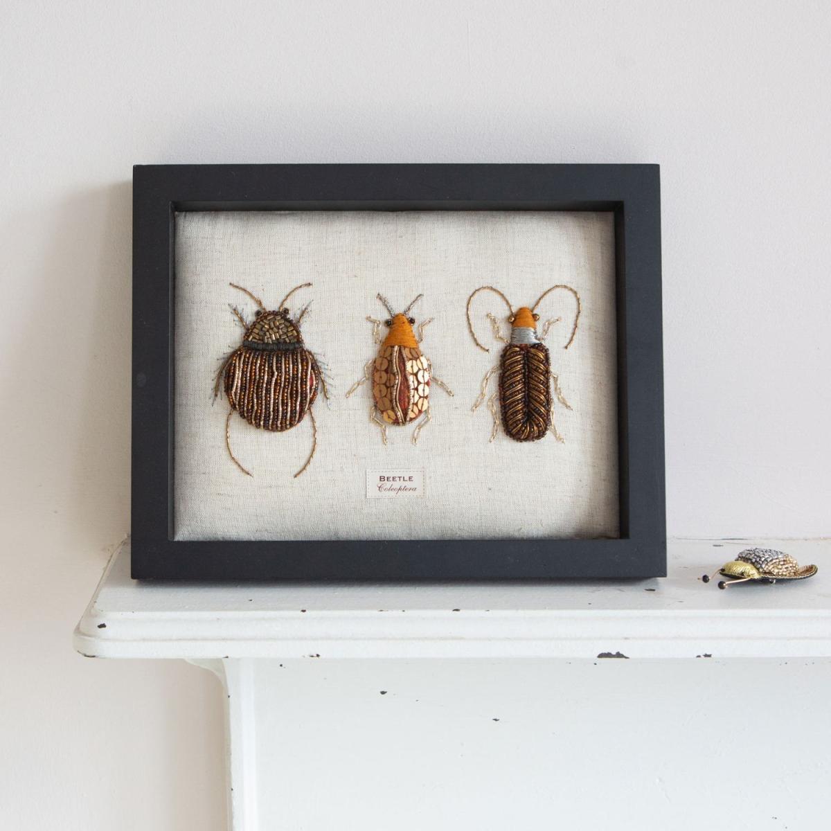 Framed Embroidered Beetle Trio