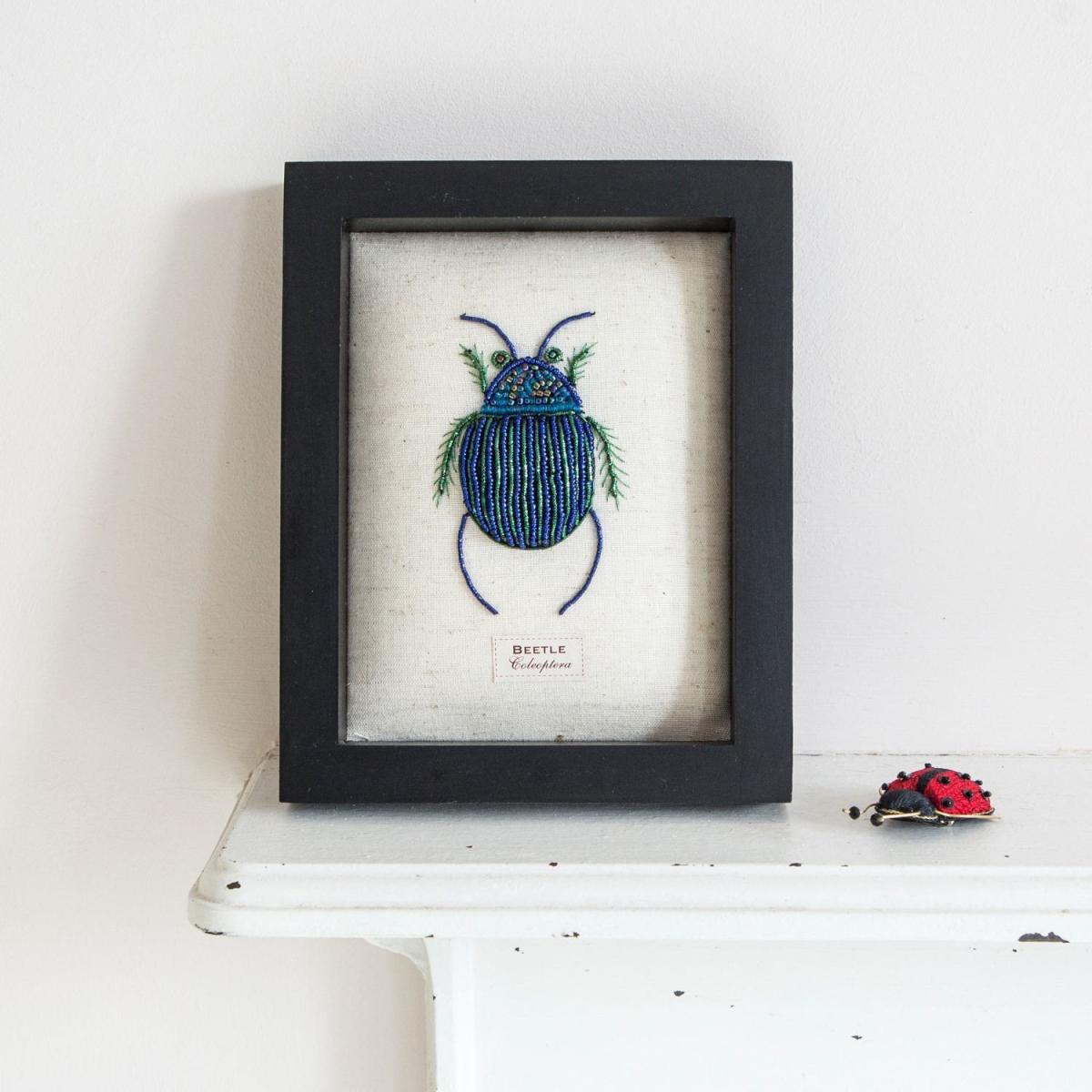 A wonderful accessory for eclectic interiors. This design has been skilfully hand-embroidered using metallic blue and green thread and finished with delicate beaded detailing. Displayed in a matte black wooden frame, this eye-catching piece is guaranteed to be a conversation starter. H20 x W16 x D2. 5cm. Made from glass beads and thread. Wooden frame. Please note these frames do not come with a glass cover. Features a single small hook for easy hanging. Due to the handmade nature of this product, colour and pattern may vary.