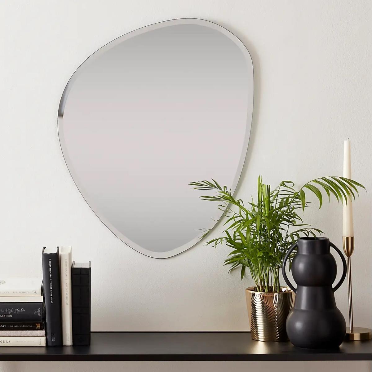 50x70cm Irregular Mirror Wall Decor Modern Frameless Asymmetric decorating Mirror For Wall Silver Beveled Decorative Mirror. This item is asymmetrical in shape, with a strong sense of design. The shape of the item is very personalized, it is the best choice for interior decoration. The mirror edge is carefully polished, modern, simple and luxurious. This product can be combined to achieve personalized decoration and make your wall more artistic. The backplane is made of solid wood, which enhances the product's robustness and durability. The wall mirror can be a stylish mirror for bathroom, living room,vanity mirror, bohemian wall decor, gypsy decoration style,mid-century wall decor, bedroom mirror, decorative mirror in office and shop. The asymmetric mirror is easy to install. There are four hanger on the back of the mirror so you can hang it on the wall securely and easily.