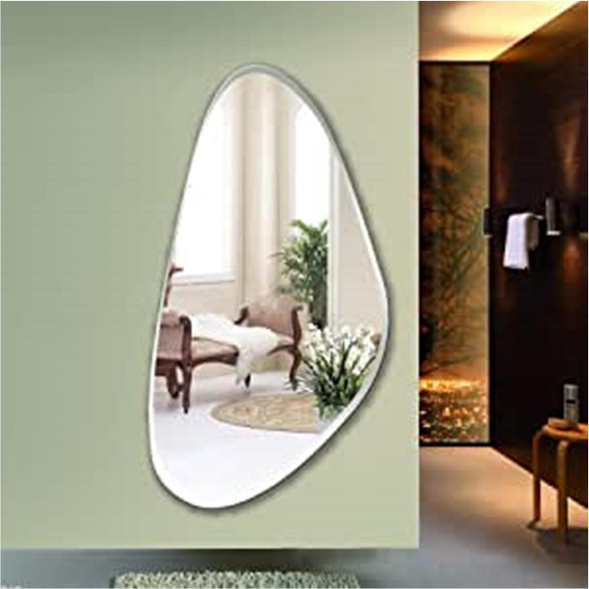 Irregular Mirror Wall Décor. Modern Frameless Asymmetric Mirror For the Wall. This item is asymmetrical in shape, with a strong sense of design. The mirror edge is carefully polished, modern, simple and luxurious. The backplane is made of solid wood, which enhances the product's robustness and durability. The wall mirror can be a stylish mirror for any room. The asymmetric mirror is easy to install. There are four hangers on the back of the mirror so you can hang it on the wall securely and easily.