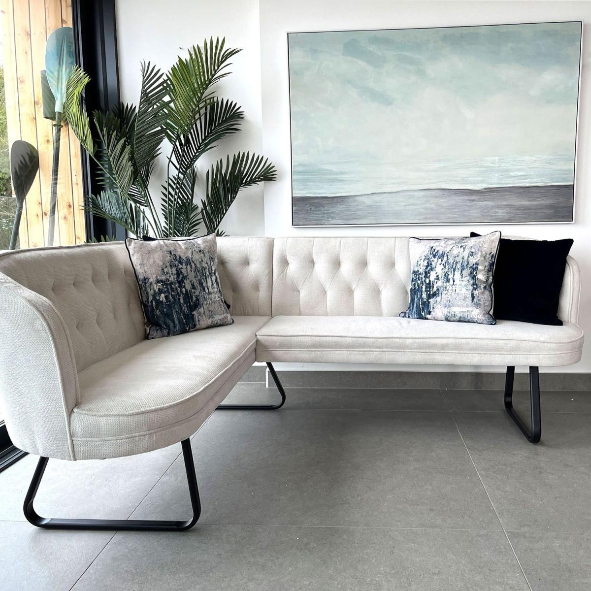 The Frampton Corner Dining Bench is the contemporary solution to family dining. With stylish stitched back detailing and three curved metal legs, this modern bench puts both comfort and style at the forefront of the design. With soft fabric and slightly curved edges, this luxurious corner seating helps to make you feel embraced and welcomed as you sit and dine. Choose from the other Frampton seating options to create a cohesive dining room with enough space for the whole family or additional guests!.