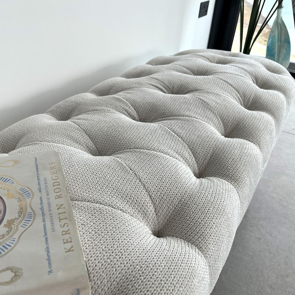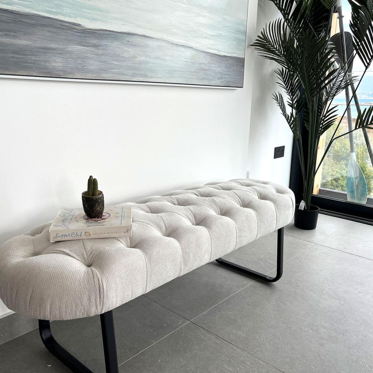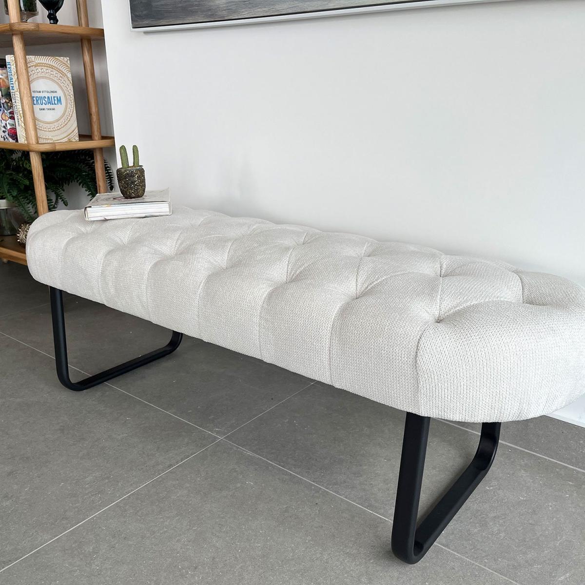 The Frampton Dining Bench is the contemporary solution to family dining. With stylish stitched detailing on the soft fabric seat and curved metal legs, this modern bench puts both comfort and style at the forefront of the design. Choose from the other Frampton seating options to create a cohesive dining room, and take advantage of the versatility of this bench by using it in your hallway until needed in the dining room for additional seating.