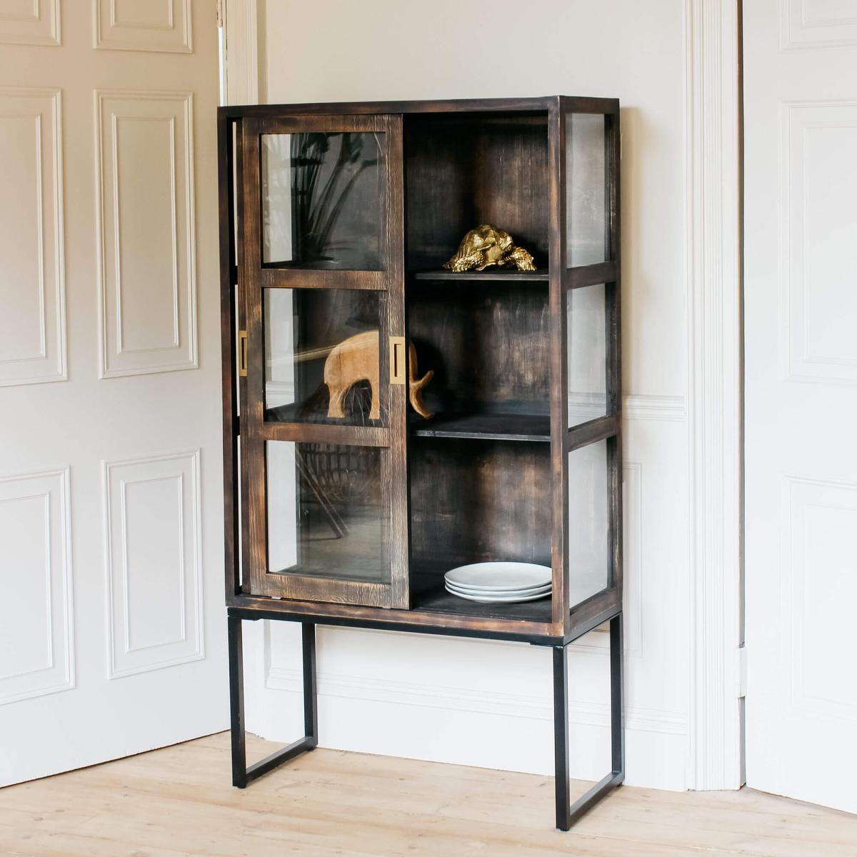 A sleek iron cabinet with dark wood panel detailing and finished with brass handles. With clear sliding glass doors, perfect for curators to display their collections. H161 x W85 x D37. 5cm. Featuring sliding clear glass doors and brass coloured handles. Made of pine wood, MDF, fir wood and iron.