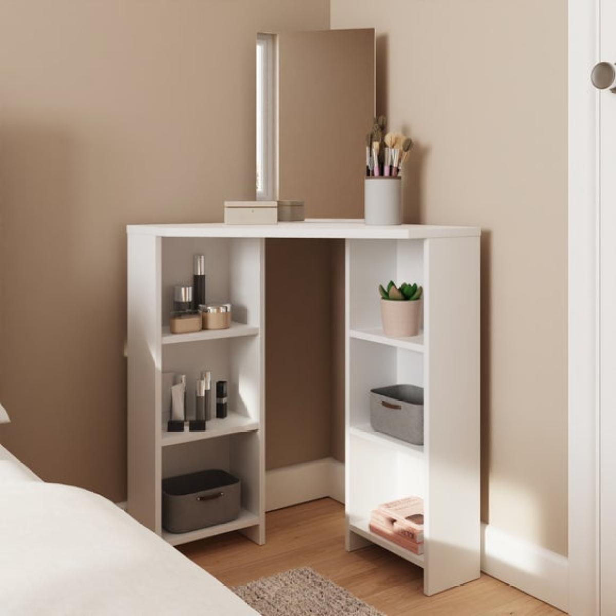 * Space-saving corner design * Large mirror for everyday use * Six shelves for organised storage * Two open side compartments The Frances Corner Dressing Table with Mirror is designed to make the most of your space without compromising on storage. Its clever corner layout fits neatly into unused areas, giving you a dedicated spot for your daily routine. With six shelves and two open side compartments, there’s plenty of room to keep makeup, skincare and accessories organised. The wide tabletop offers space for your essentials, while the large mirror helps you get ready with ease. Finished in a clean white tone, it works well in modern bedrooms. A smart solution for compact spaces.