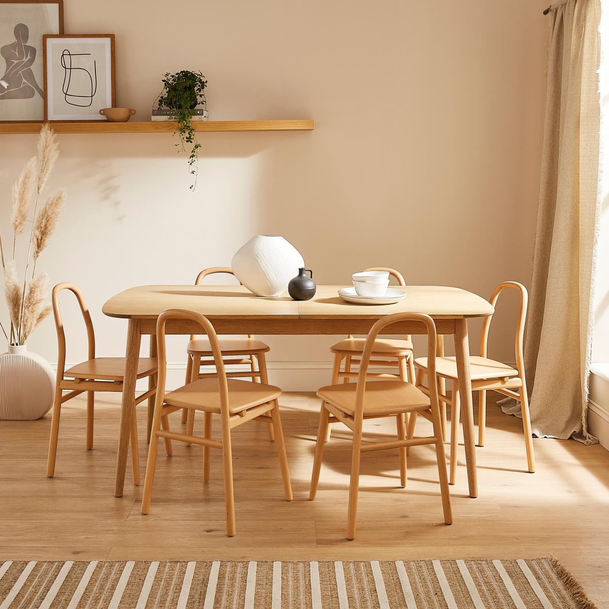 I’m a big fan of the Frances chair in oak for its pared-back silhouette and warm grain. Its simple, curved back and slim legs make it equally at home in Scandi, Japandi or modern farmhouse schemes, and the light oak finish helps keep smaller spaces feeling open. For styling, mix it with a stone-topped or live-edge table and layer in natural textures - think a woven seat pad or a soft linen cushion. You can also break up a uniform set by swapping every third chair for a darker timber or painted option. In a kitchen nook, tuck one at a small console as a handy perch, then slide it under the worktop when not in use.