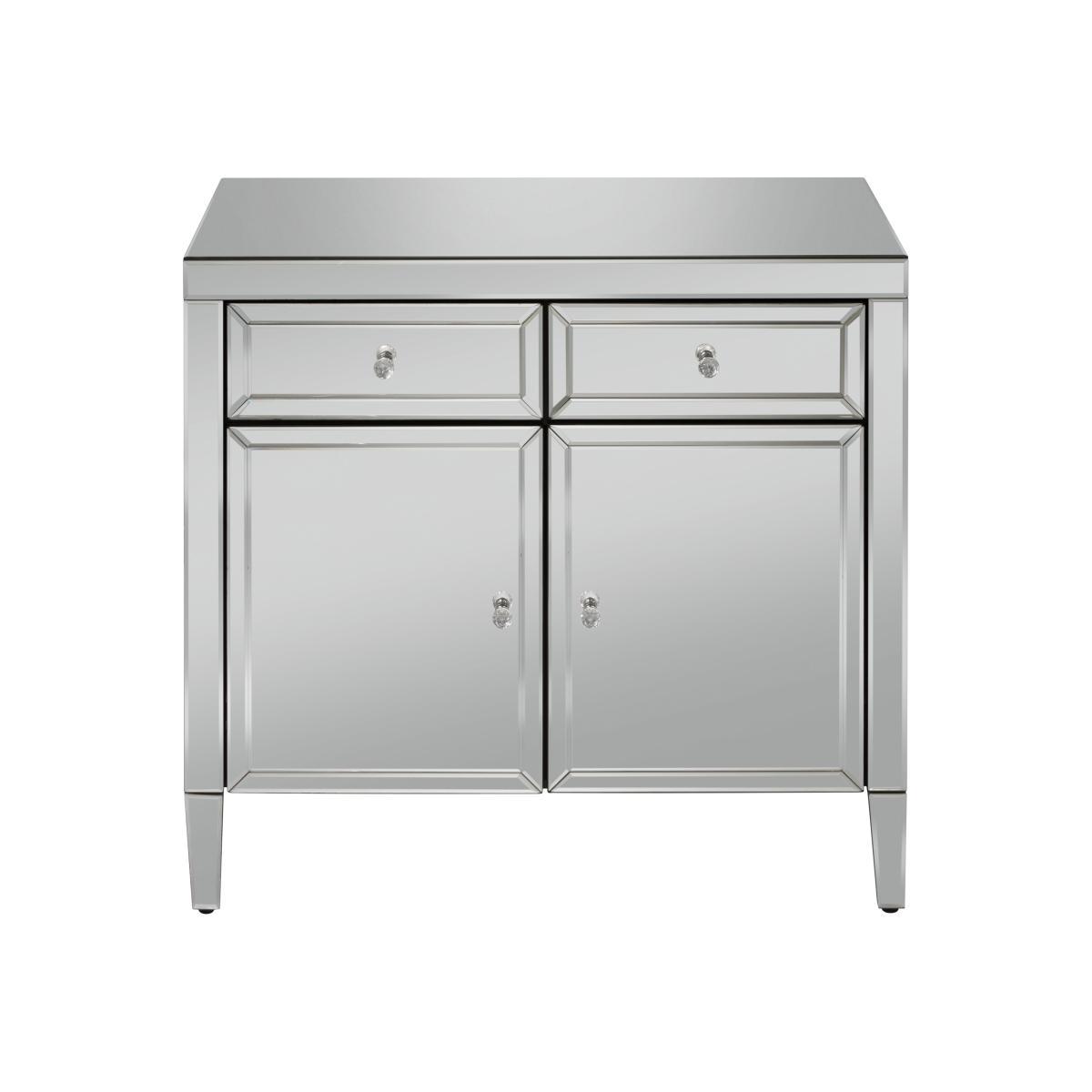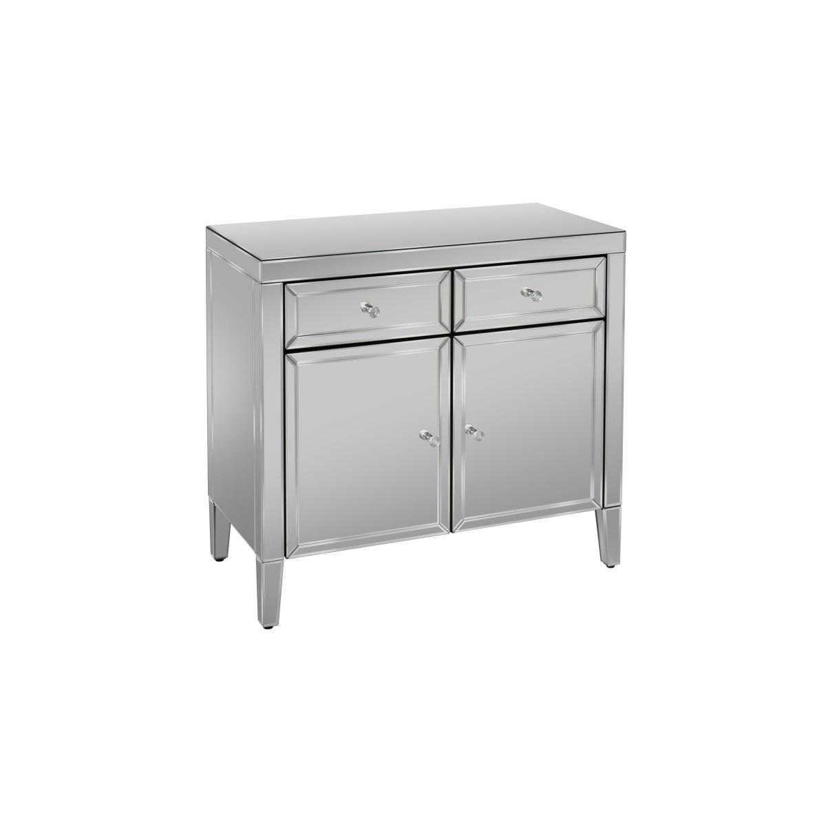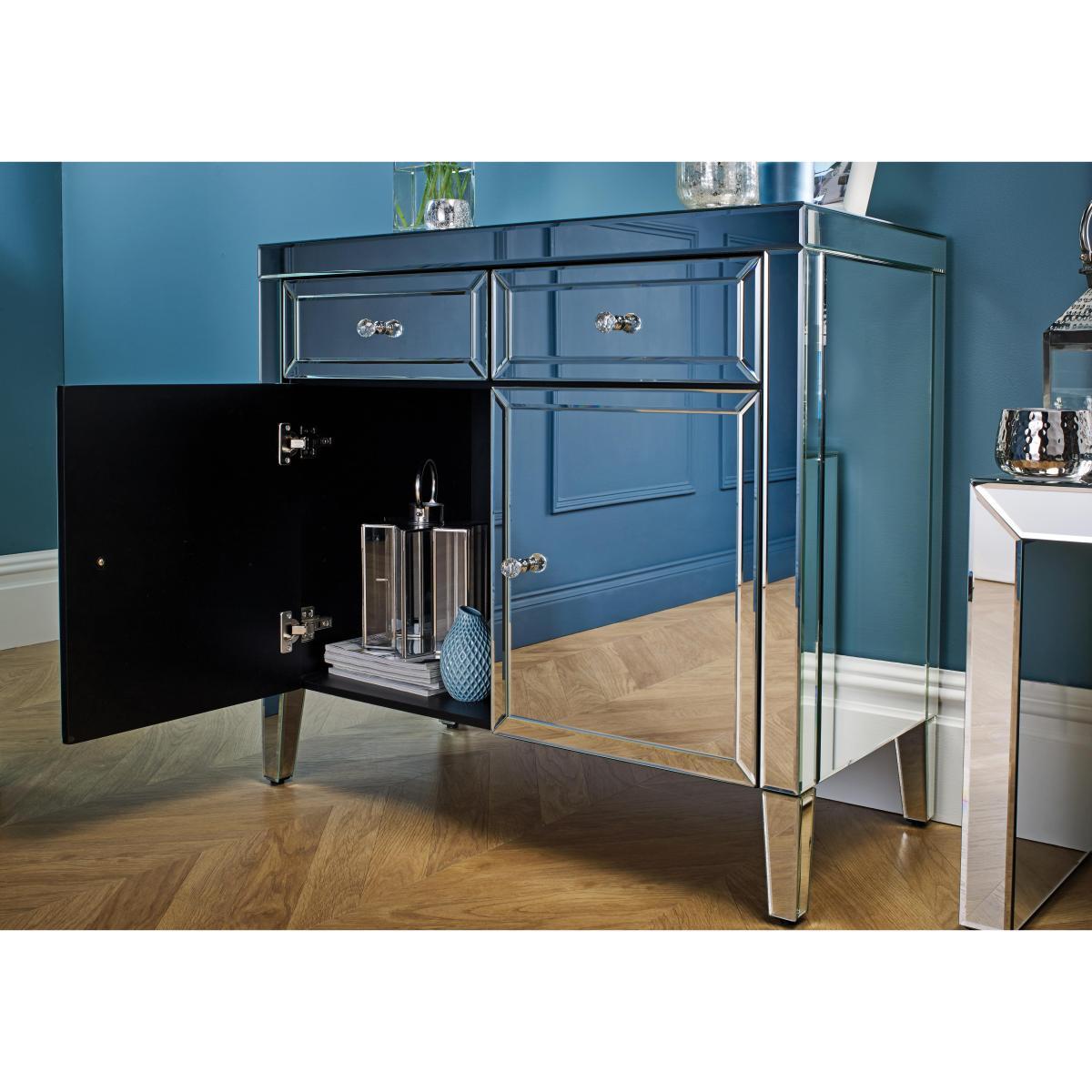 Inspired by Hollywood glamour, the Francesca range of bedroom furniture is truly unique. With gleaming mirrored surfaces, drawers with bevelled edges and mock crystal drawer handles, every cabinet, chest of drawers and dressing table reflects light and space as well as beauty and charm. Pieces arrive fully assembled, so it’s even easier to bring home Francesca’s stunning style. The Francesca 2 Door and 2 Drawer Sideboard steals the show with its luxurious Hollywood-inspired mirrored design and stunning bevelled edges. A contemporary combination of glamour and elegant storage. Why you'll love it. Mirrored design shining with Hollywood-style glamour. Sits elegantly on sleek tapered legs. Bevelled edges and dramatic black interior. Mirrored finish that amplifies light. Crystal-effect handles. Practical yet elegant storage solution. What you need to know. Delivered fully assembled. MDF and glass construction. Hinged doors. Care for glass by wiping with a damp, microfibre cloth to remove finger marks. Only use furniture polish and cleaning materials suitable for glass. Avoid abrasive cleaners. Do not place heavy items on glass. While glass is water resistant, using coasters is recommended. Glass can scratch, so take care when placing items on a glass surface. For deep scratches, seek professional advice. Part of The Francesca range. WARNING! Furniture can tip over unexpectedly and cause injury. This item shall be fixed to a wall using the anti-tip kit provided with the furniture. Be sure to use the correct wall fixings suitable for the walls in your home.