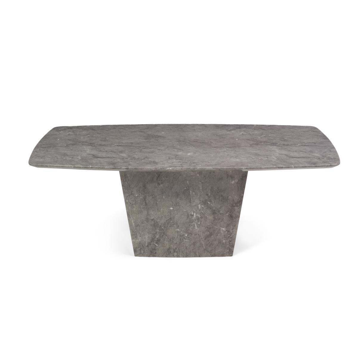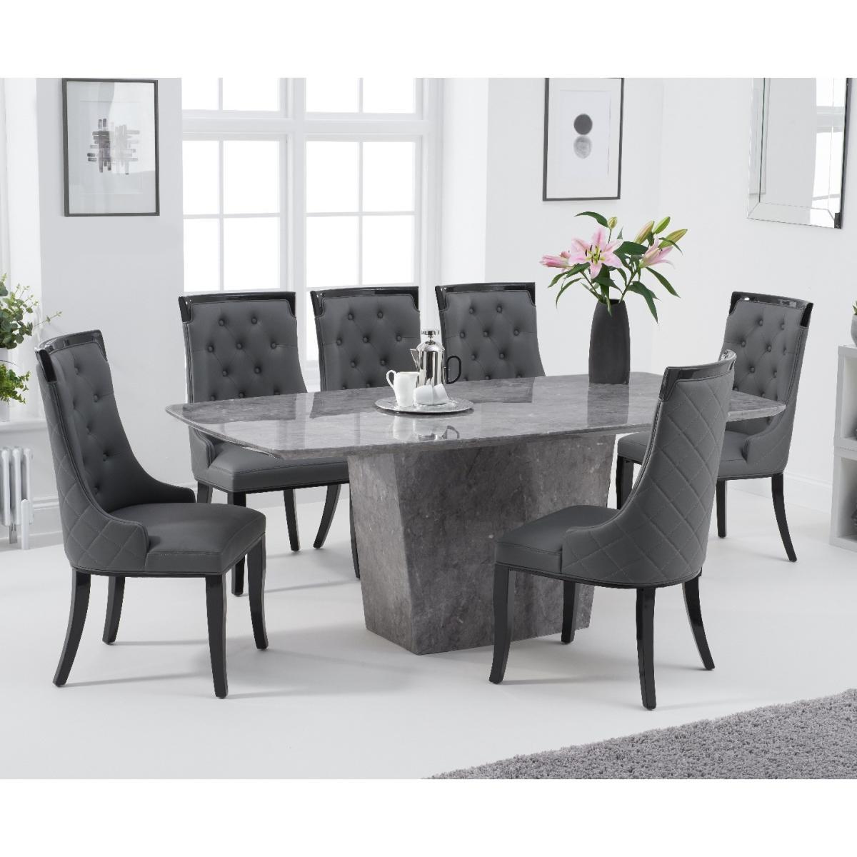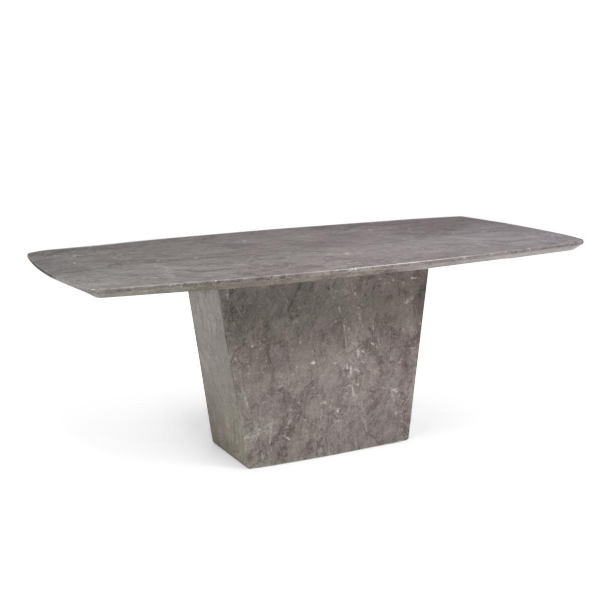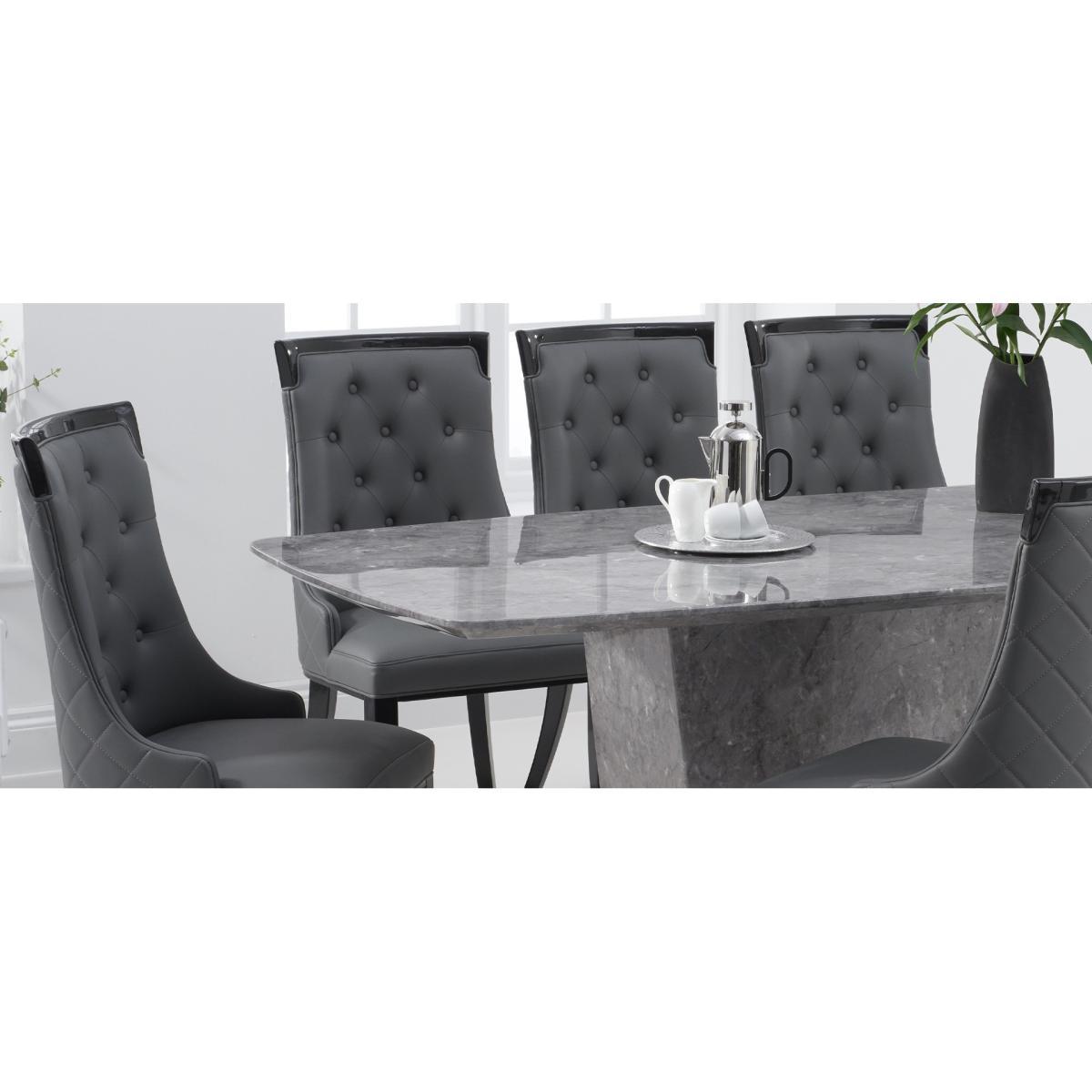 Clean, minimal and angular in design, the gorgeous grey-toned Marble Francesca Table is a luxurious and contemporary piece. Sleek and statement in its large 200cm length, with a glossy marble table top with sharp tapered edges, and a sturdy pedestal base. Ideal for luxurious dining in larger family homes. Styled as a striking set with the faux leather Angelica Chairs, with their vintage-look design, faux leather upholstery, button accents and dark wood frames. Minimal but striking, bold and timeless in design. Marble is robust and durable. Large and luxurious for bigger, stylish dining spaces. Faux leather is luxe and easy to wipe clean. Also available: Francesca 200cm Light Grey Marble Dining Table with Freya Chairs, Verbier Chairs, Raphael Chairs, Knightsbridge Chairs and Hampstead Chairs Additional Measurements:Underside of Table Top to Floor Height:72.5cm Pedestal Length:68.5cm Pedestal Depth:35cm.