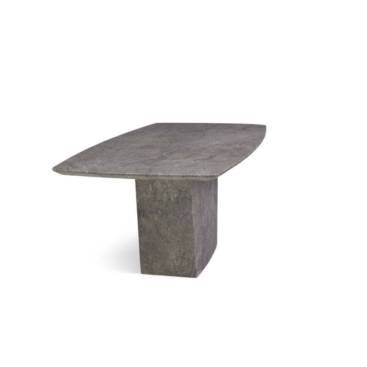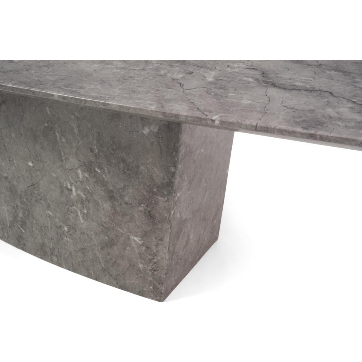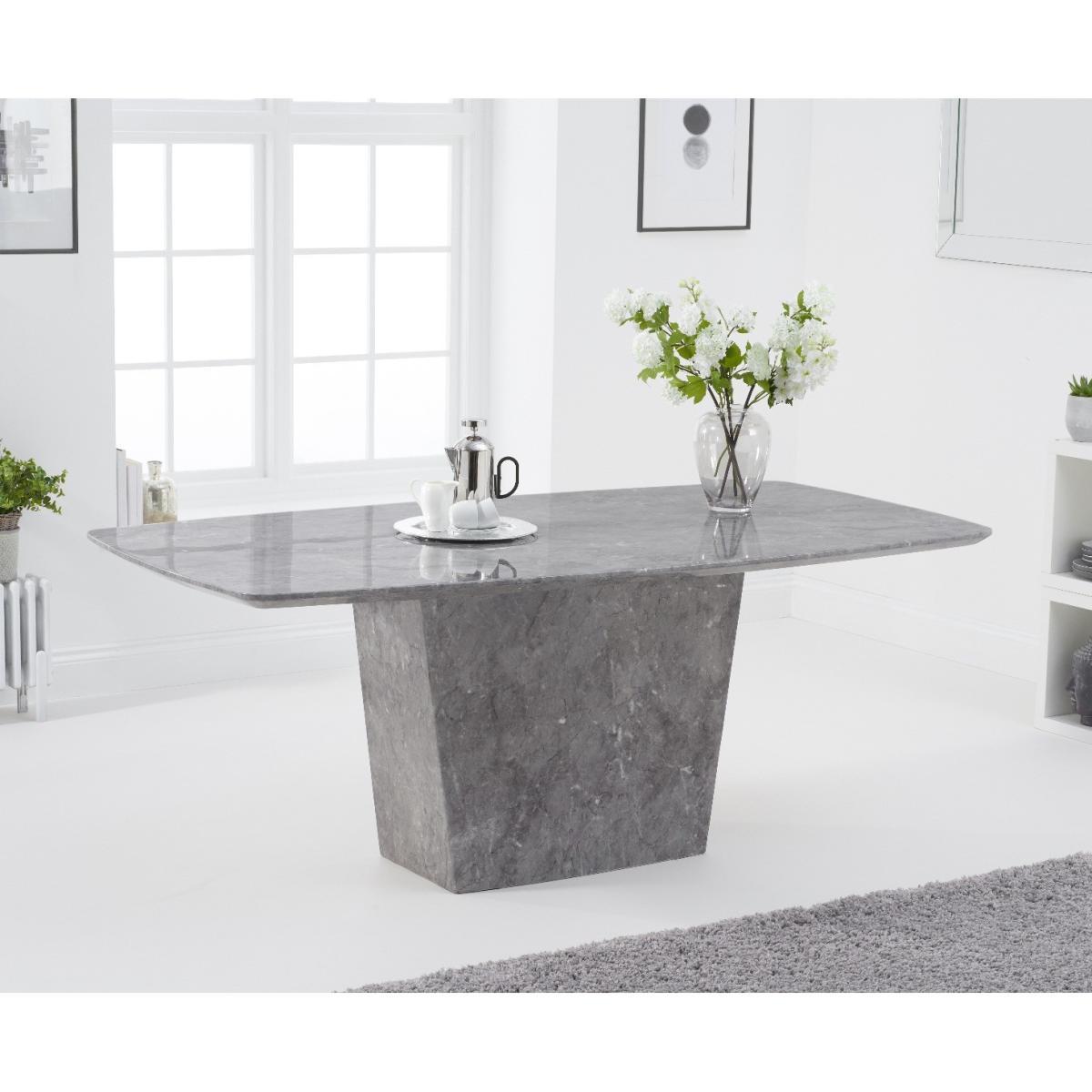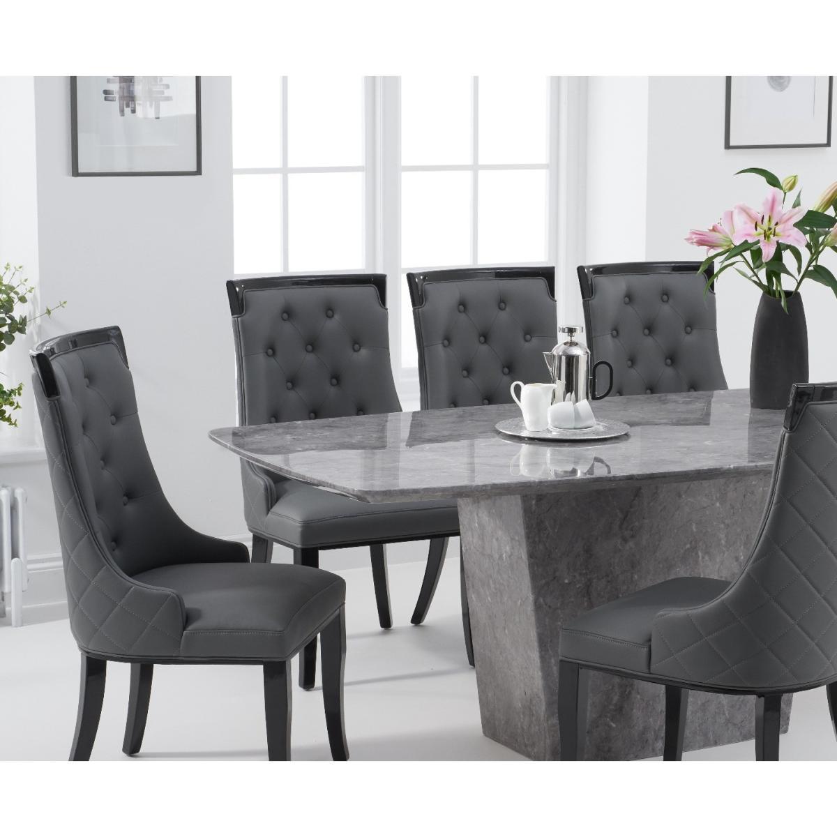 Clean, minimal and angular in design, the gorgeous grey-toned Marble Francesca Table is a luxurious and contemporary piece. Sleek and statement in its large 200cm length, with a glossy marble table top with sharp tapered edges, and a sturdy pedestal base. Ideal for luxurious dining in larger family homes. Styled as a striking set with the faux leather Angelica Chairs, with their vintage-look design, faux leather upholstery, button accents and dark wood frames. Minimal but striking, bold and timeless in design. Marble is robust and durable. Large and luxurious for bigger, stylish dining spaces. Faux leather is luxe and easy to wipe clean. Also available: Francesca 200cm Light Grey Marble Dining Table with Freya Chairs, Verbier Chairs, Raphael Chairs, Knightsbridge Chairs and Hampstead Chairs Additional Measurements:Underside of Table Top to Floor Height:72.5cm Pedestal Length:68.5cm Pedestal Depth:35cm.