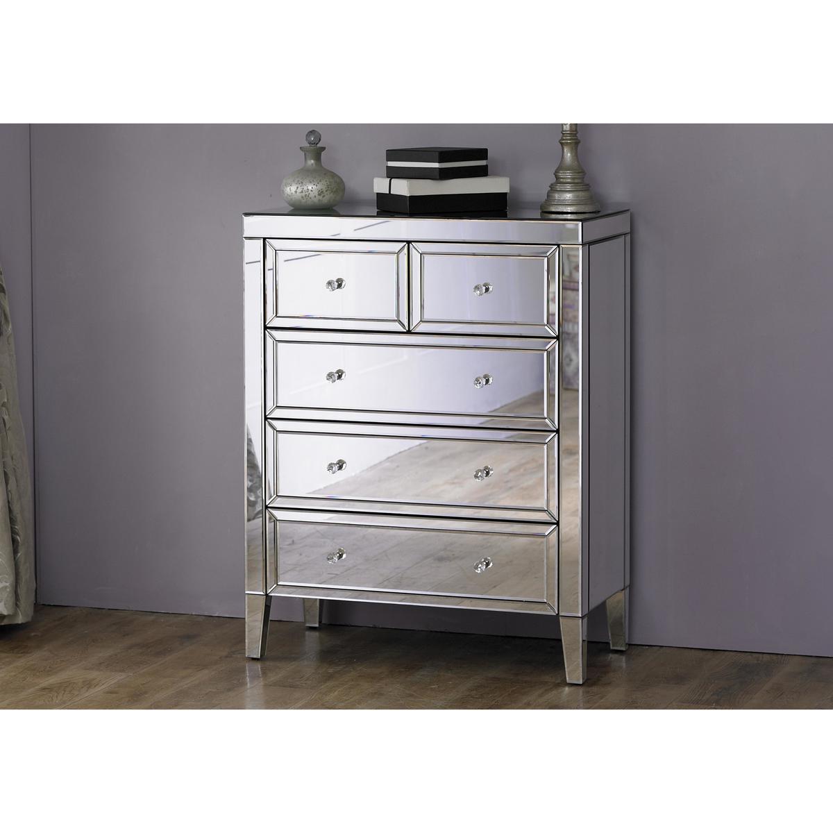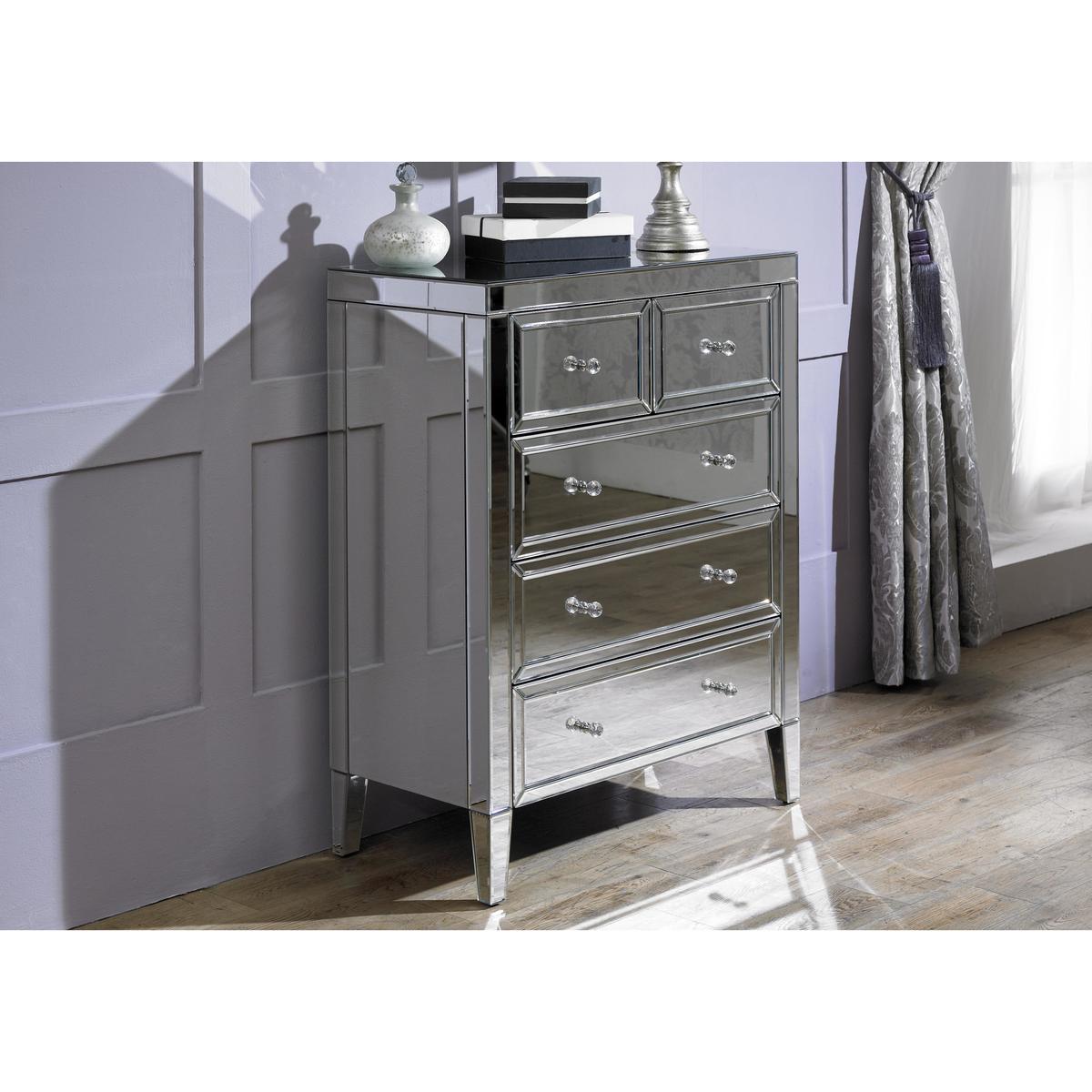 Mirrored chest of drawers has Hollywood- style glamour 3 full- width lower drawers and 2 smaller upper drawers Drawers with bevelled edges and dramatic black interiors Mock crystal drawer handles Sits on elegant tapered legs Arrives fully assembled A stunning way to bring light and space to your bedroom WARNING! Furniture can tip over unexpectedly and cause injury. This item must be fixed to a wall using the anti- tip kit provided. Be sure to use the correct wall fixings suitable for the walls in your home. Furniture Village is not able to fix anti- tip devices for you. Seek professional advice if you are unsure.