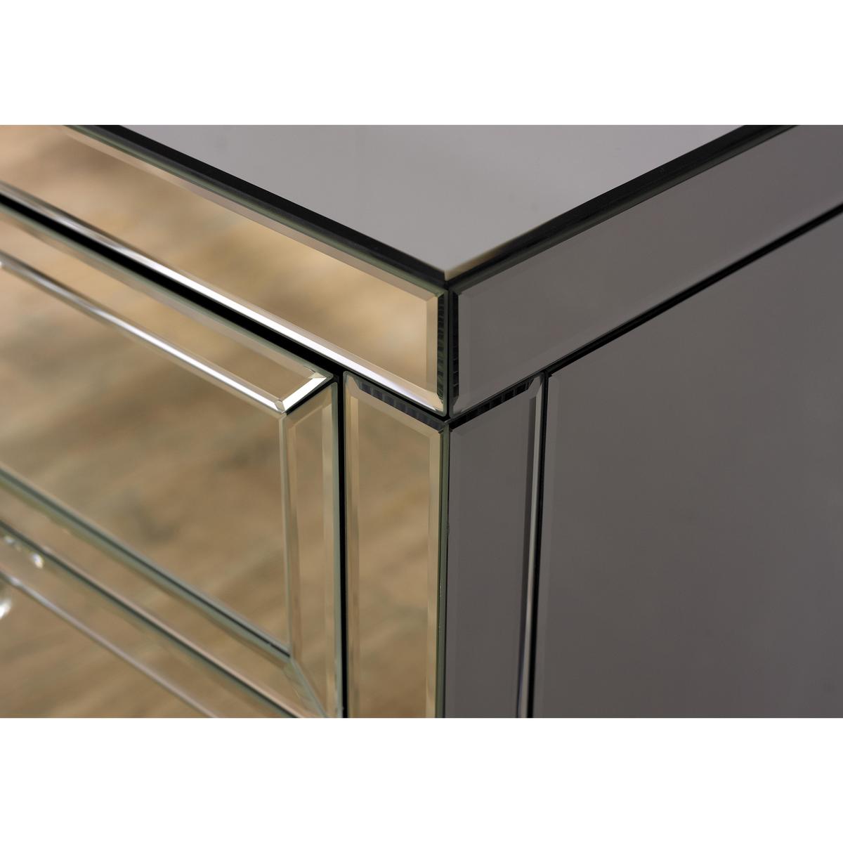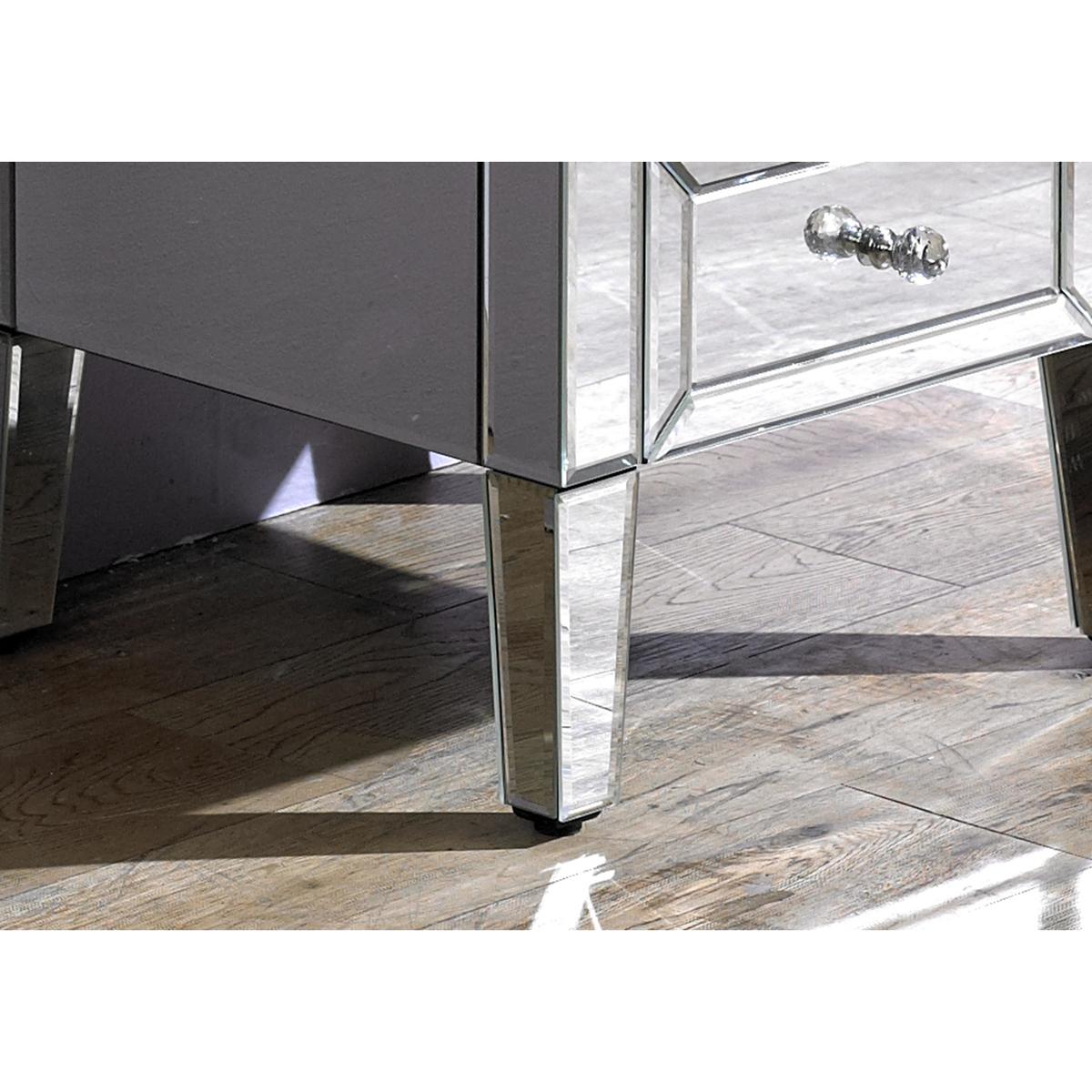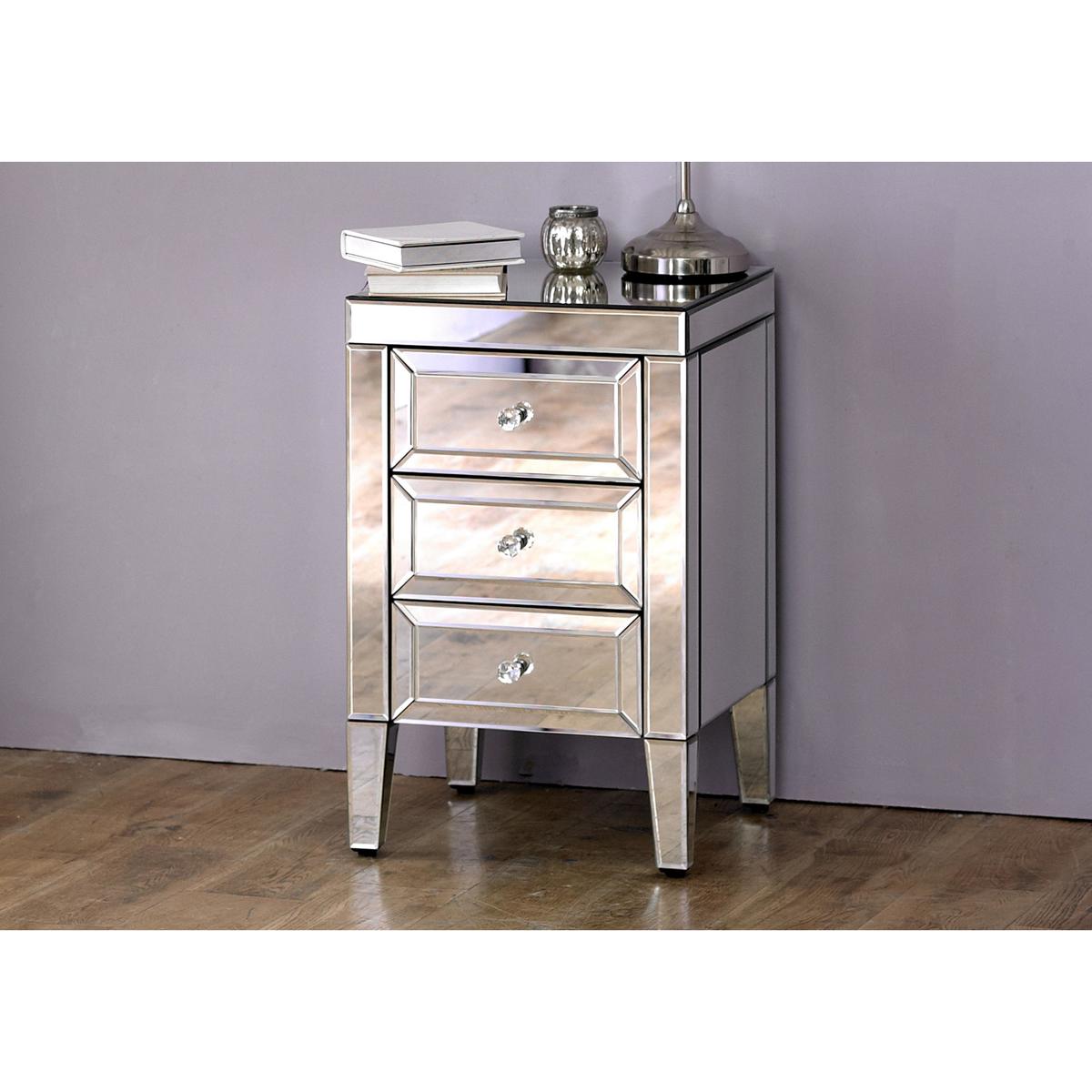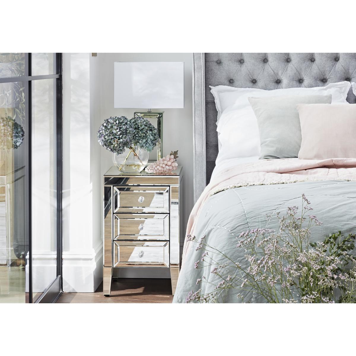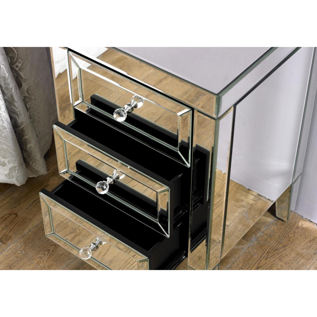 Inspired by Hollywood glamour, the Francesca range of bedroom furniture is truly unique. With gleaming mirrored surfaces, drawers with bevelled edges and mock crystal drawer handles, every cabinet, chest of drawers and dressing table reflects light and space as well as beauty and charm. Pieces arrive fully assembled, so it’s even easier to bring home Francesca’s stunning style. Mirrored bedside cabinet shines with Hollywood-style glamour. 3 drawers with bevelled edges and dramatic black interiors. Mock crystal drawer handles. Sits on elegant tapered legs. Arrives fully assembled. A stunning way to bring light and space to your bedroom. WARNING!. Furniture can tip over unexpectedly and cause injury. This item shall be fixed to a wall using the anti-tip kit provided with the furniture. Be sure to use the correct wall fixings suitable for the walls in your home.