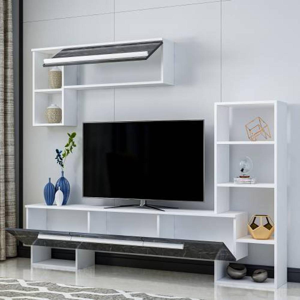 I love this one for its striking black marble effect combined with crisp white, making it a versatile statement piece. It works particularly well in modern, minimalist, or contemporary interiors, adding a touch of sophistication without overwhelming the space. Practical styling tips include keeping the top clear for a sleek look or adding a few carefully chosen accessories-like minimalist vases or sculpture accents- to avoid clutter. Its open shelving offers great opportunities for organising media gear, while the closed sections help keep the area tidy. Overall, it’s a smart choice for those wanting a bold, stylish focal point in their living room.